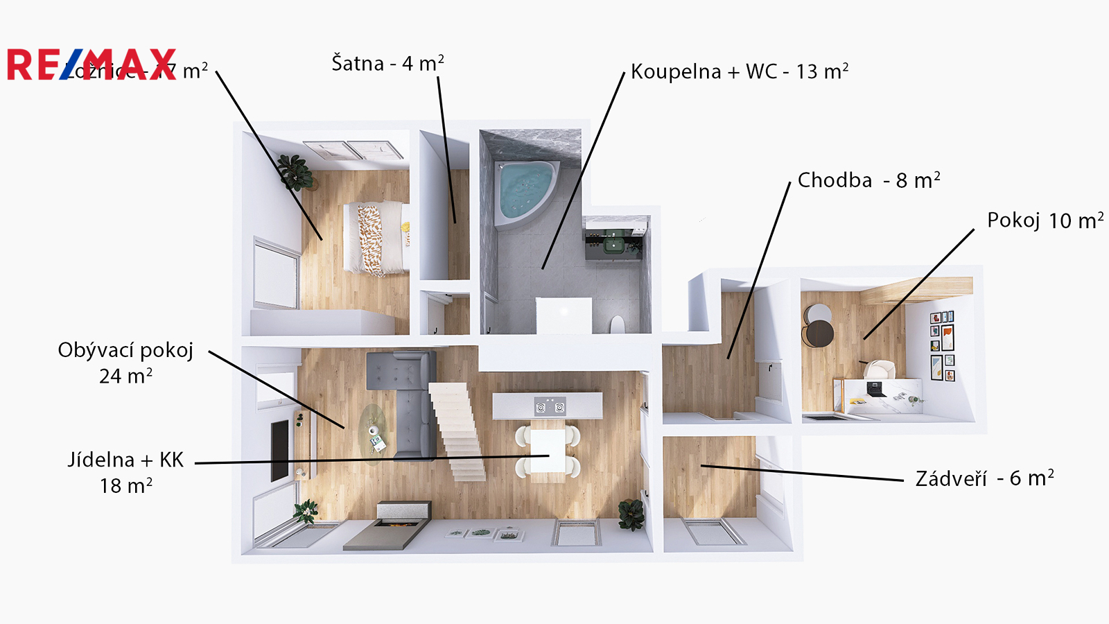 Dispozice: 5+kk, koupelna, 3 šatny (z toho jedna připravená jako druhá koupelna)