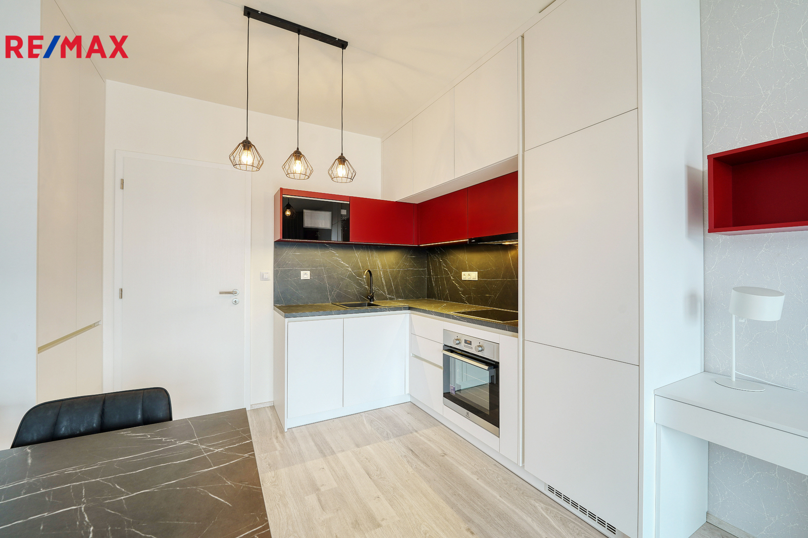 Tento byt je kompletně vybaven a připraven k okamžitému nastěhování, navíc veškeré vybavení bytu a jeho atmosféra je naprosto netknutá, jelikož v bytě zatím ještě nikdo nebydlel. Velmi kvalitní vybavení je v designovém provedení "na míru" od designového studia Arbyd. Je navrženo s množstvím praktických úložných prostor včetně značkových zabudovaných spotřebičů a vše je v bytě uspořádáno tak, aby byl využit každý cm². Podlaha - Dub Corton bílý; Obklad – odstín obkladu světle béžový a spárovací hmota jasmínová; Dlažba světle béžová a spárovací hmota jasmínová.