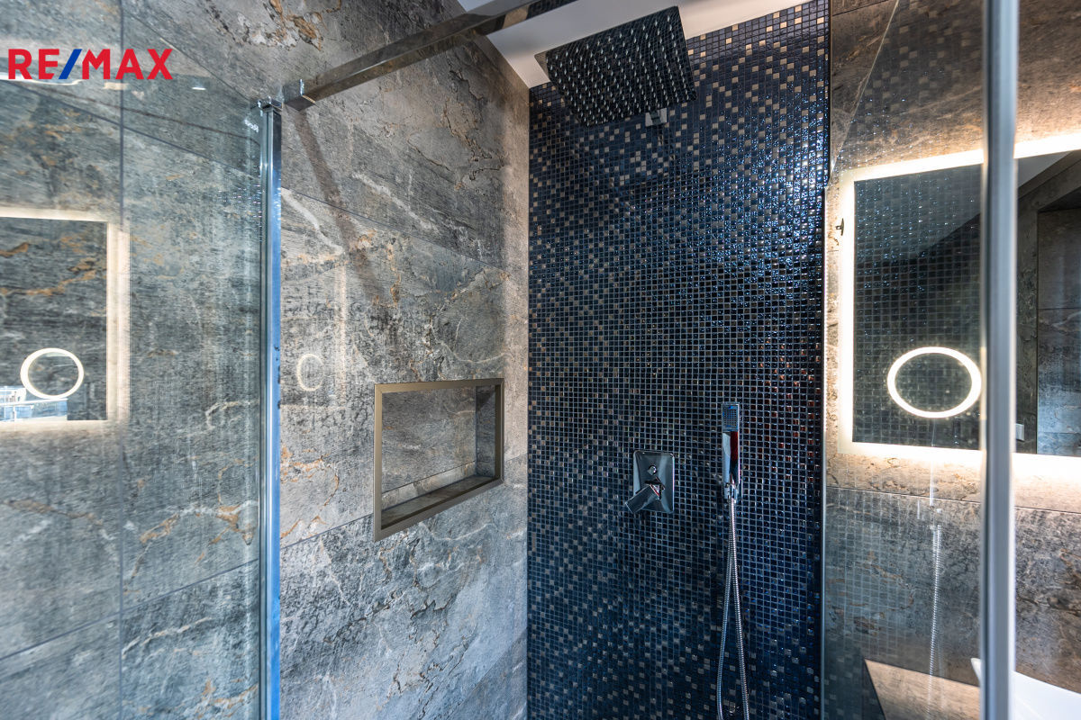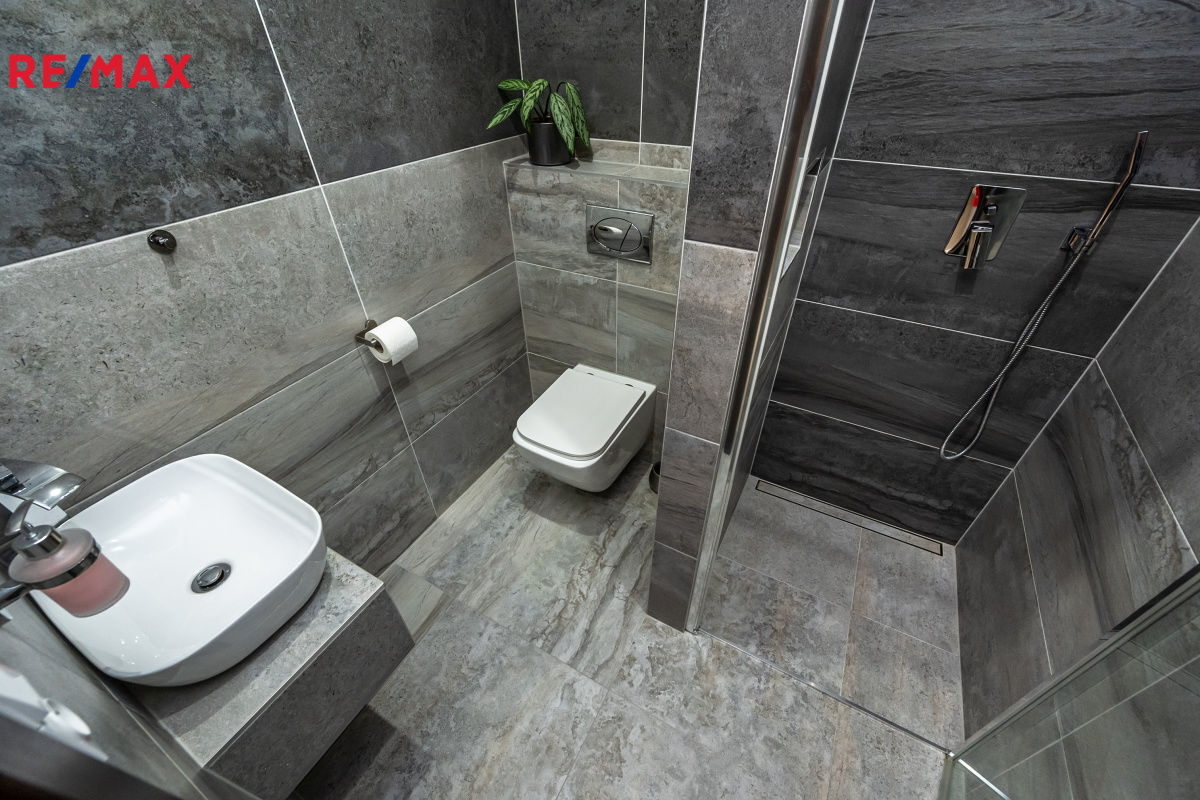 Koupelna má vanu, sprchový kout, umyvadlo. WC samostatné, umyvadlo a také prostor na pračku a sušičku.