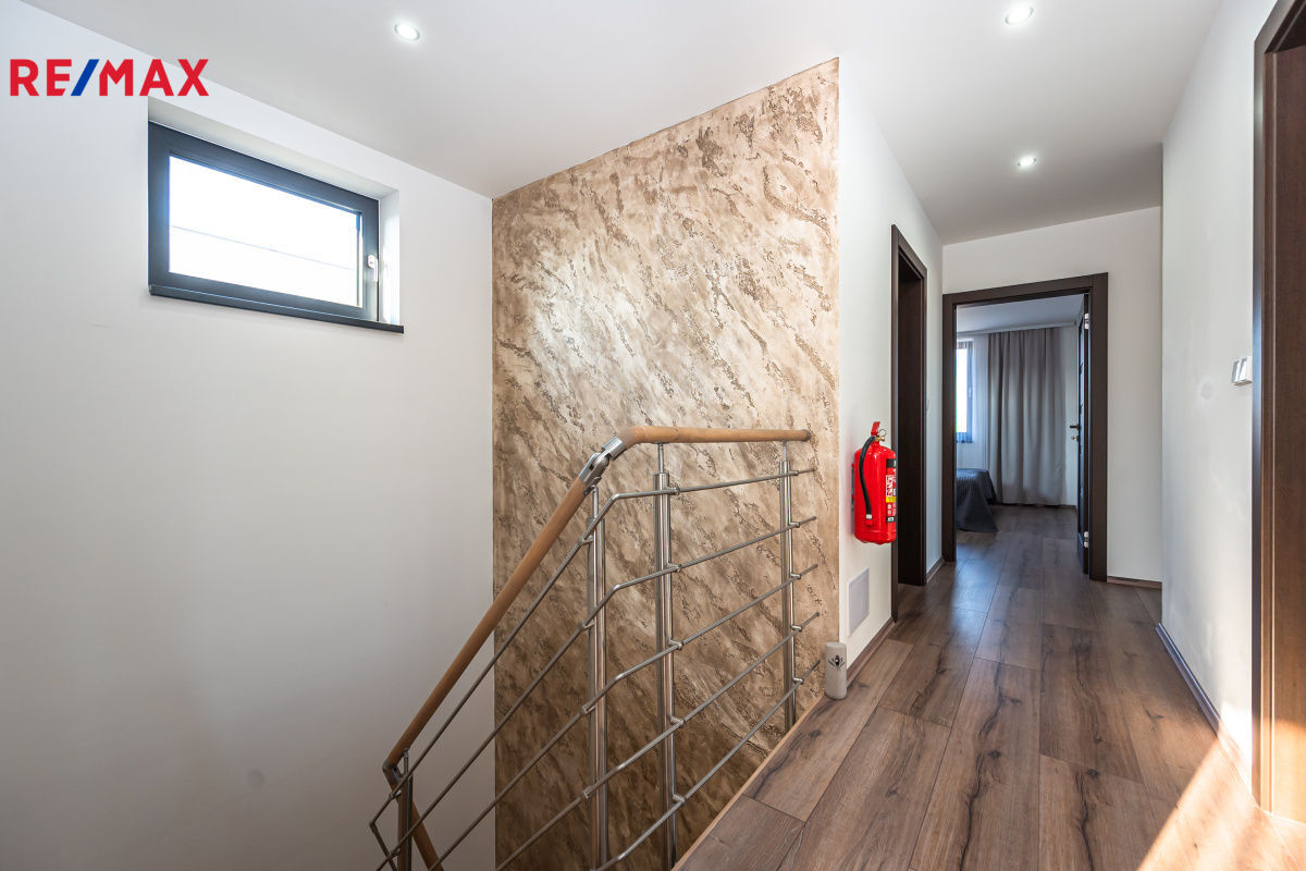 V prvním patře jsou tři neprůchozí ložnice, ze dvou ložnic je vstup na terasu. Terasa ma 31,4 m2.