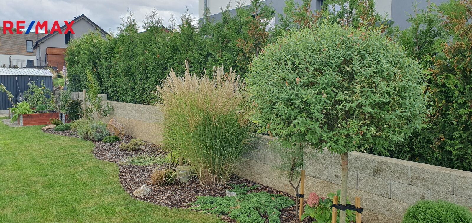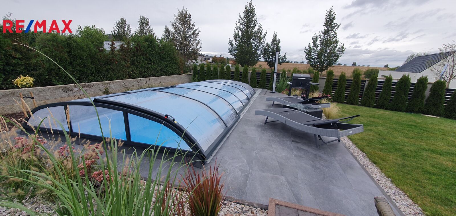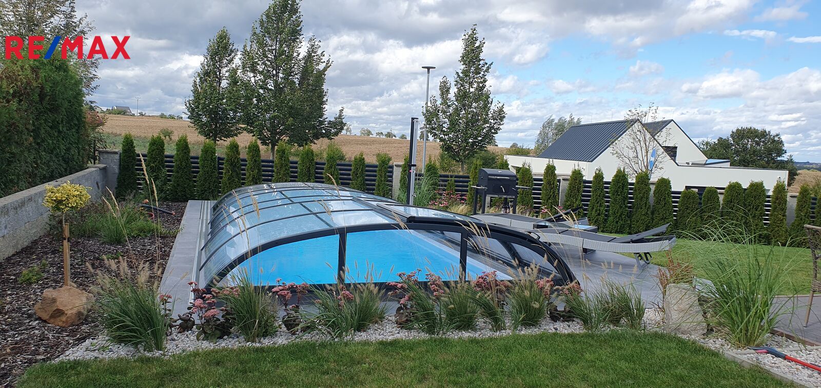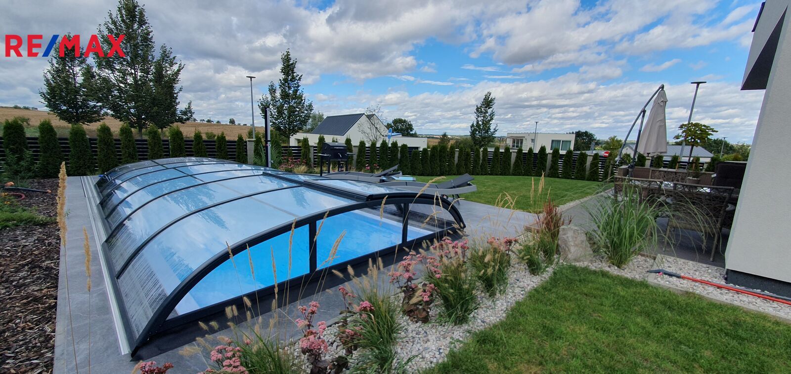 Okolo domu je krásna udržovaná zahrada na které se nachází bazén se slanou vodou a zastřešením. Vedle domu je zahradní plechový domek na nářadí a sekačku.