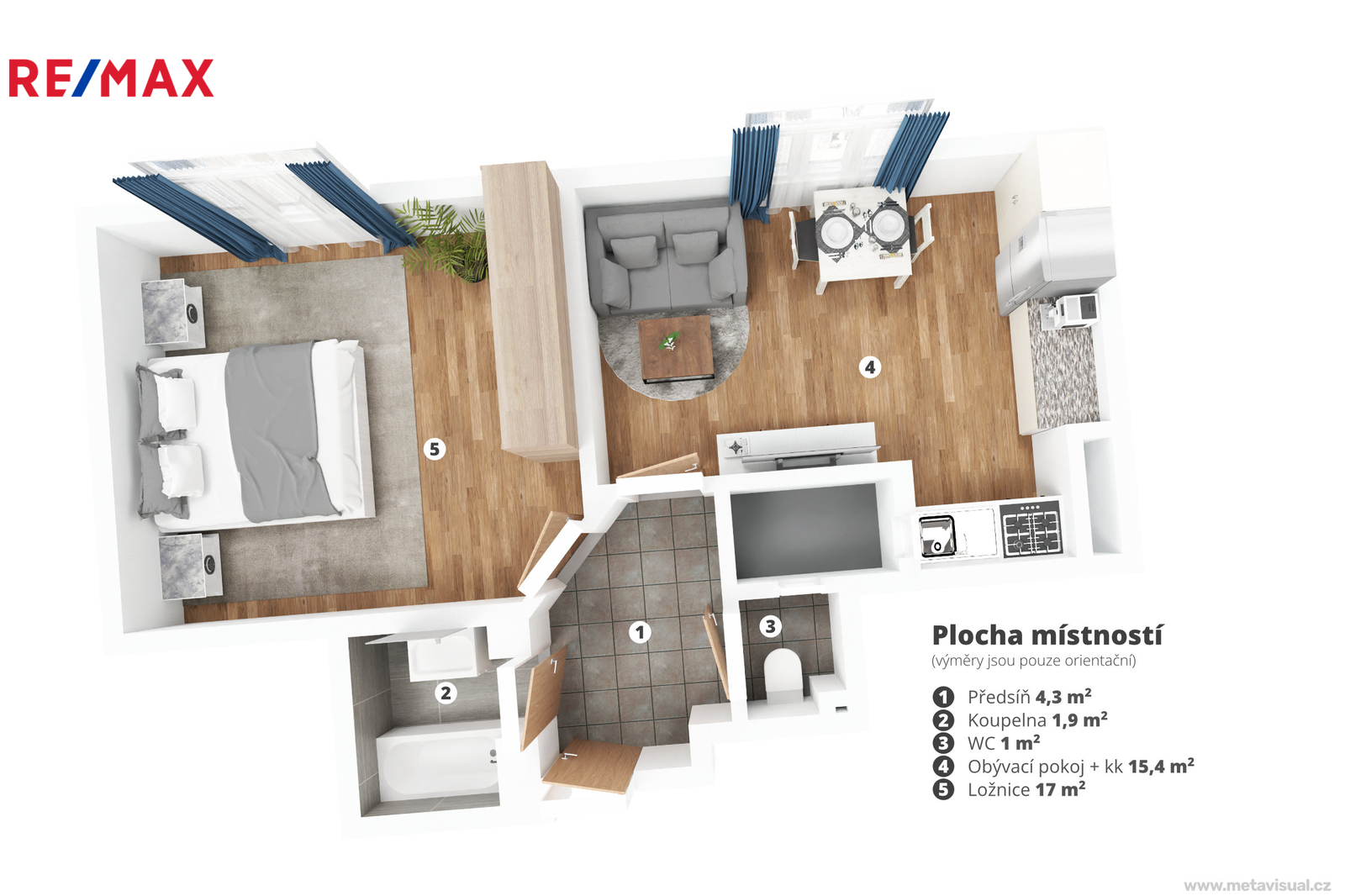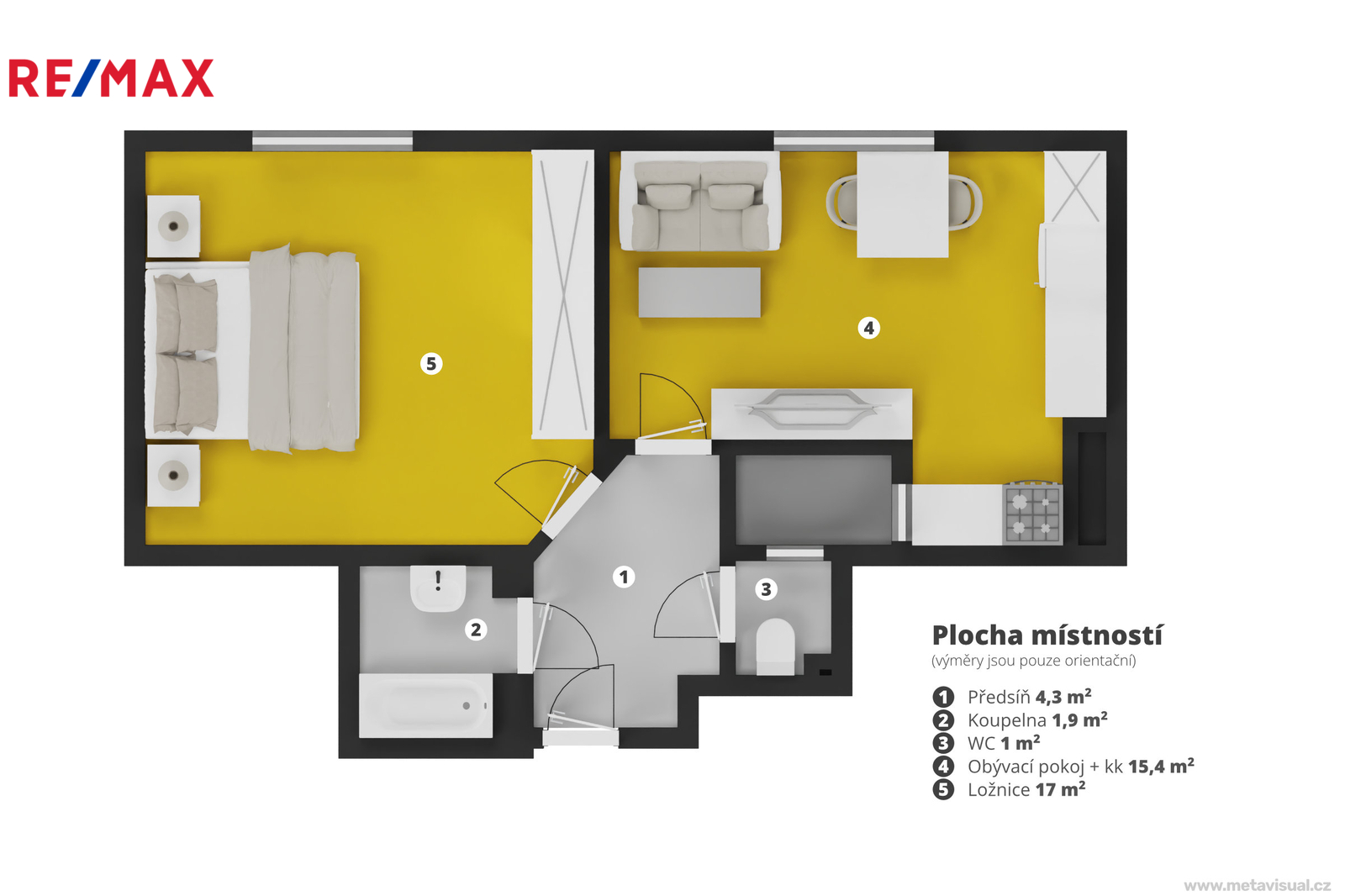 Vnitřní dispozice zahrnuje vstupní předsíň, obytnou místnost s kuchyňským koutem, druhý samostatný pokoj (ložnici), koupelnu a samostatnou toaletu.