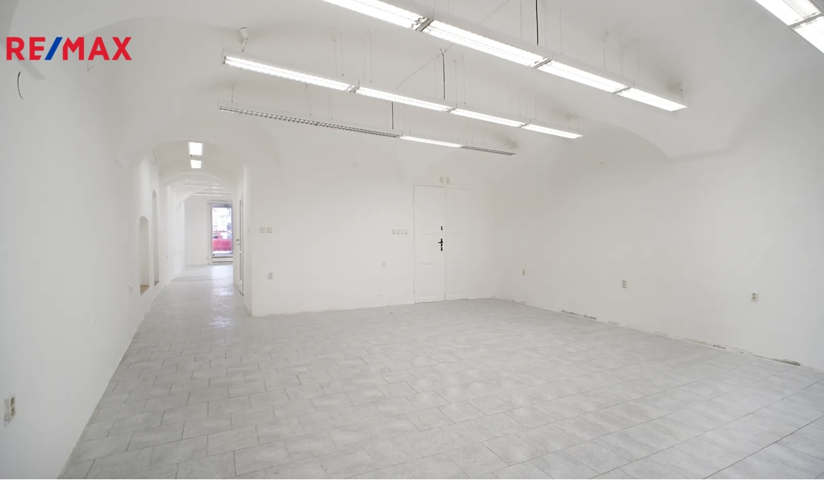 Dispozice zahrnuje hlavní prodejní plochu, denní místnost využitelnou jako kancelář či kuchyňku, samostatné WC a sklad. Vstup je přímo z podloubí, prostor je světlý a reprezentativní. Vhodný je pro prodejnu, showroom, kancelář, kosmetické nebo masážní studio, barber shop, galerii či ateliér.