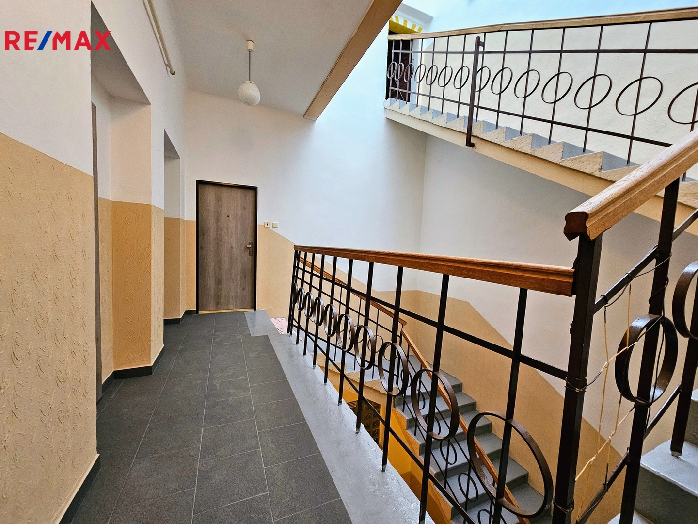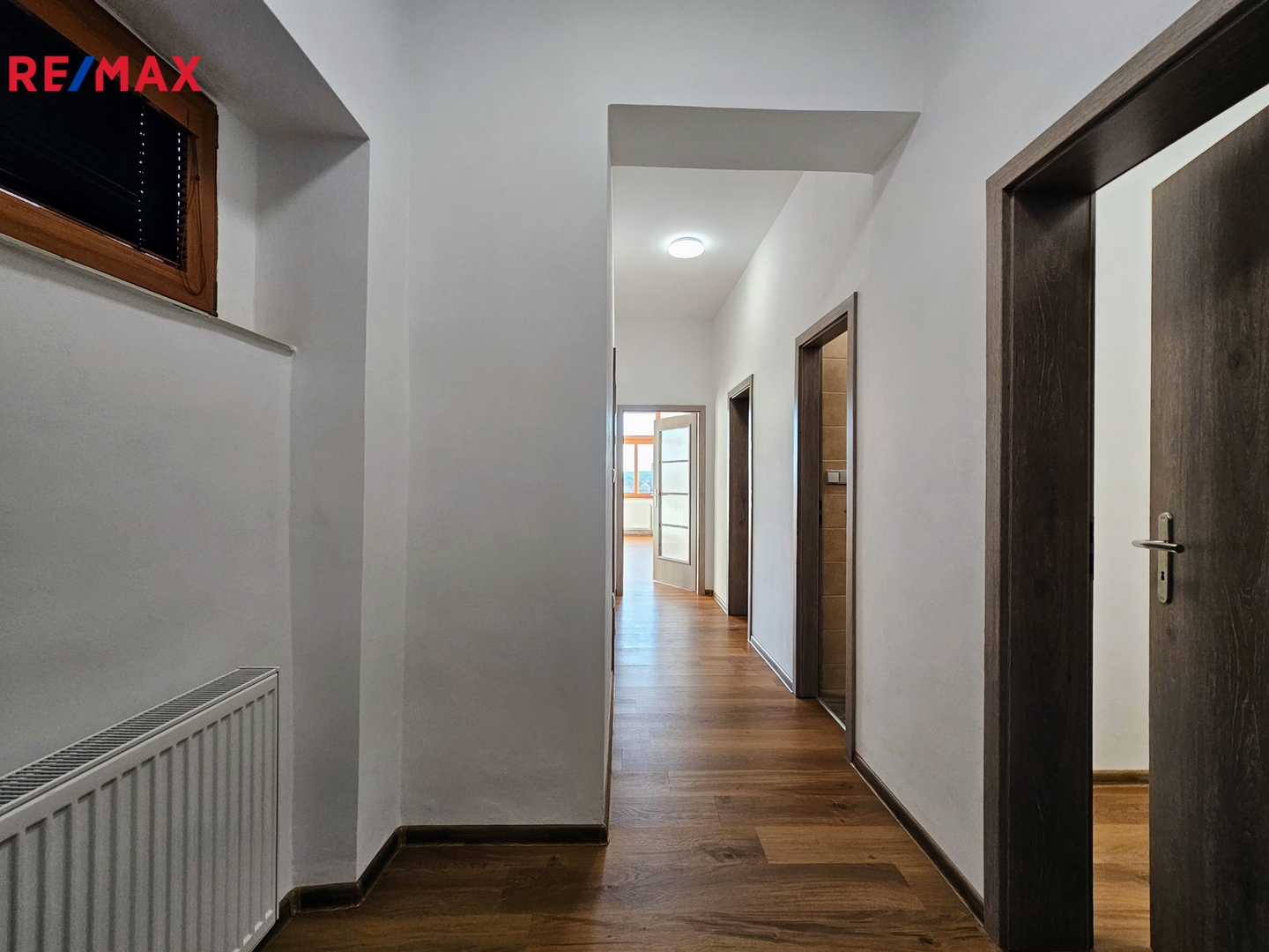Byt disponuje vstupní chodbou se vstupy po stranách do jednotlivých místností. Po levé straně do kuchyně 10 m2 vybavenou novou kompletní kuchyňskou linkou a lednicí, na protější, pravé straně chodby je za vstupními dveřmi komora - šatna 6 m2, samostatné WC a koupelna 5 m2 s novým sprchovým koutem. Za dveřmi v čele chodby je obývací pokoj 24,5 m2 se vstupem do ložnice 12,5 m2, oba pokoje s okny s výhledem do zeleně na hradbách a nad město.