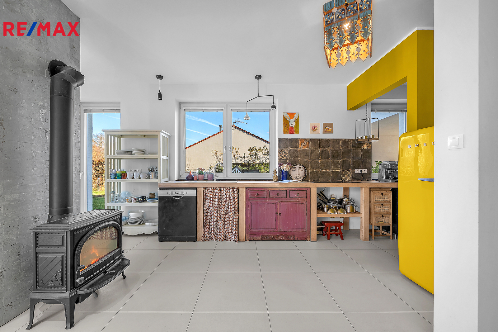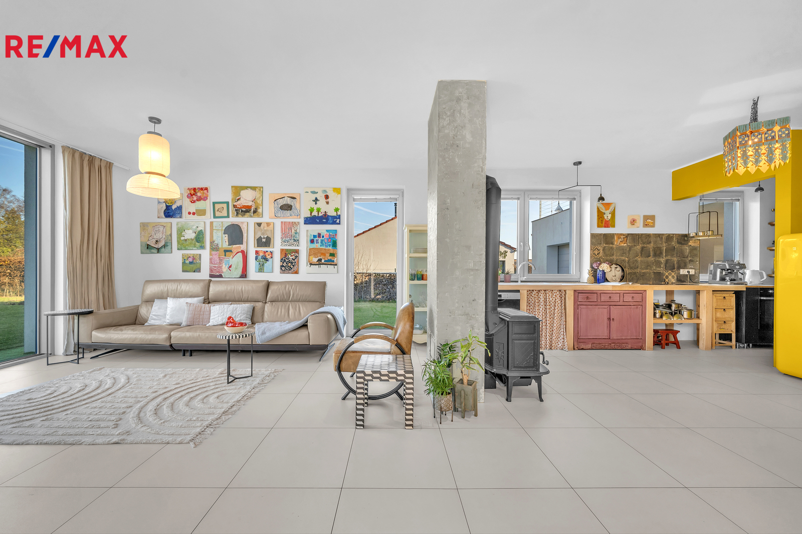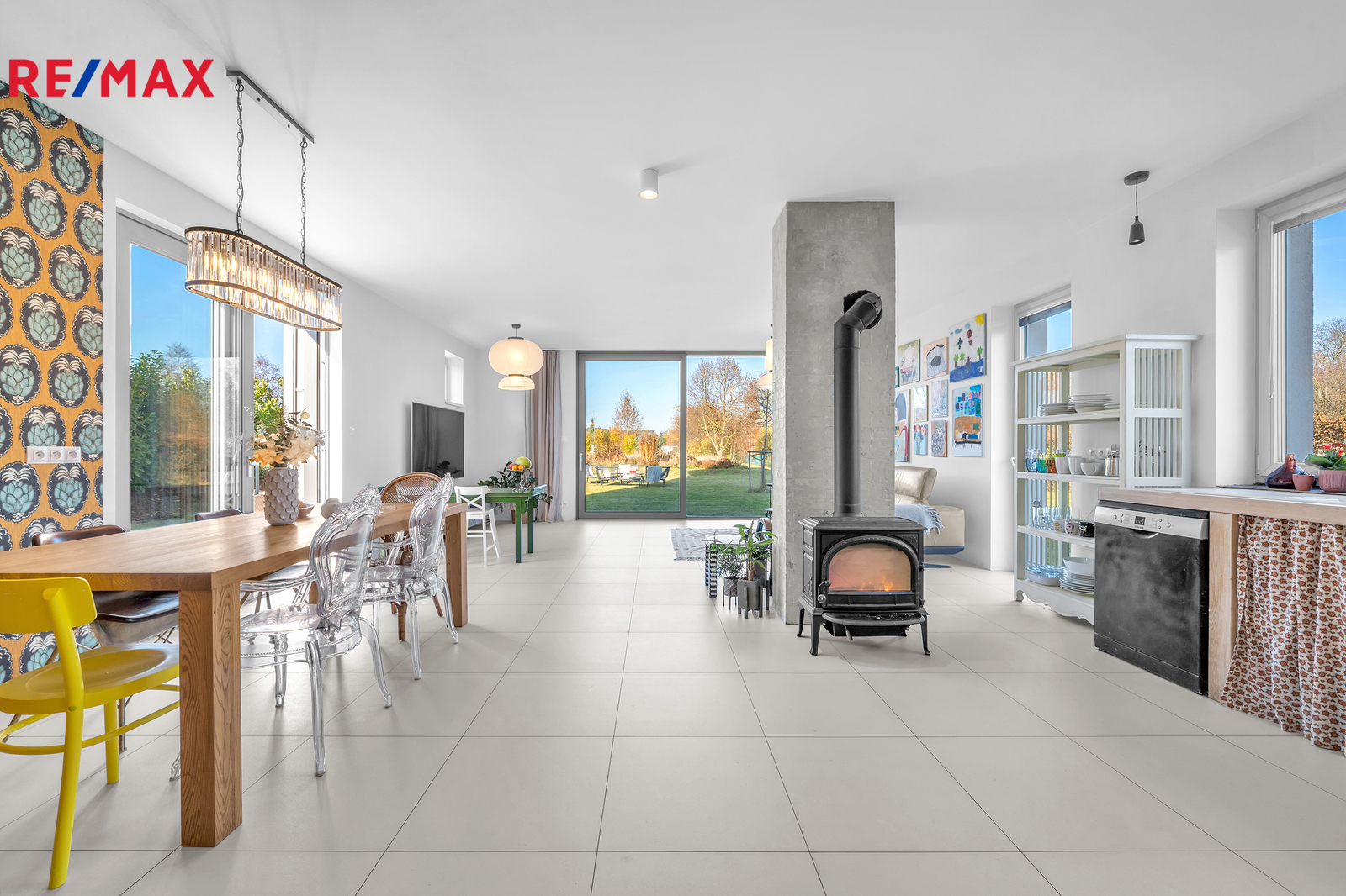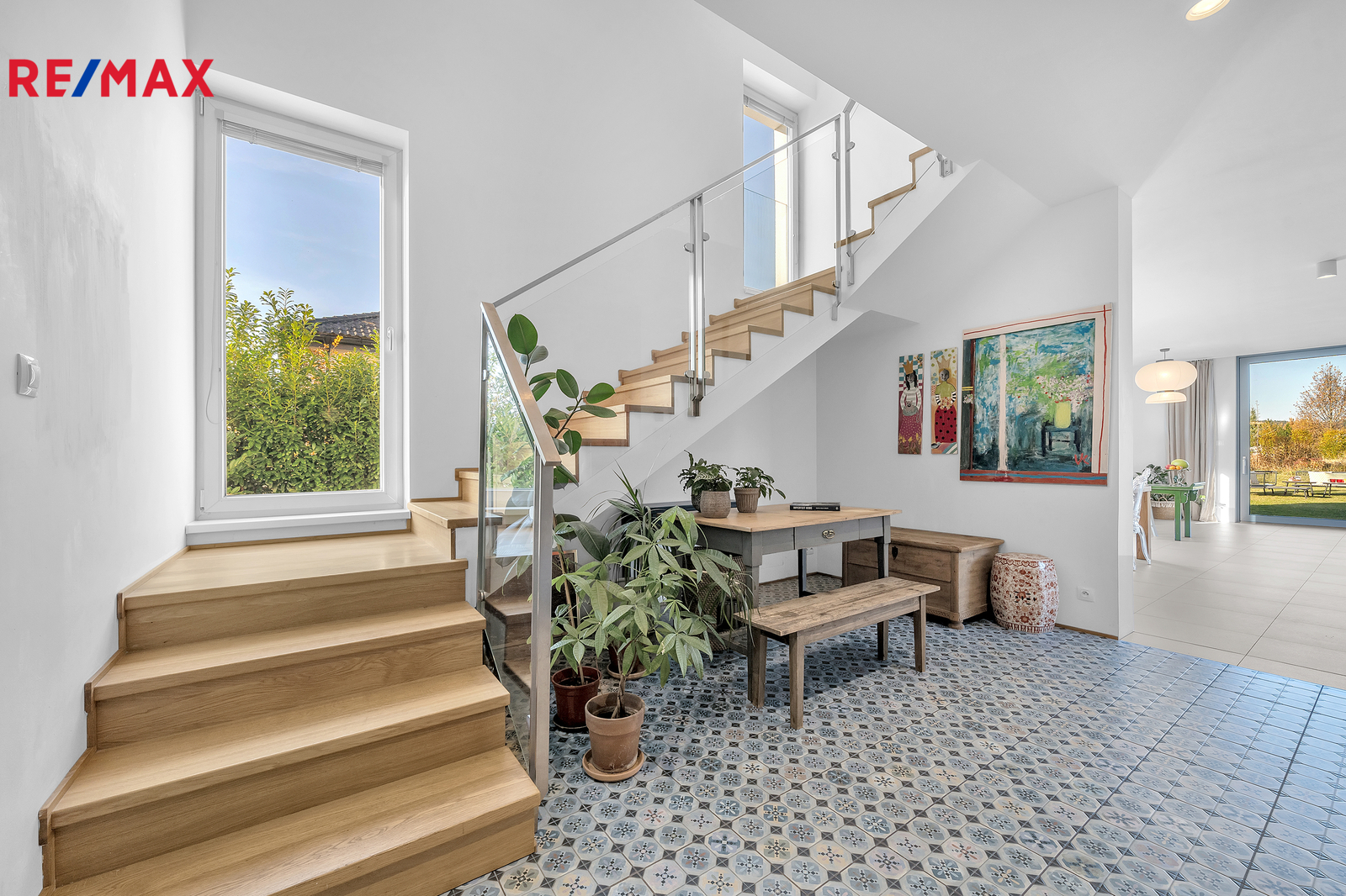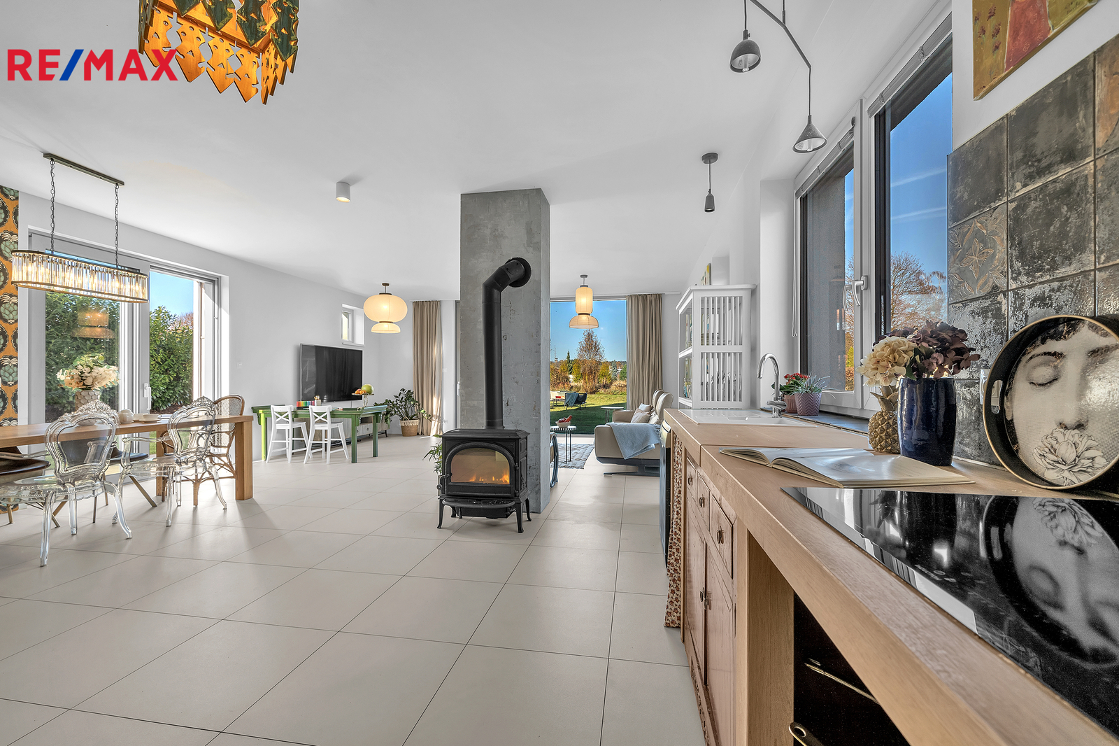 Srdcem domu je otevřený obývací prostor s velkým francouzským oknem, které plynule propojuje interiér se zahradou a umožňuje přímý vstup ven. Výhled do zeleně, na vzrostlé stromy a keře lemující pozemek, dodává domu výjimečně klidnou atmosféru, kterou podtrhují stylová litinová kamna. V přízemí se nachází také prostorná pracovna orientovaná na jižní stranu, díky čemuž je světlá a příjemná po celý den. Interiér domu je navržen tak, aby působil vzdušně, čistě a harmonicky, každý detail má svůj smysl.