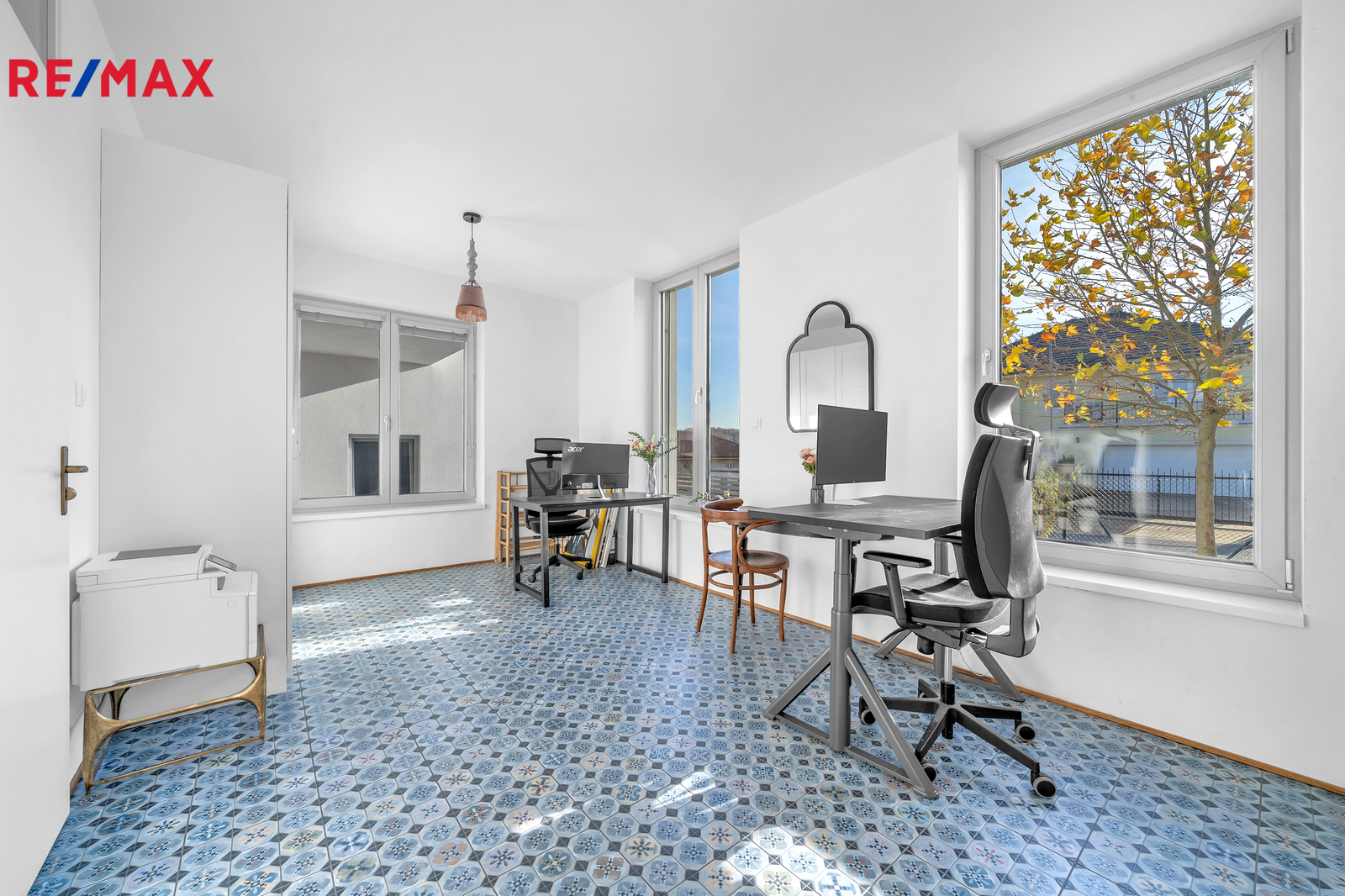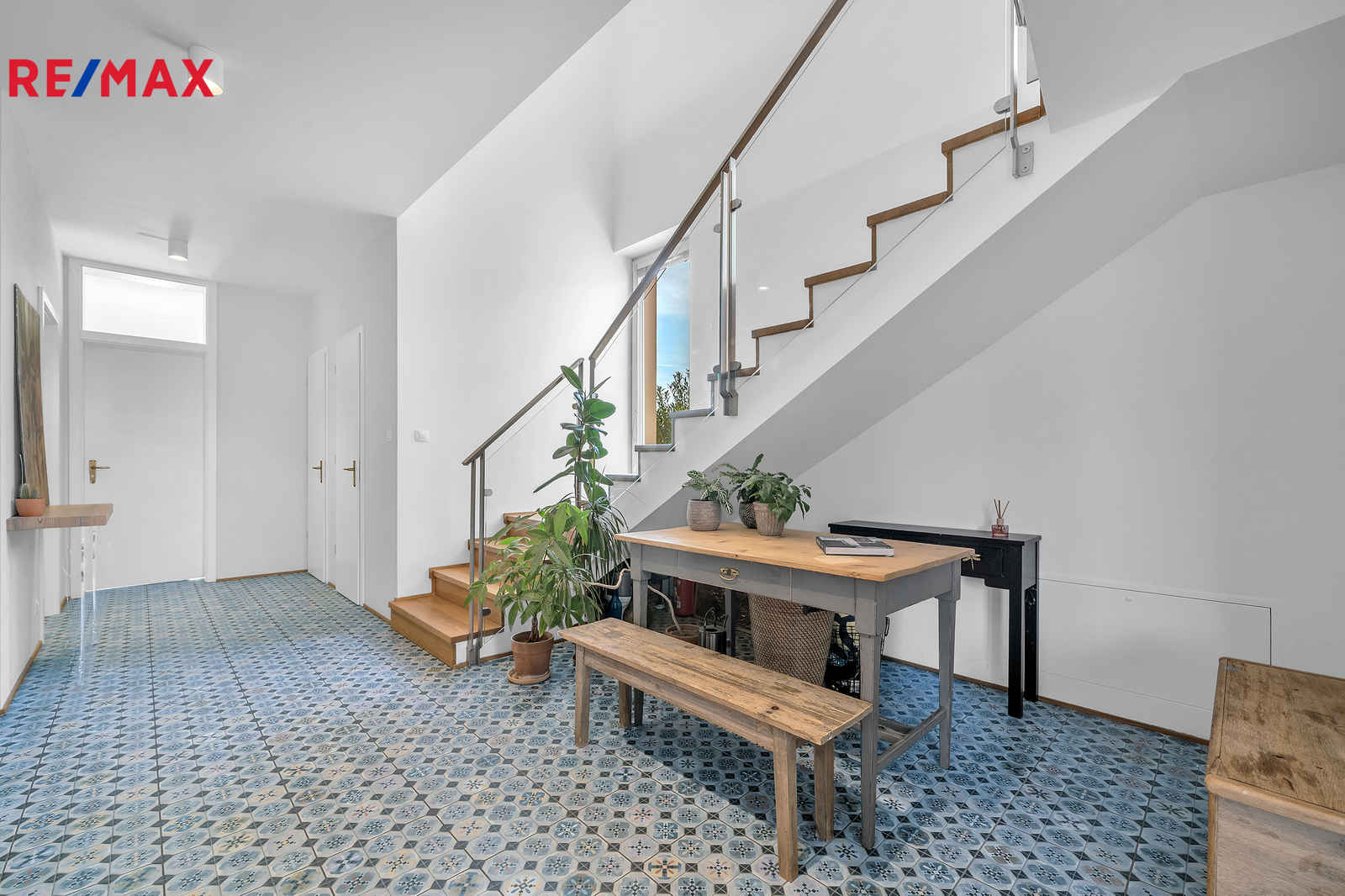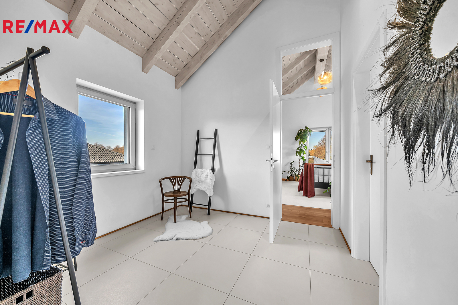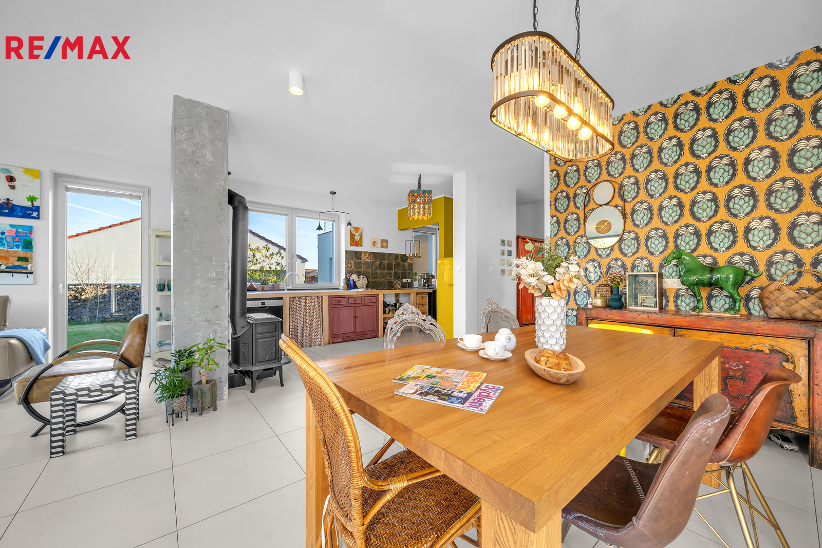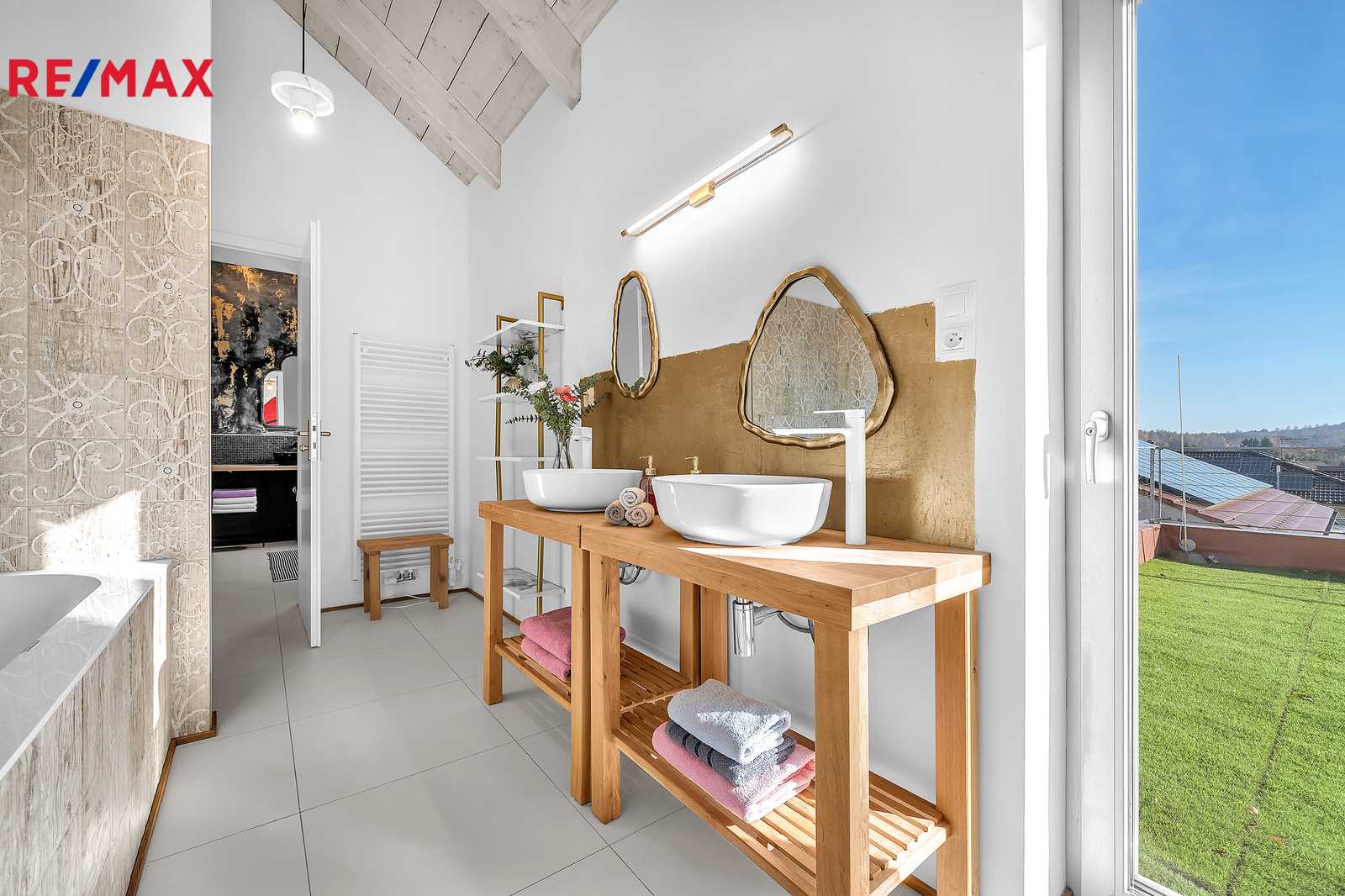 Srdcem domu je otevřený obývací prostor s velkým francouzským oknem, které plynule propojuje interiér se zahradou a umožňuje přímý vstup ven. Výhled do zeleně, na vzrostlé stromy a keře lemující pozemek, dodává domu výjimečně klidnou atmosféru, kterou podtrhují stylová litinová kamna. V přízemí se nachází také prostorná pracovna orientovaná na jižní stranu, díky čemuž je světlá a příjemná po celý den. Interiér domu je navržen tak, aby působil vzdušně, čistě a harmonicky, každý detail má svůj smysl.