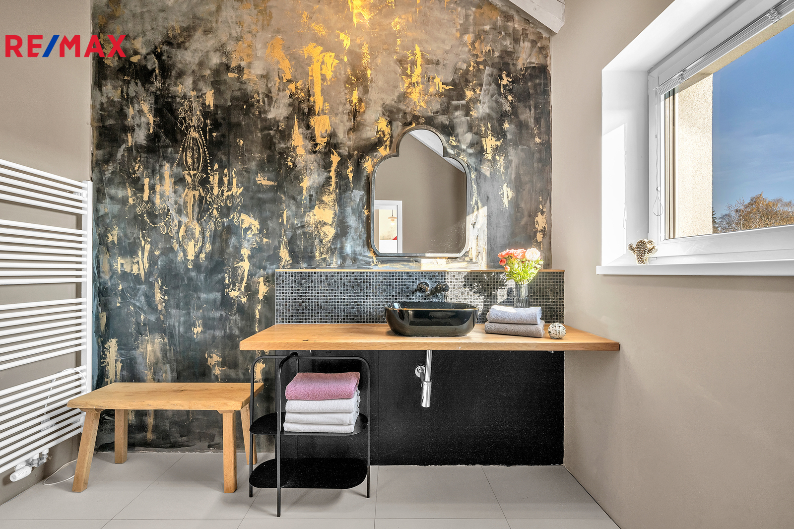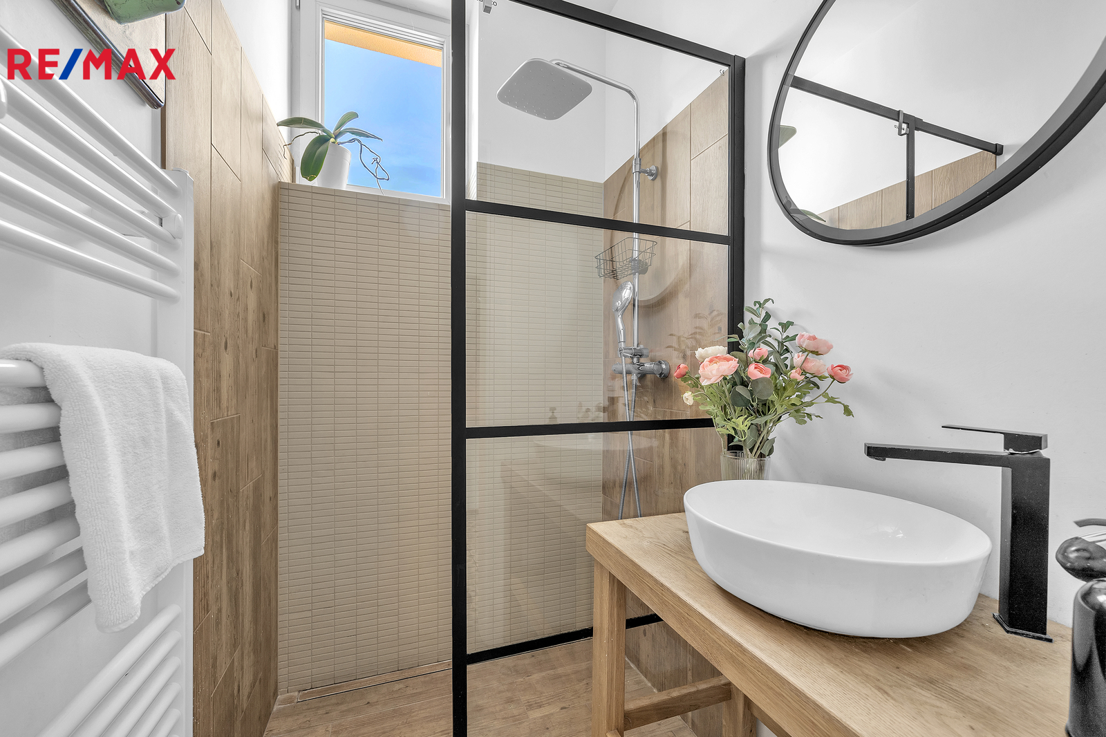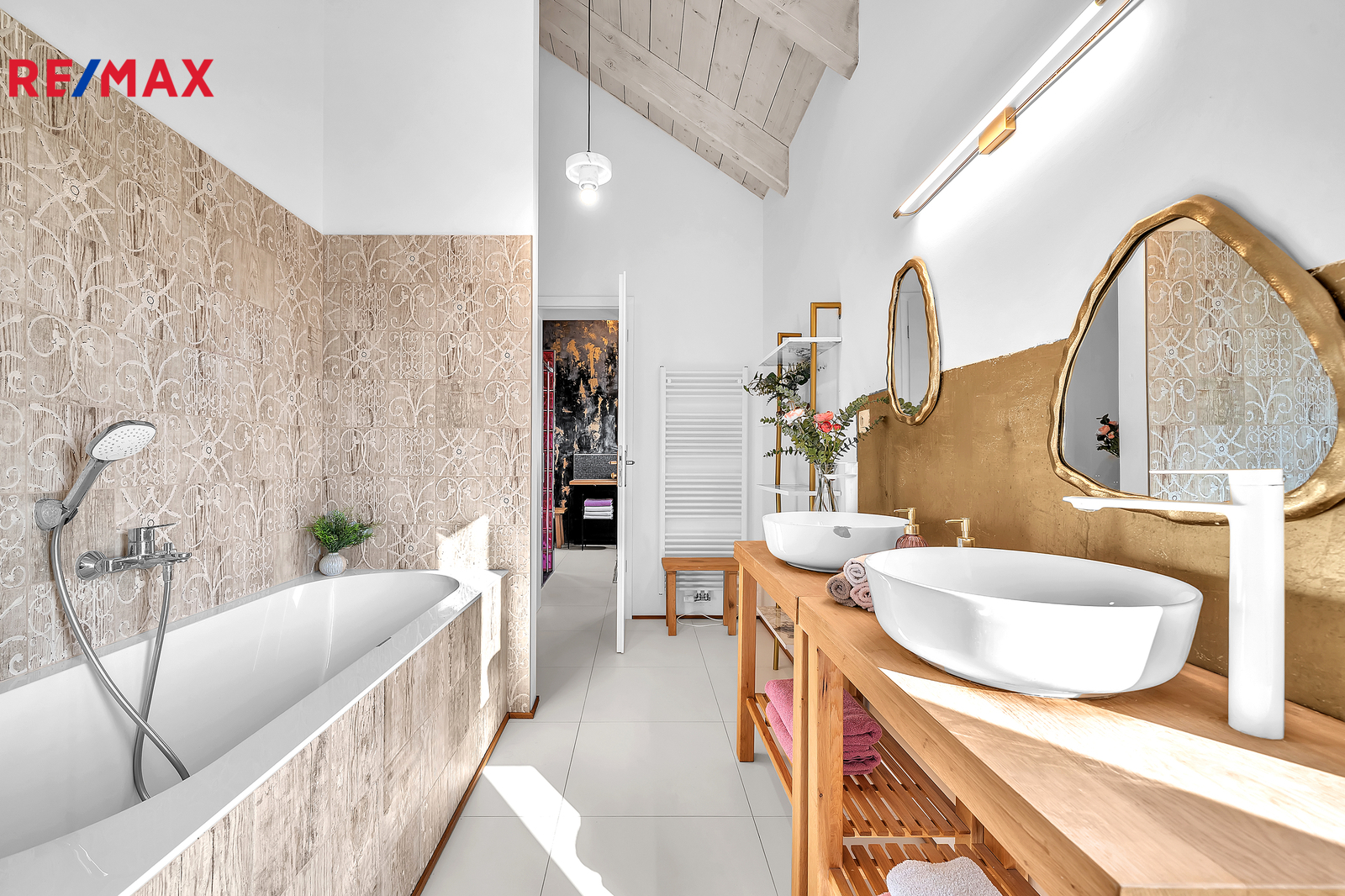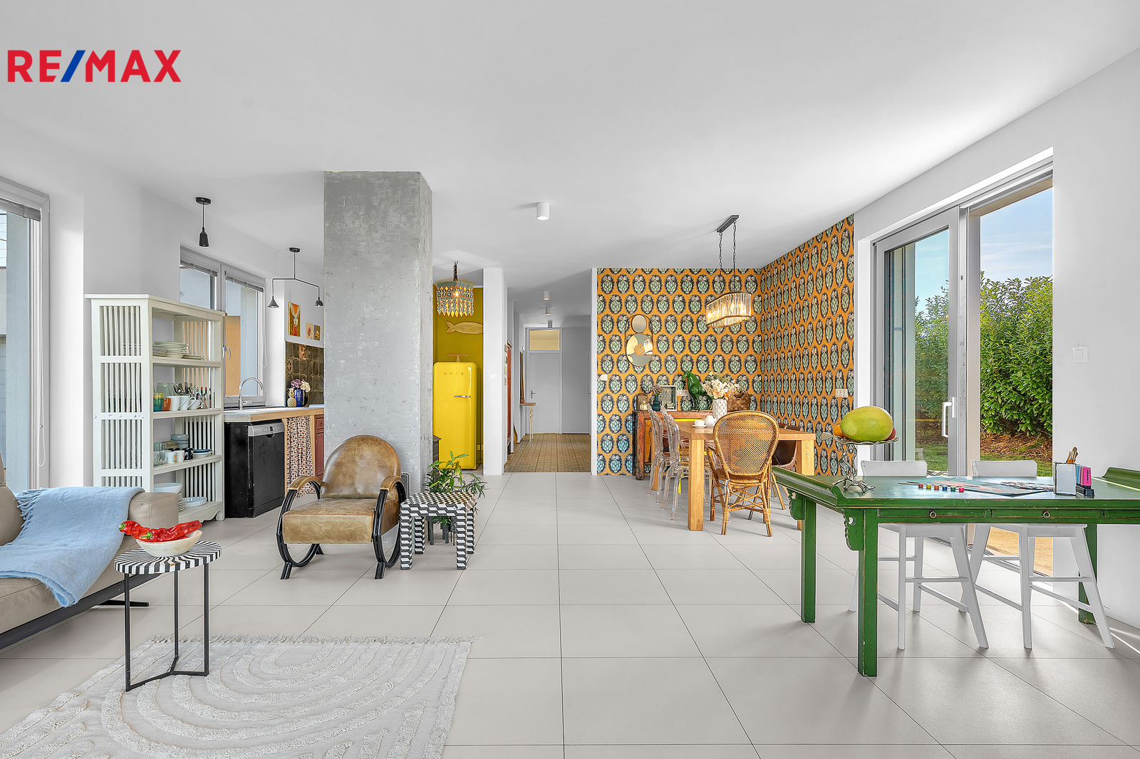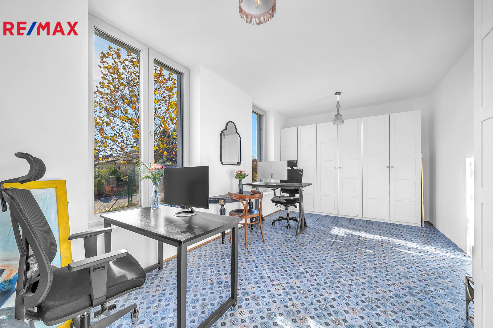 Srdcem domu je otevřený obývací prostor s velkým francouzským oknem, které plynule propojuje interiér se zahradou a umožňuje přímý vstup ven. Výhled do zeleně, na vzrostlé stromy a keře lemující pozemek, dodává domu výjimečně klidnou atmosféru, kterou podtrhují stylová litinová kamna. V přízemí se nachází také prostorná pracovna orientovaná na jižní stranu, díky čemuž je světlá a příjemná po celý den. Interiér domu je navržen tak, aby působil vzdušně, čistě a harmonicky, každý detail má svůj smysl.