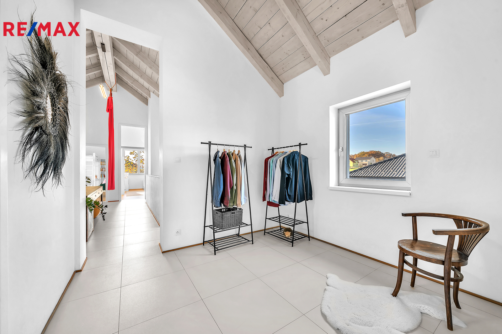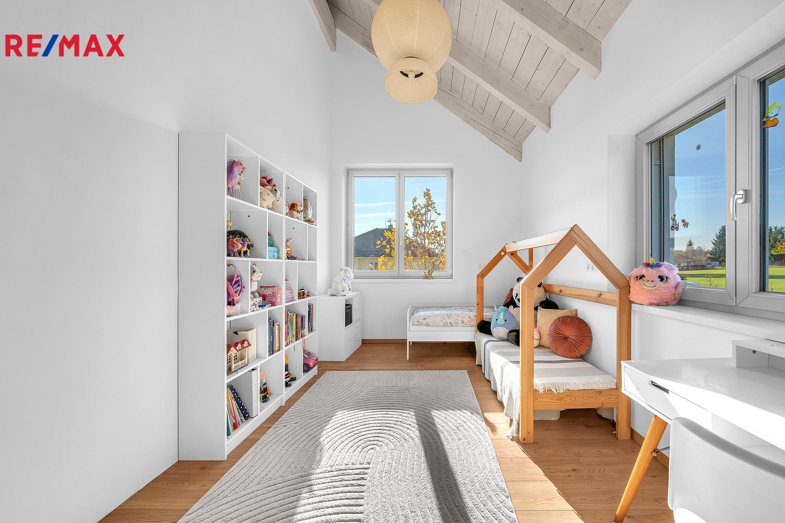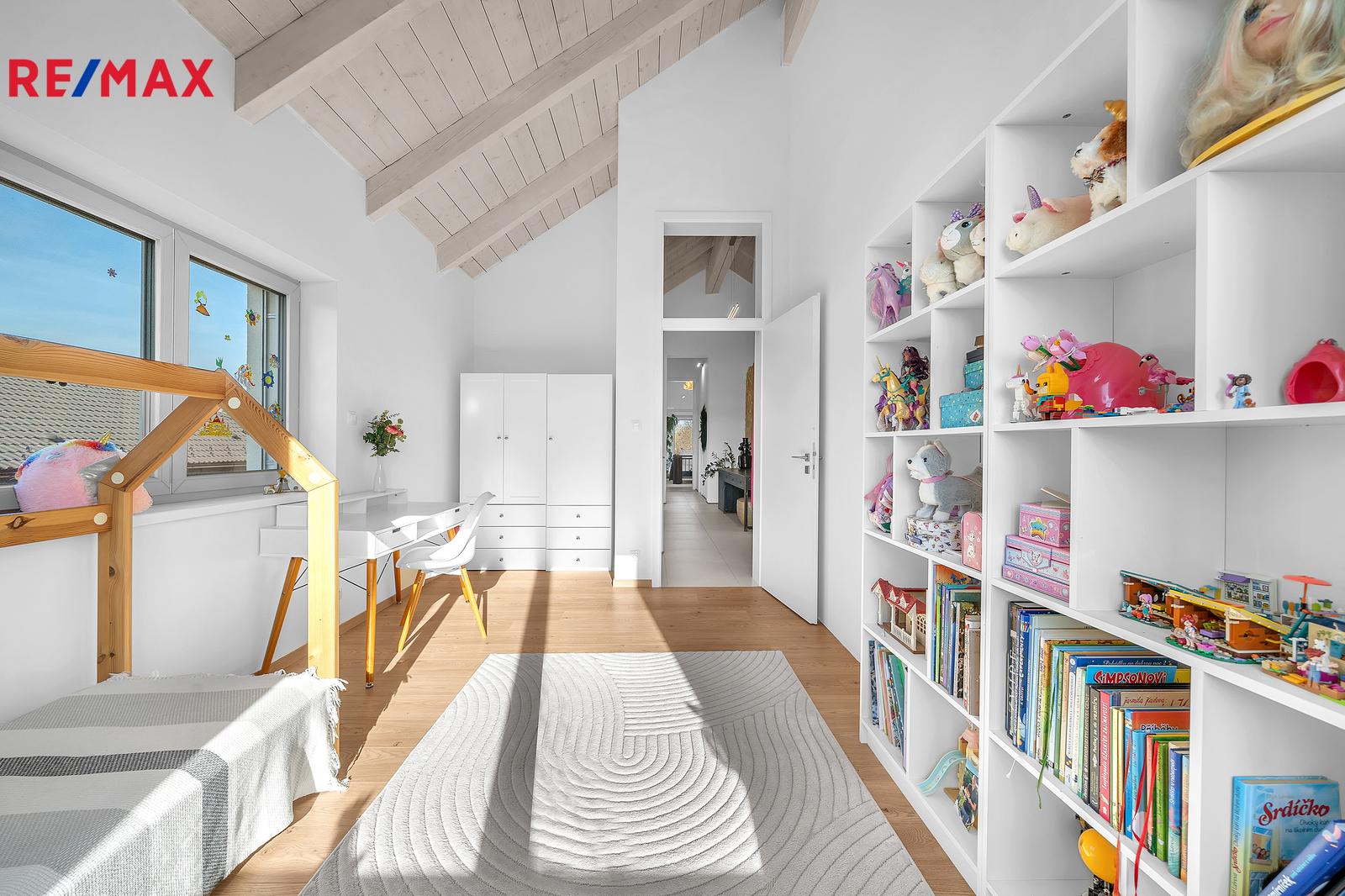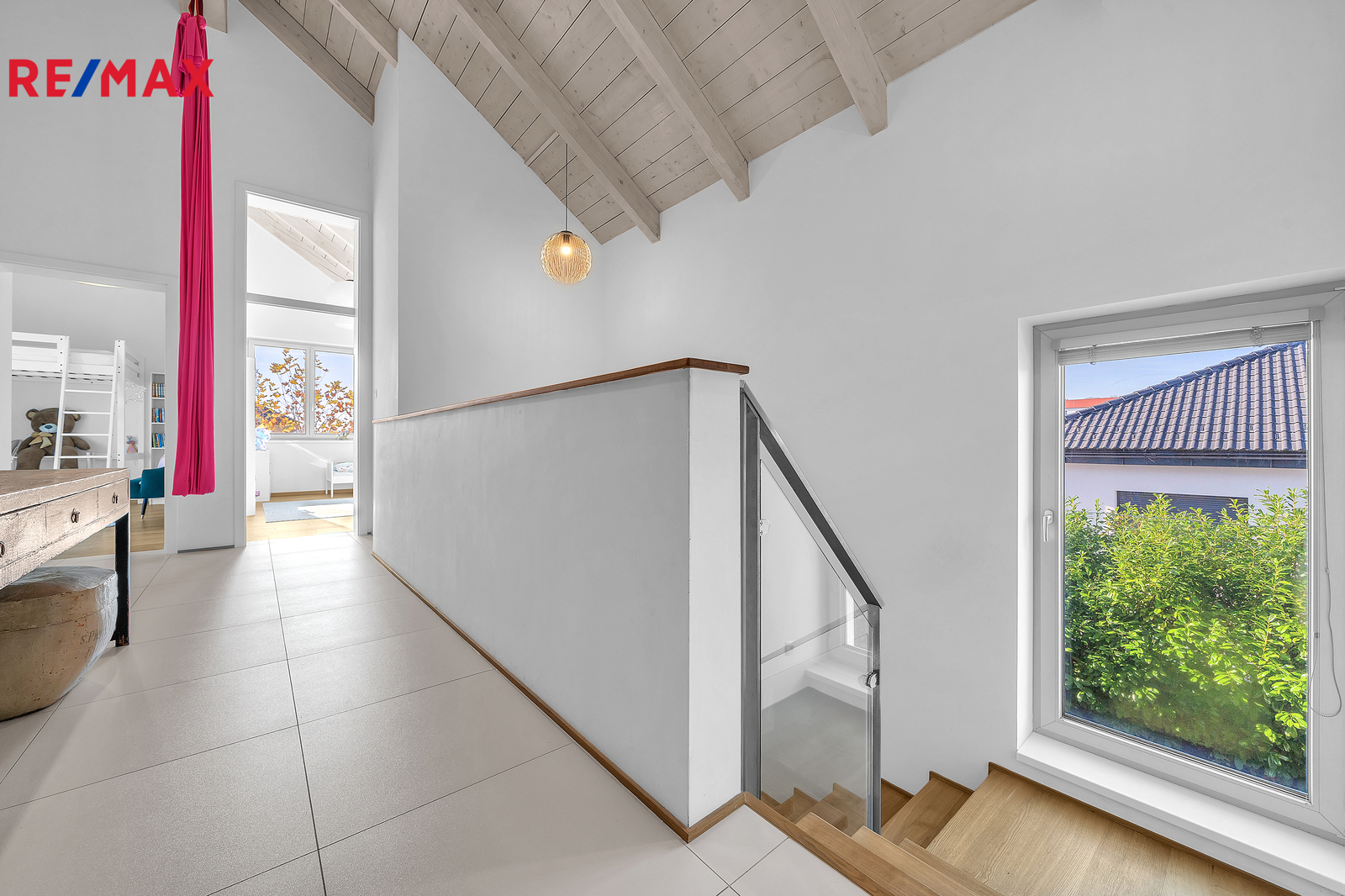 Dispozice domu je řešena s maximálním důrazem na komfort celé rodiny a oddělení rodičovské a dětské části. Dominantou vrchního patra jsou otevřené krovy sahající až do výšky čtyř metrů, díky čemuž působí interiér velmi vzdušně a prostorně. Rodičovská ložnice má vlastní koupelnu i šatnu. Dětské pokoje se nacházejí v samostatné části domu a mají také svou vlastní koupelnu. V patře je navíc samostatné WC. Z východního dětského pokoje i z koupelny je vstup na terasu s krásným výhledem do okolní zeleně, což je řešení, které se u běžné výstavby prakticky nevyskytuje.