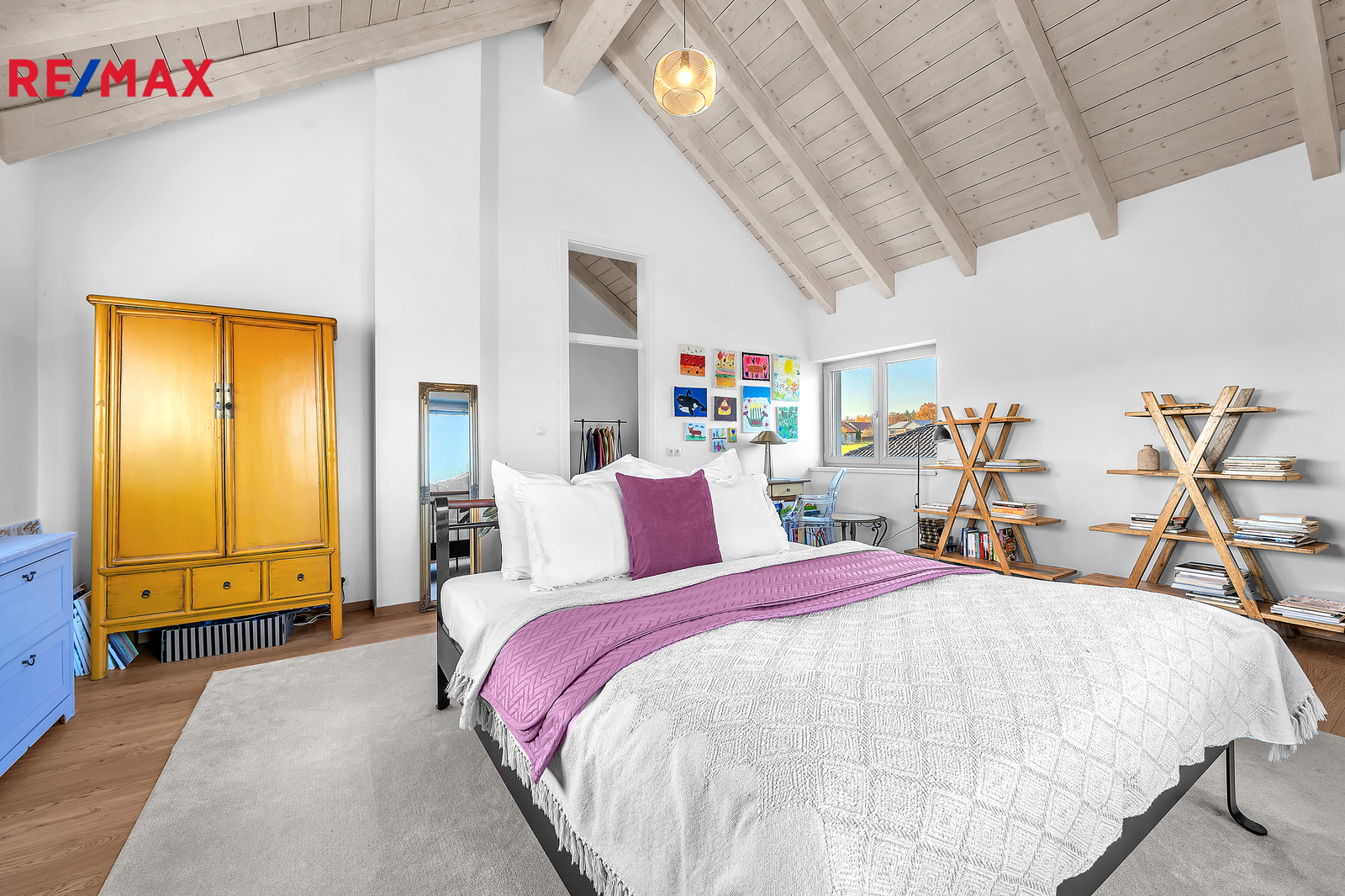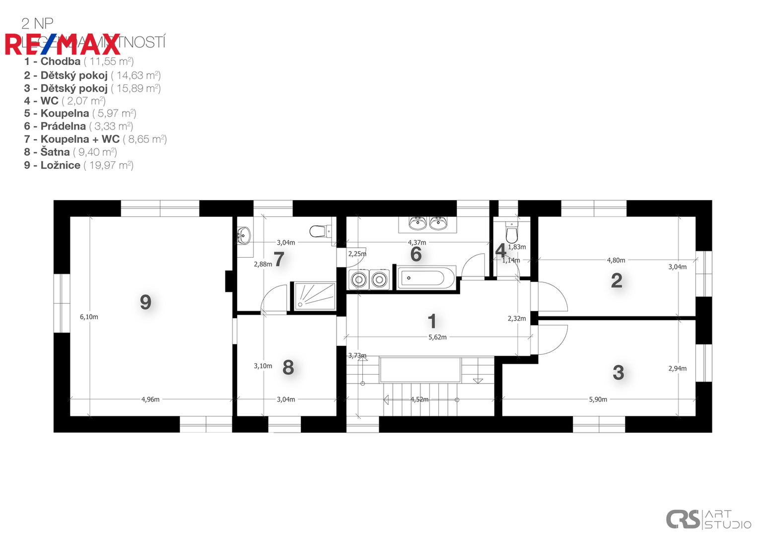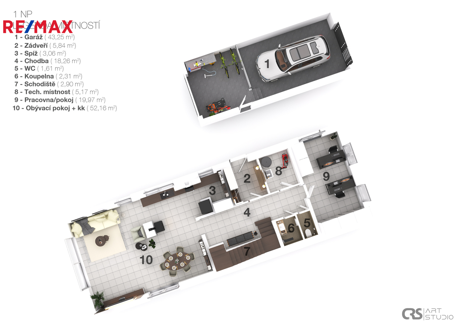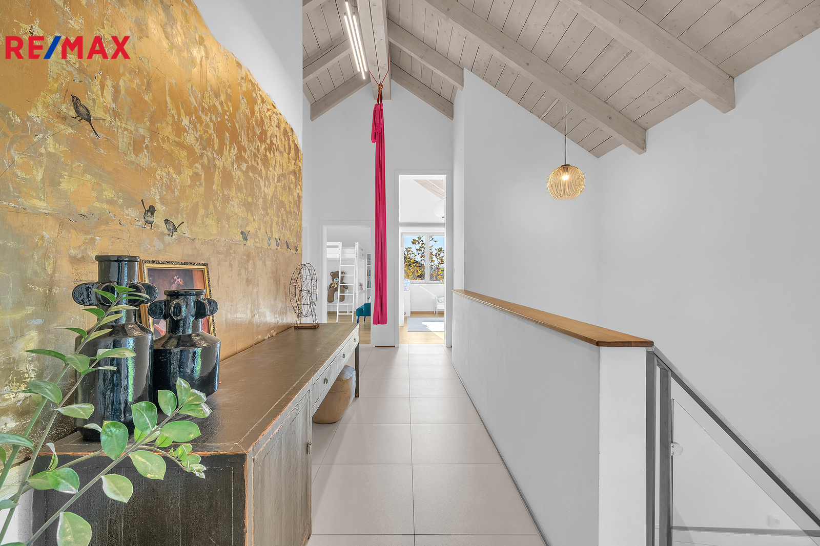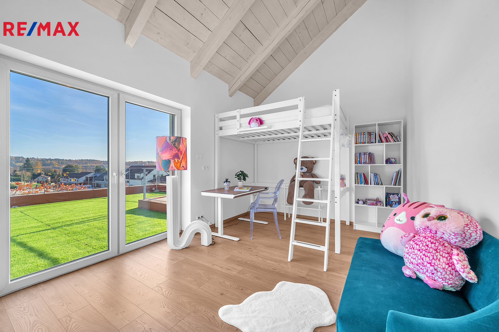 Dispozice domu je řešena s maximálním důrazem na komfort celé rodiny a oddělení rodičovské a dětské části. Dominantou vrchního patra jsou otevřené krovy sahající až do výšky čtyř metrů, díky čemuž působí interiér velmi vzdušně a prostorně. Rodičovská ložnice má vlastní koupelnu i šatnu. Dětské pokoje se nacházejí v samostatné části domu a mají také svou vlastní koupelnu. V patře je navíc samostatné WC. Z východního dětského pokoje i z koupelny je vstup na terasu s krásným výhledem do okolní zeleně, což je řešení, které se u běžné výstavby prakticky nevyskytuje.