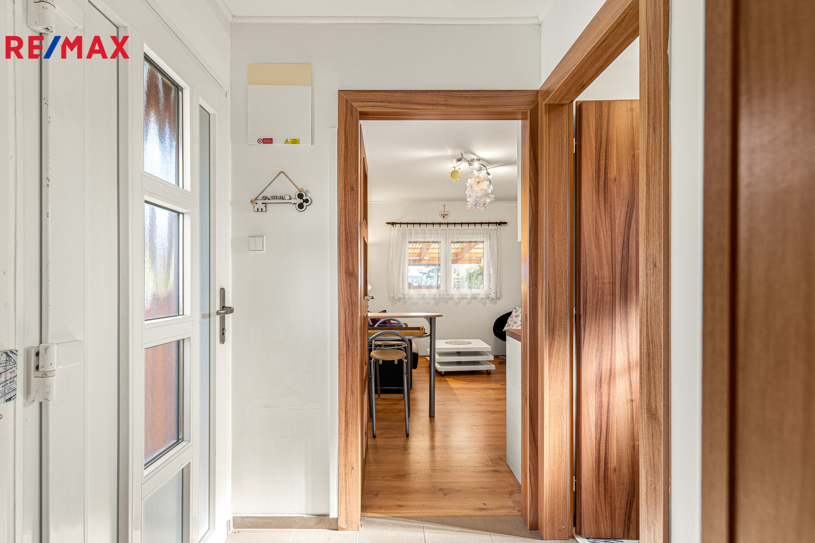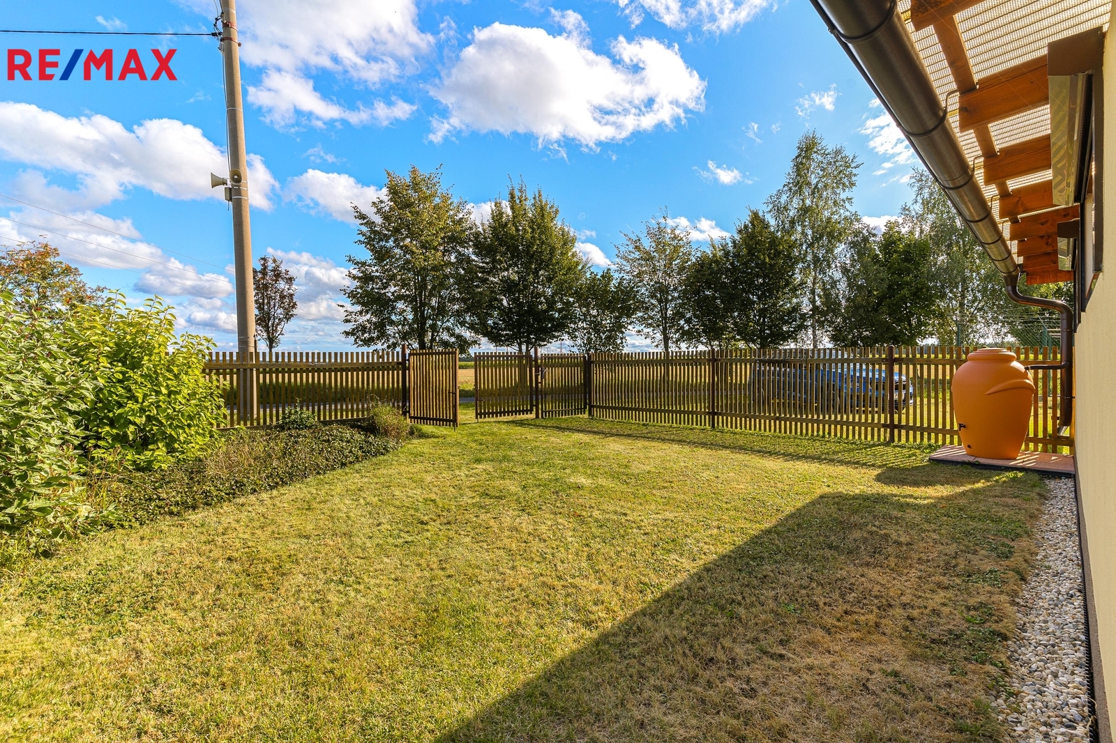 Díky elektrickým roletám lze pergolu snadno uzavřít a využívat ji i za horšího počasí. Na zahradě je bazén o ploše 20 m2, který v létě potěší děti i dospělé. Okrasné záhony, skalka, vzrostlé keře a stromy dotvářejí příjemnou atmosféru.
