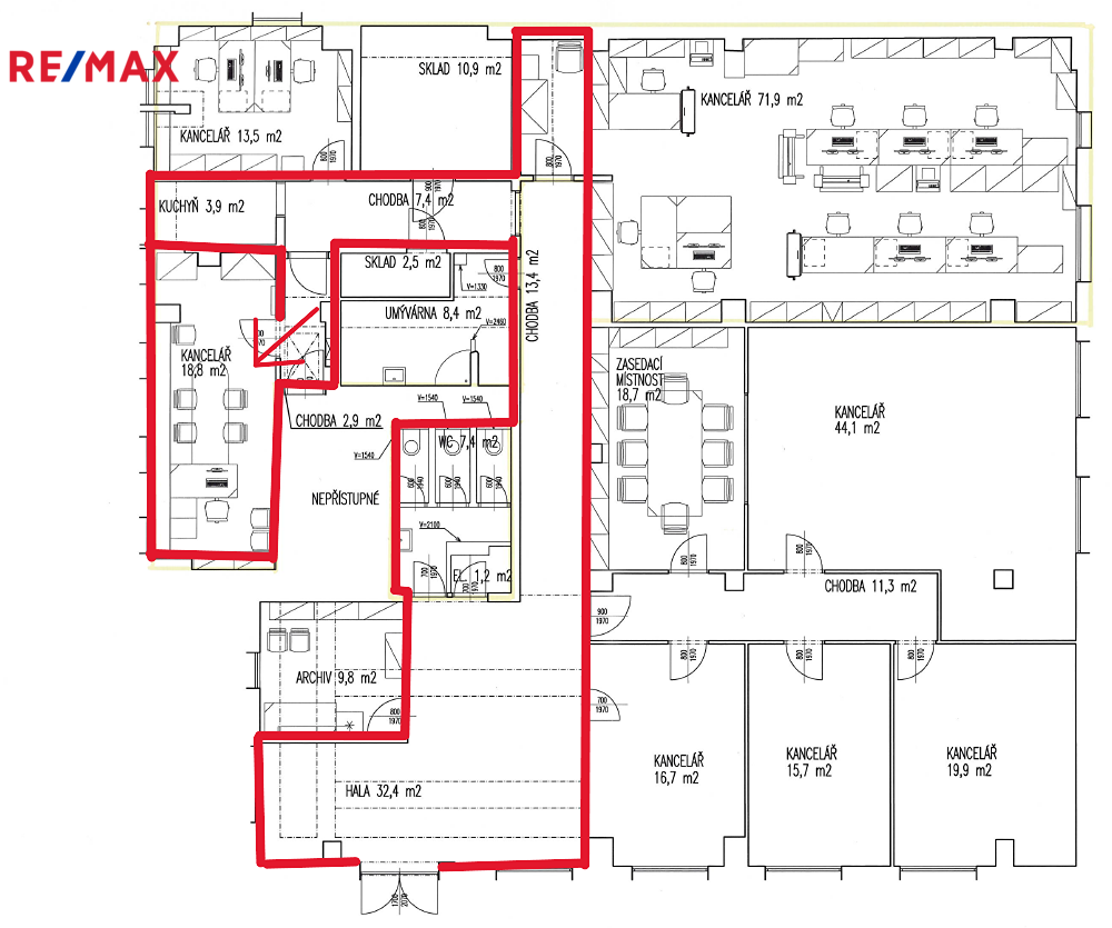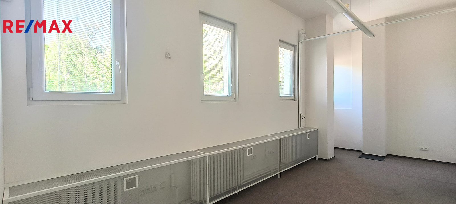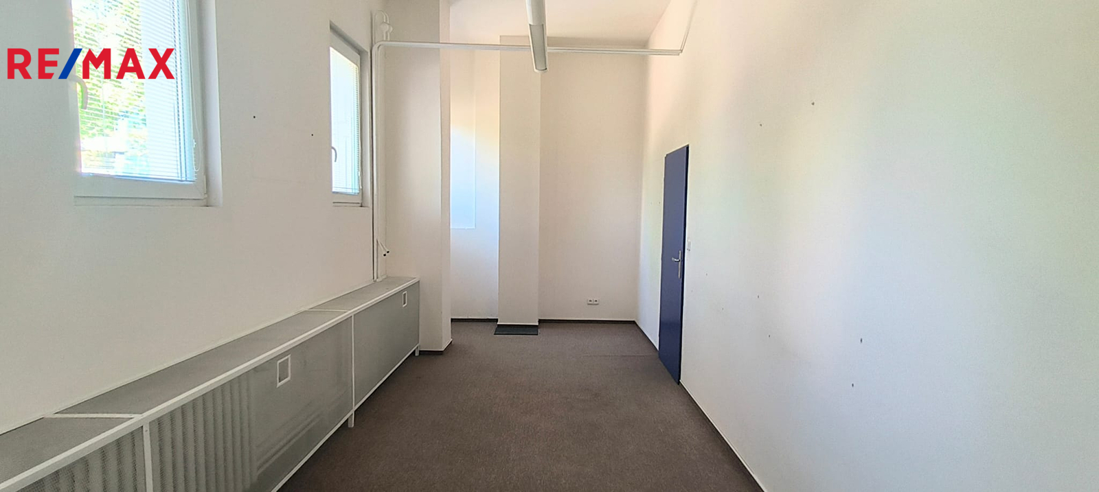 Kancelář není vybavena nábytkem. Společná kuchyňka s WC. K dispozici je možnost pronajmout si více kanceláří najednou, které se nacházejí na stejném patře.