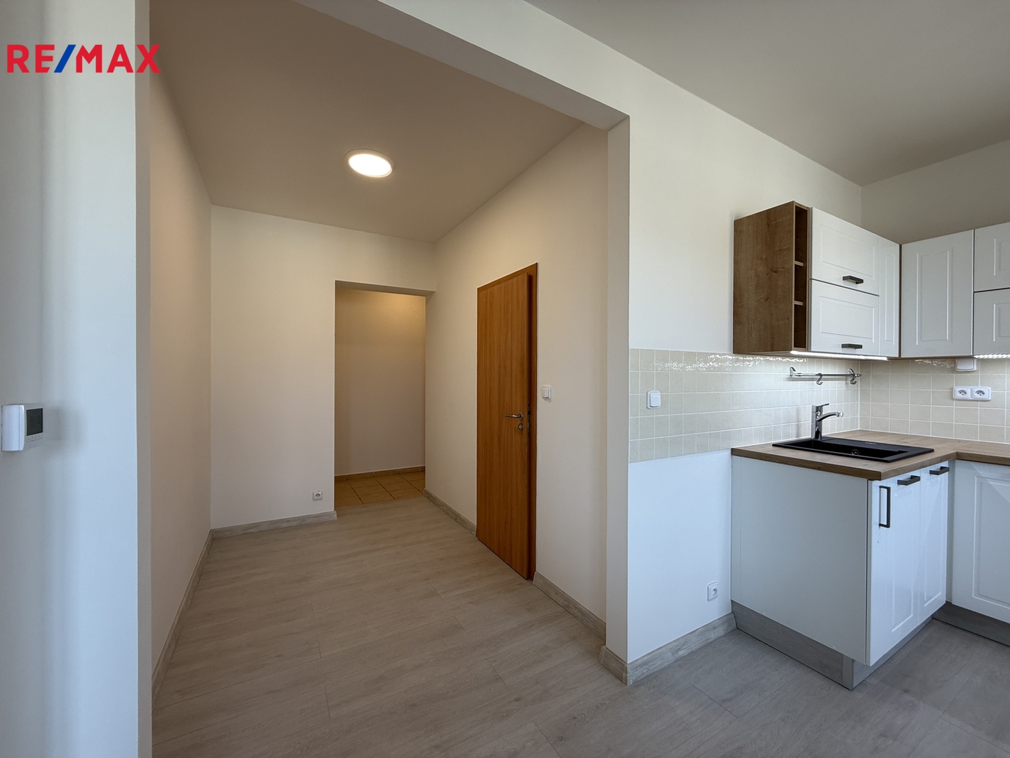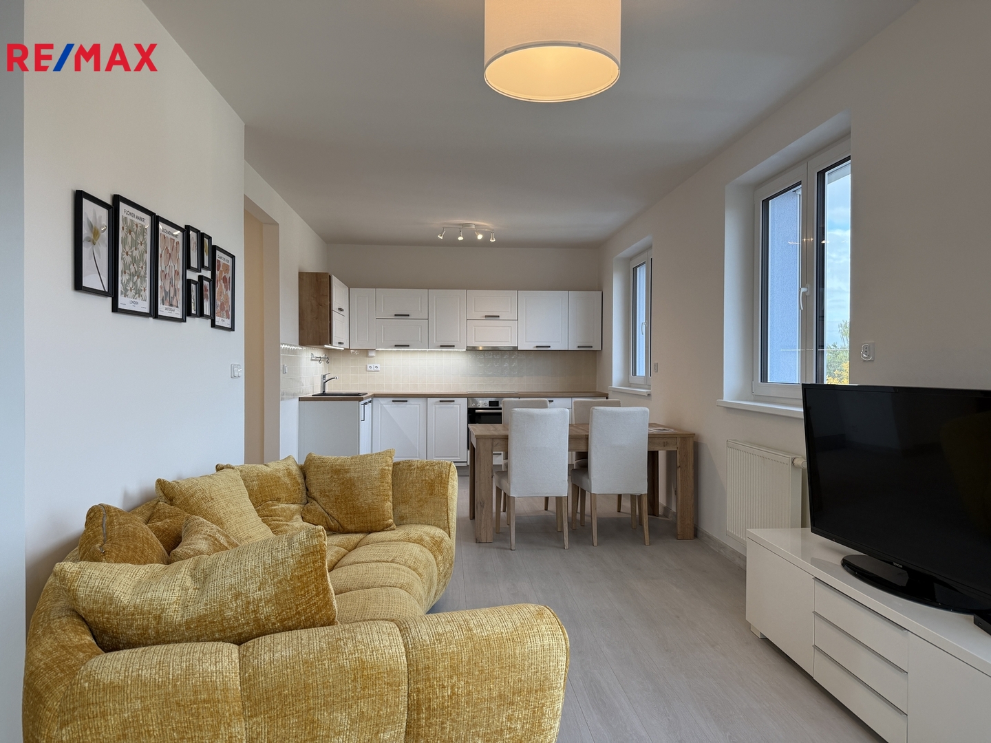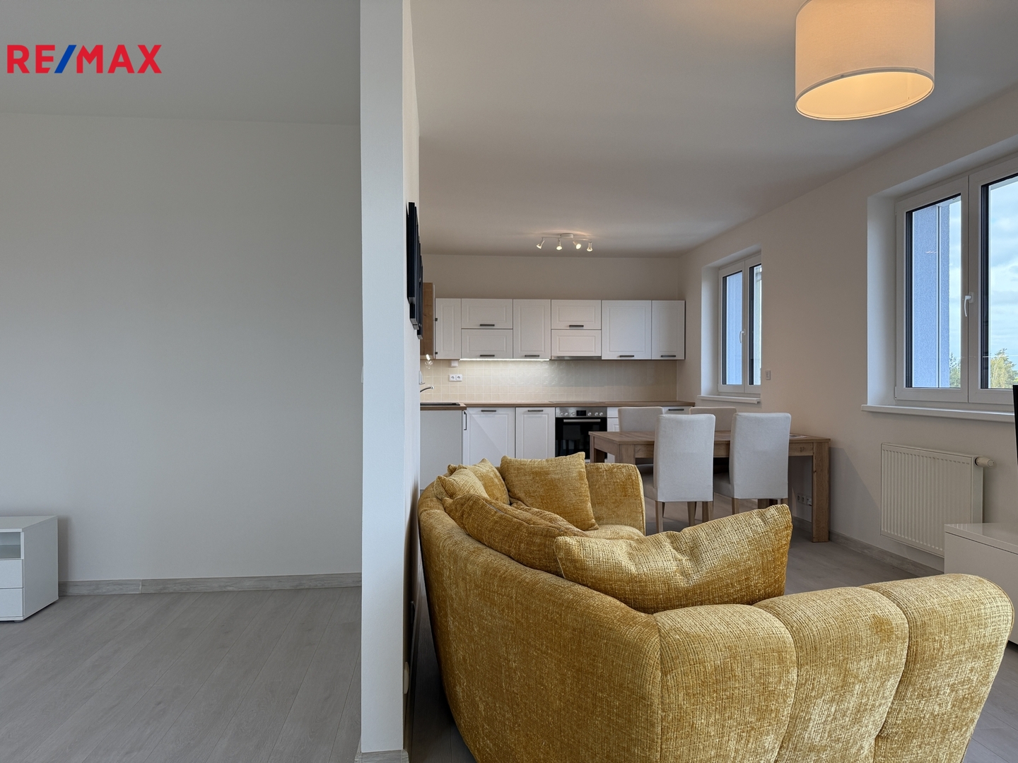 Byt je velmi slunný, s orientací na jih a východ. Tvoří jej vstupní chodba, kuchyně s kuchyňskou linkou, elektrickou varnou deskou, elektrickou troubou a myčkou nádobí, dále obývací pokoj s jídelnou, ze kterého je vstup do ložnice skrze z poloviny ubouranou příčku. Otevřené propojení obývacího pokoje s chodbou i ložnicí prostor opticky rozšiřuje, zajišťuje dostatek světla a působí vzdušně a prostorně. Součástí bytu je také koupelna s rohovou vanou, WC a příprava pro připojení pračky.