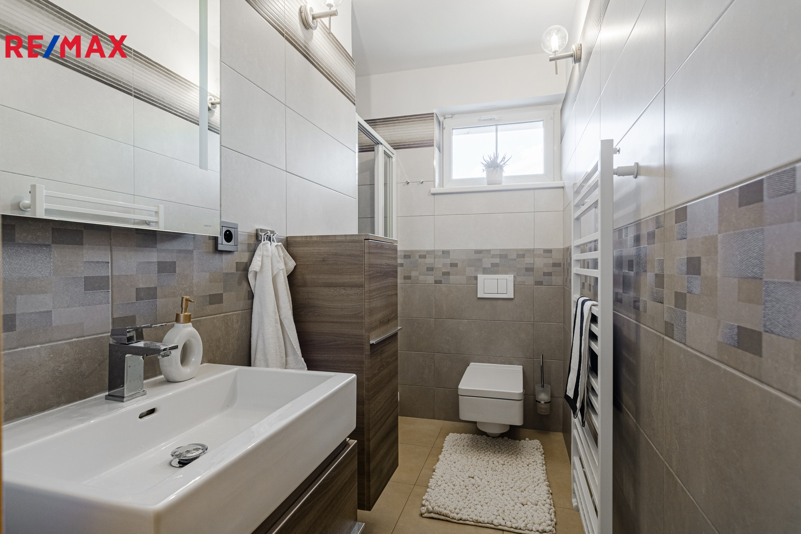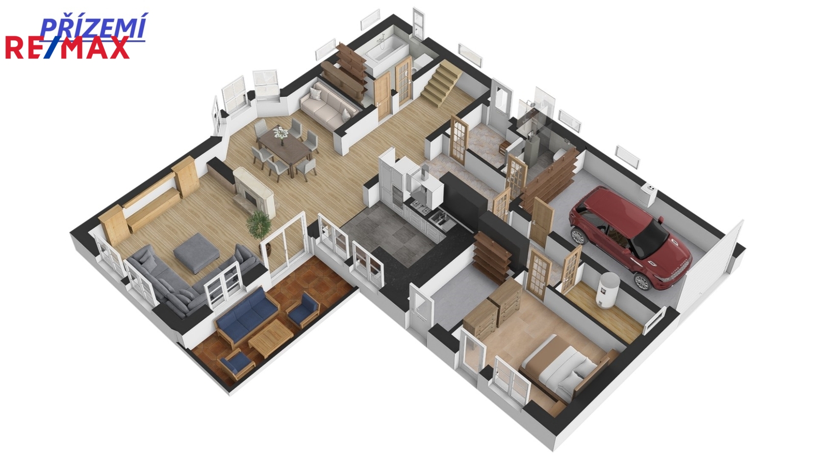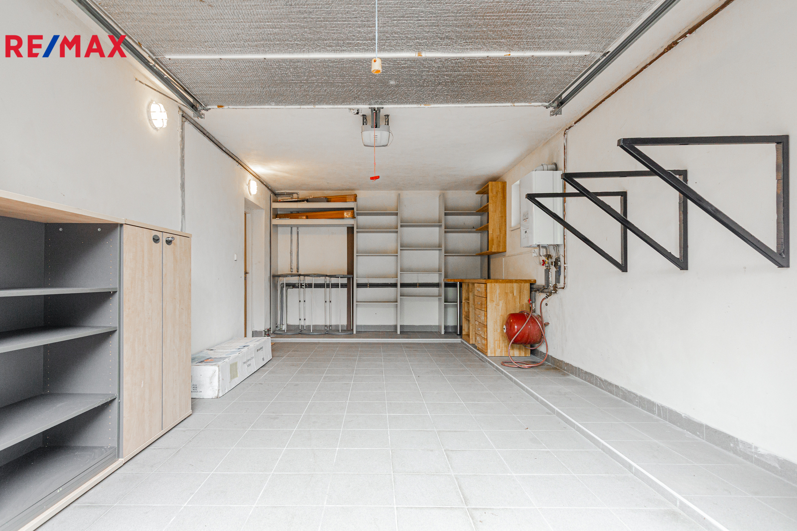 Dále je zde pokoj vhodný jako pokoj pro hosty či pracovna, koupelna se sprchovým koutem a toaletou, technická místnost, spižírna a přímý vstup do integrované garáže.