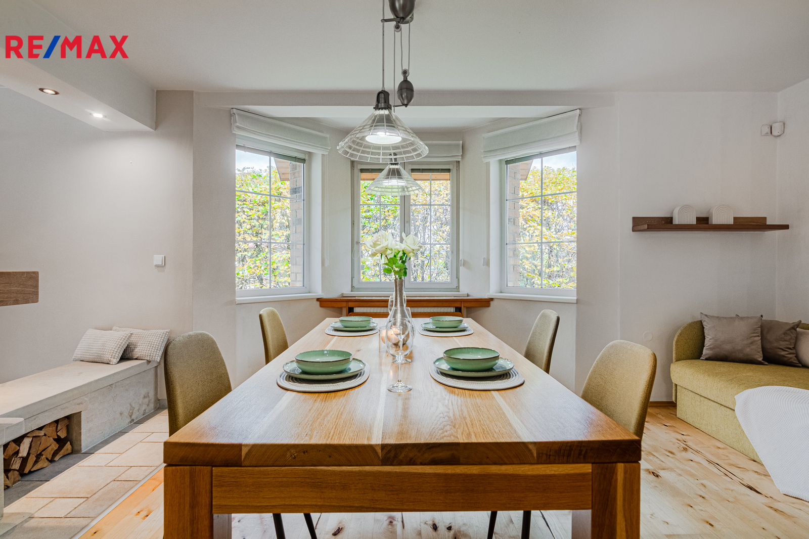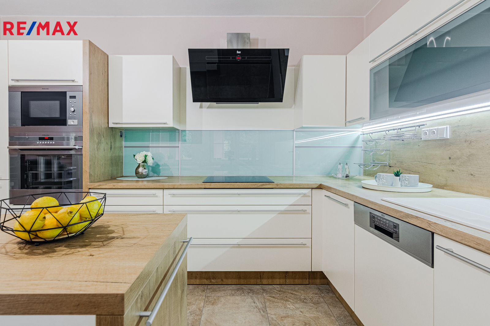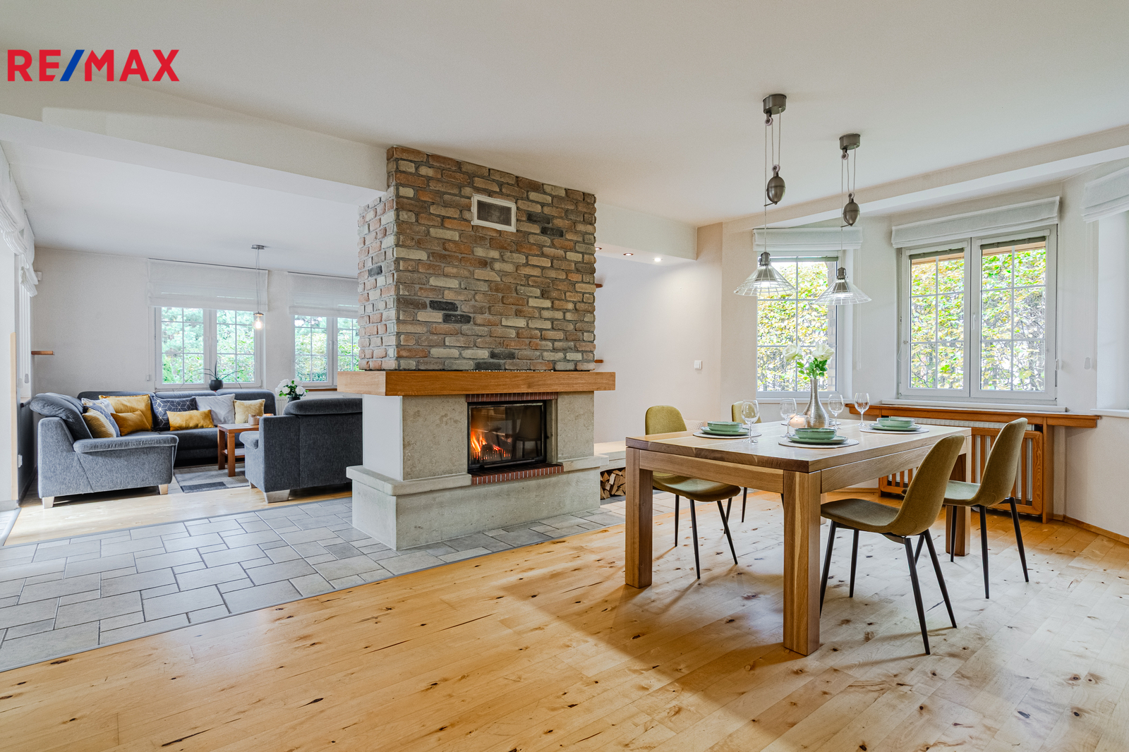 Přízemí se zádveřím a prostornou chodbou navazuje na velkorysý obytný prostor s jídelnou a krbem, který umí vytopit i horní místnosti díky rozvodům tepla. Na obývací část plynule navazuje kuchyně zhotovená na míru s praktickým ostrůvkem a barovým sezením. Kvalitní spotřebiče , dostatek úložného prostoru a čisté linie dělají z kuchyně srdce domu. Pocit tepla umocňuje kvalitní březová podlaha. Z obytné části domu se vstupuje na jižně orientovanou, zastřešenou terasu, jež přirozeně spojuje interiér se zahradou.
