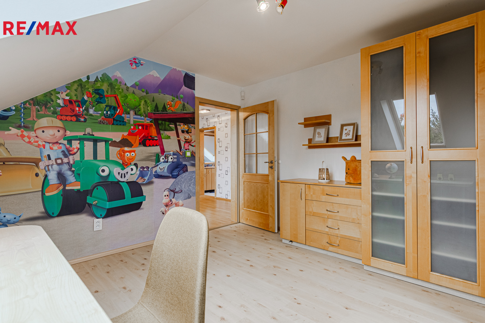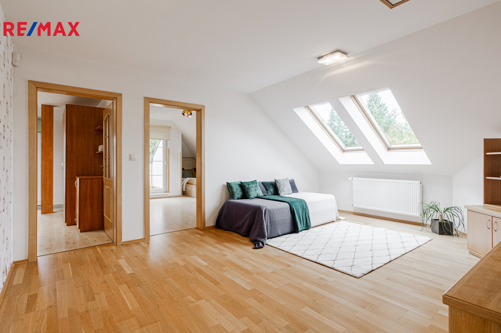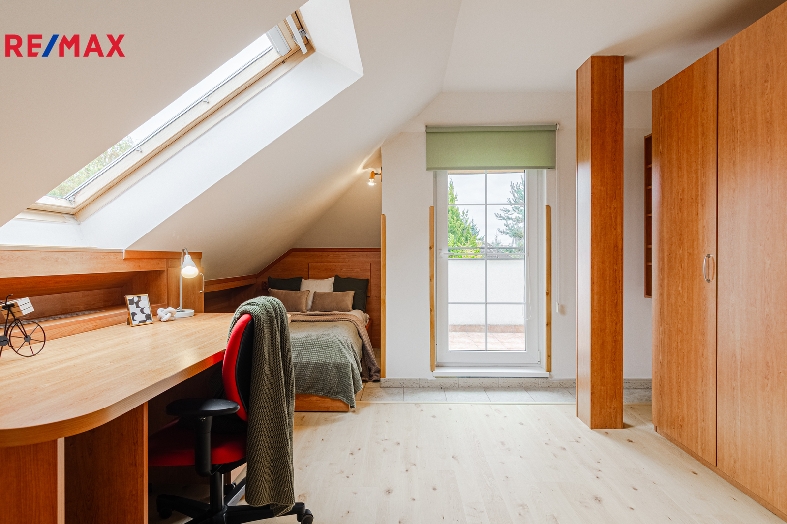 Po smrkovém schodišti vystoupáte do obytného podkroví. Tvoří ho klidová zóna se třemi pokoji: hlavní ložnicí s pracovnou a dvěma dětskými pokoji, dále koupelnou s vanou i sprchou a samostatným WC. Nechybí šatna a praktické úložné prostory v podhledech. Pokoje mají přímý vstup na bálkon. Interiér je vybaven kvalitním dřevěným nábytkem zhotoveným na míru. Z masivního dubového dřeva jsou zhotoveny i podlahy.