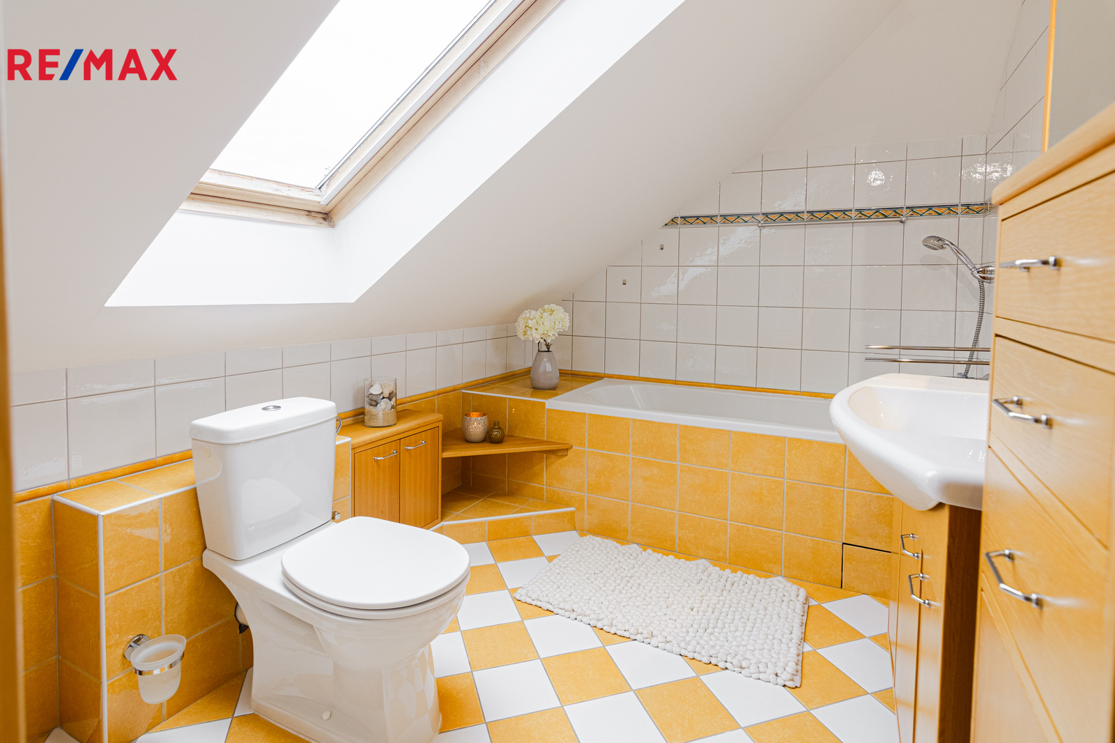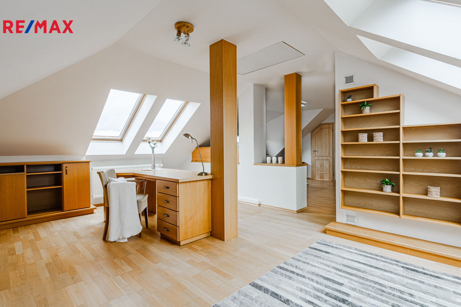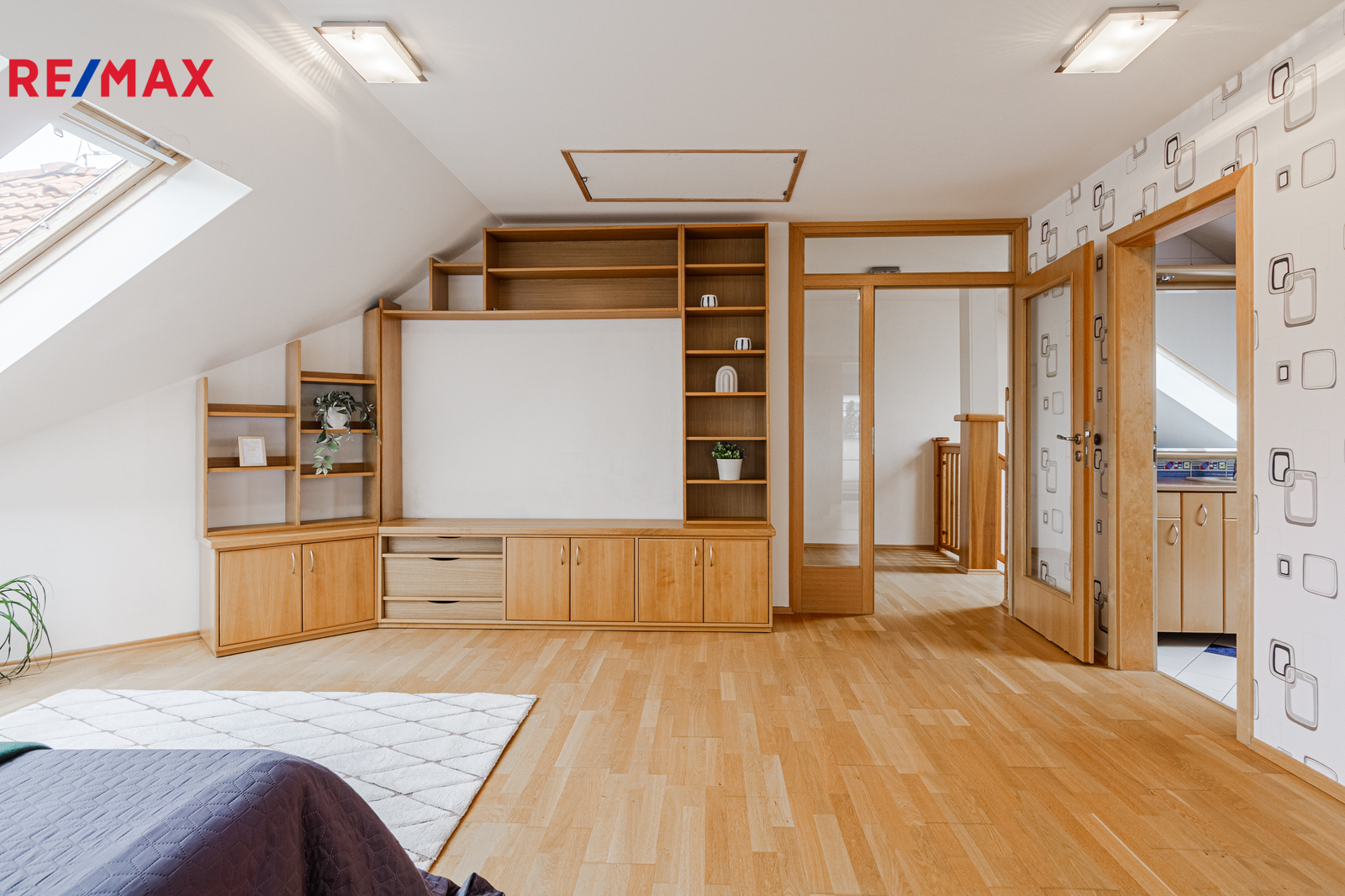 Po smrkovém schodišti vystoupáte do obytného podkroví. Tvoří ho klidová zóna se třemi pokoji: hlavní ložnicí s pracovnou a dvěma dětskými pokoji, dále koupelnou s vanou i sprchou a samostatným WC. Nechybí šatna a praktické úložné prostory v podhledech. Pokoje mají přímý vstup na bálkon. Interiér je vybaven kvalitním dřevěným nábytkem zhotoveným na míru. Z masivního dubového dřeva jsou zhotoveny i podlahy.