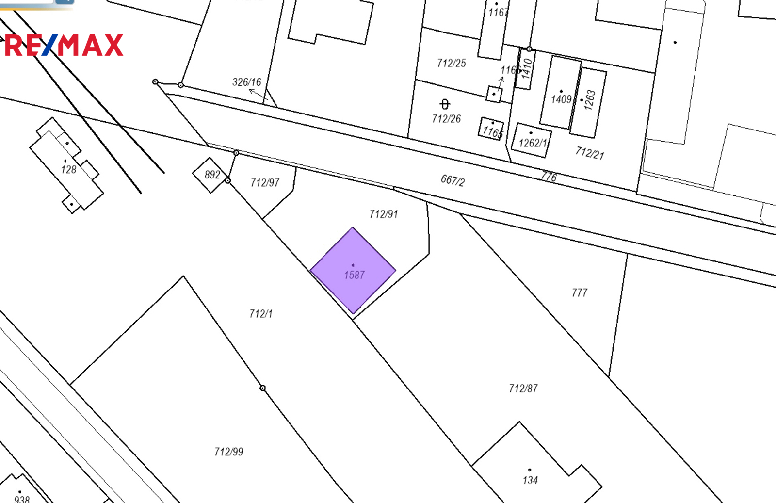 Rovinný pozemek tvaru písmene V, jež je vklíněn mezi přístupovou silnicí (ulice Vítězství) a
