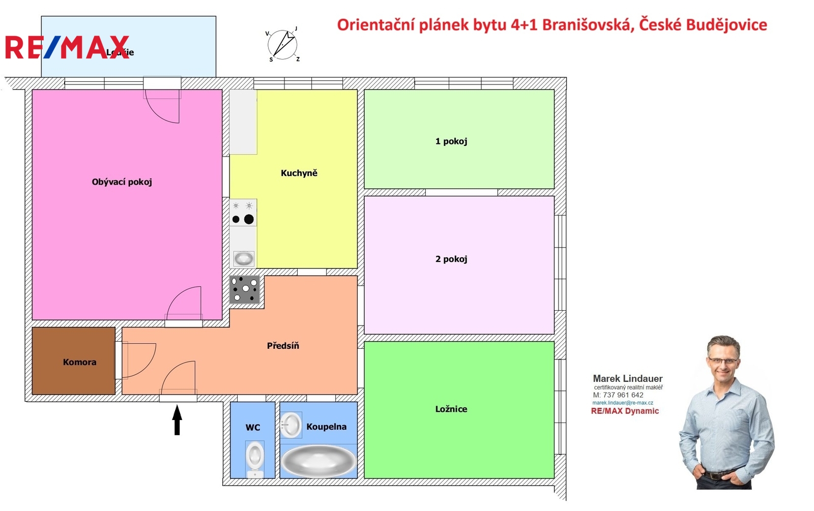 Nabízím k prodeji byt 4+1, ulice Branišovská, 88,34 m2, osobní vlastnictví, 1. patro s výtahem, lodžie, komora.