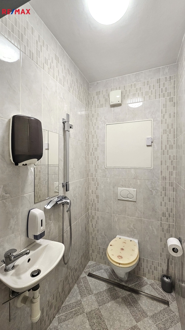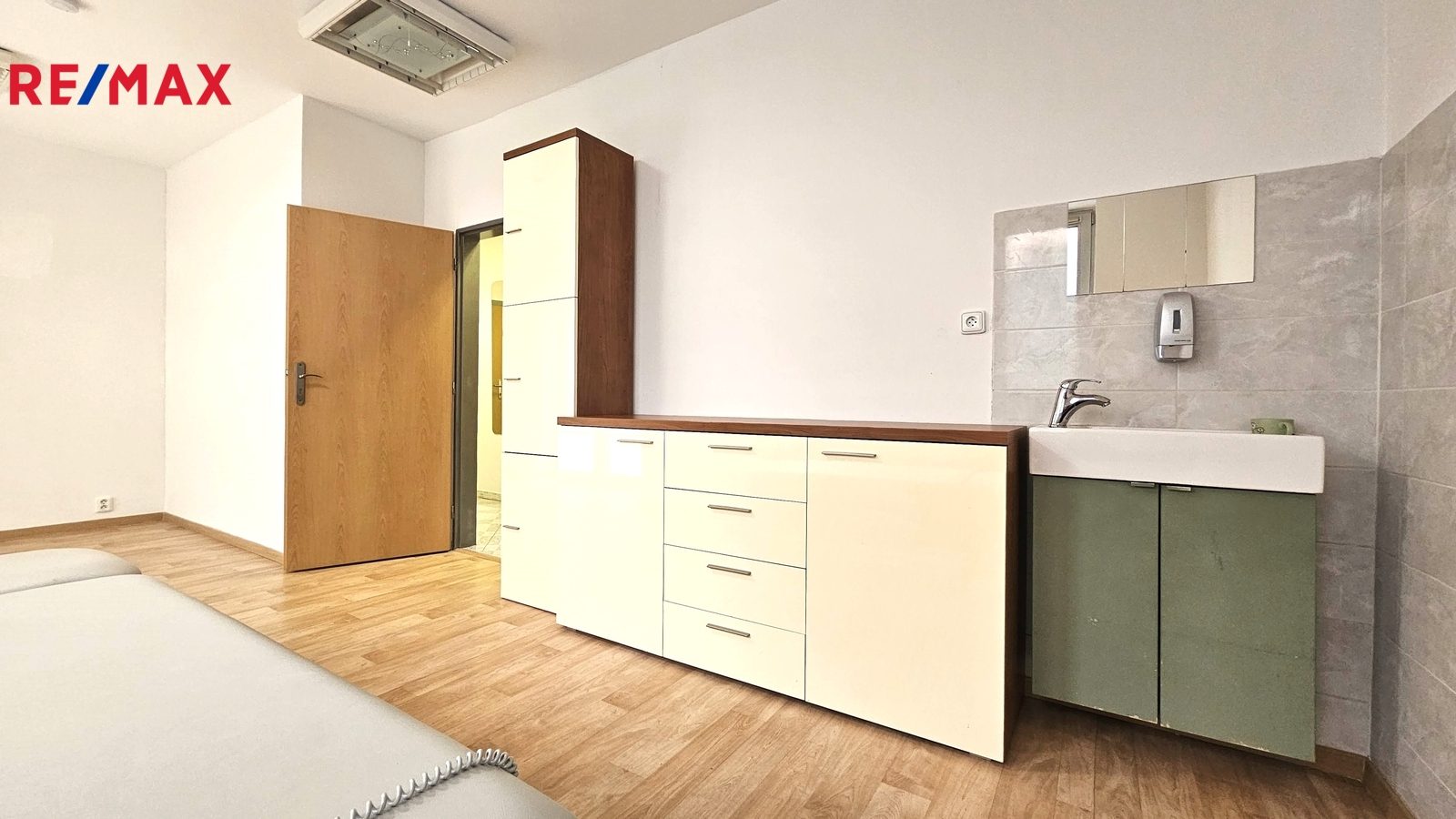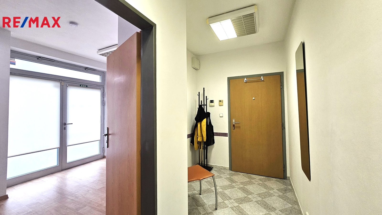 Jednotka má dva vchody, jeden z ulice, druhý z vnitřku domu a je velmi prakticky provedená. Sestává z prostorné předsíně, samostatné místnosti, kde je nyní umyvadlo, je možné zde udělat kuchyňský kout a samostatné toalety s umyvadlem a sprchou. Jednotka je hezky prosvětlená, díky velkým oknům a skleněným dveřím. Na oknech i dveřích je kromě rolety i diskrétní fólie, díky které do jednotky z klidné ulice není vidět.