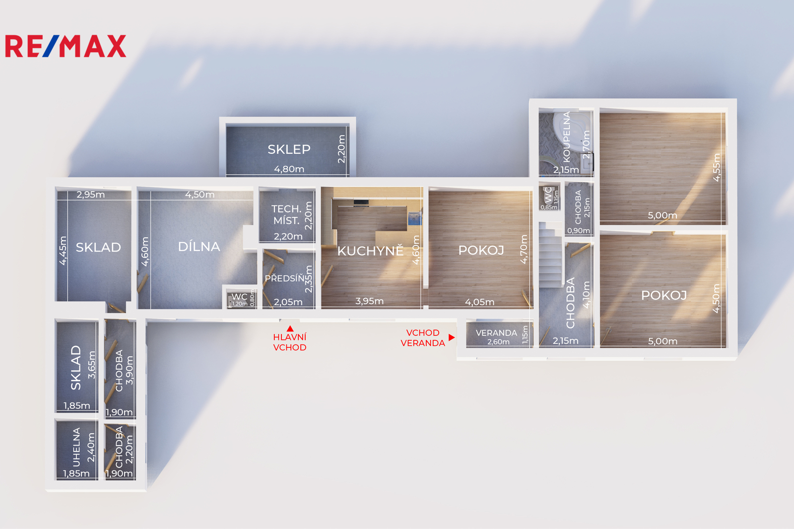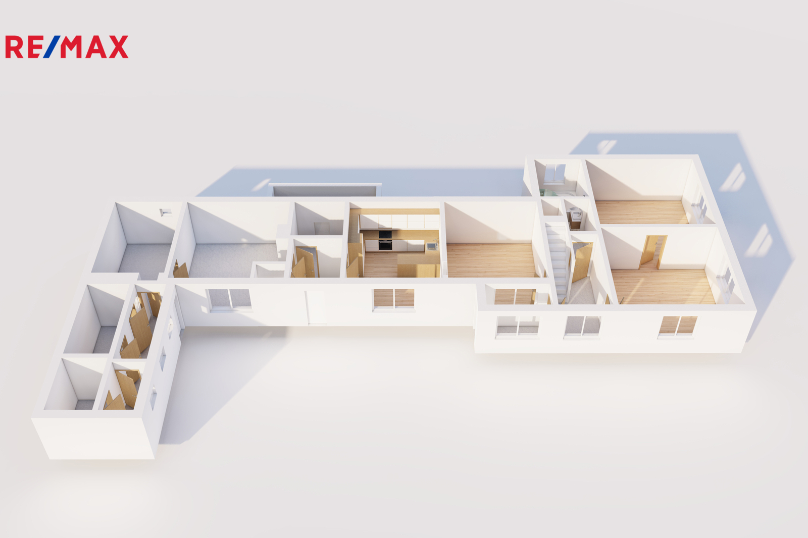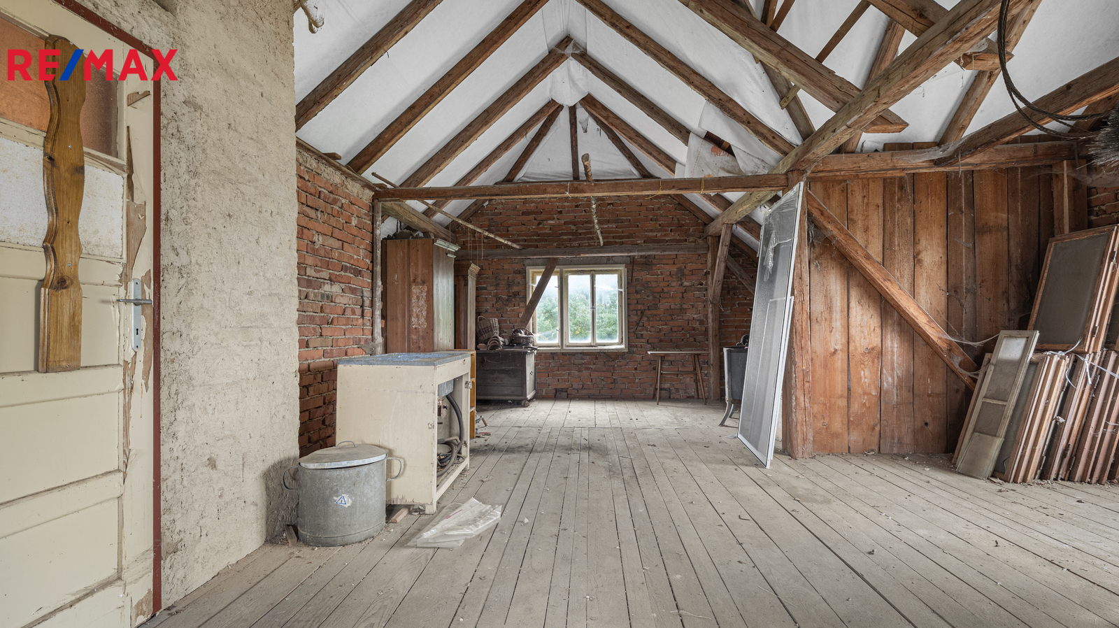 Dům působí na první pohled příjemně a domácky. V obytné části se nachází tři samostatné pokoje, prostorná kuchyně s kuchyňskou linkou na míru, koupelna s rohovou vanou i sprchovým koutem a samostatné WC. Interiér je prakticky řešený, světlý a přirozeně propojuje obytnou část s hospodářským zázemím. Velkou výhodou je půda, kam vedou nové jasanové schody – prostor je připravený pro případnou vestavbu dalších pokojů nebo ateliéru. V levé části domu se nachází technická místnost, dílna a sklad, které lze jednoduše přeměnit na pracovnu, šatnu nebo místo pro vaše koníčky. Pod částí domu se nachází menší kamenný sklep, ideální pro uskladnění potravin nebo vína.