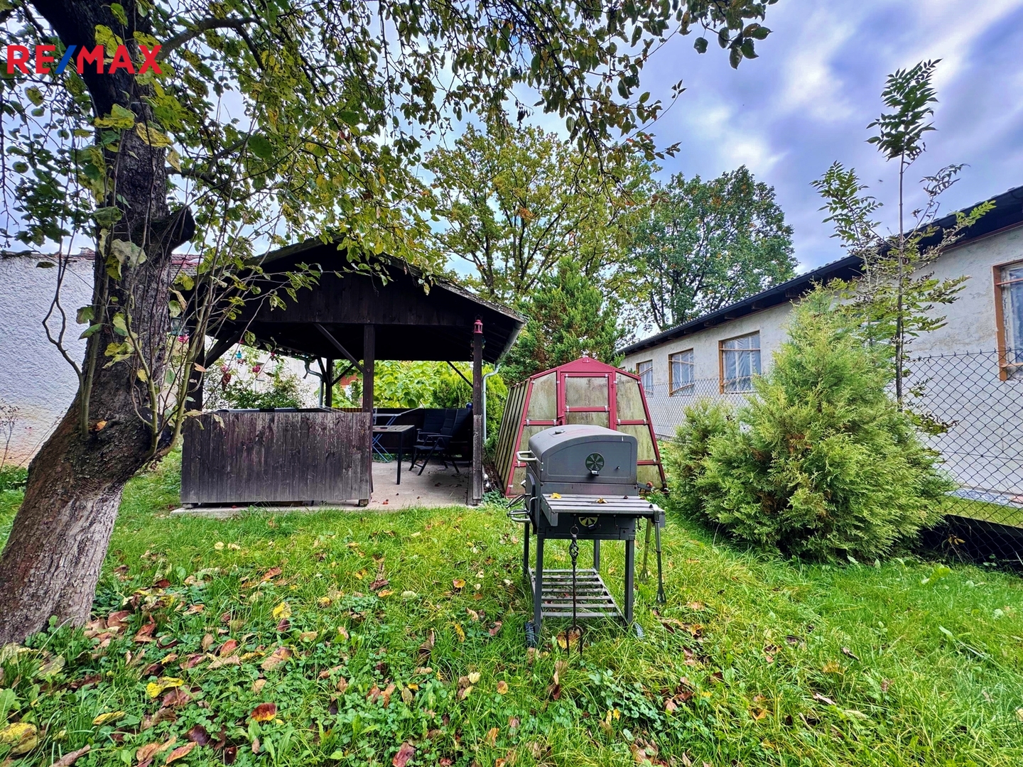 Součástí pronájmu je i rozlehlá zahrada o výměře 847 m2, na které je k dispozici venkovní posezení v altánu, možnost přípravy pokrmů v grilu, je zde i úložný prostor pro zahradní techniku spojený s dílnou.