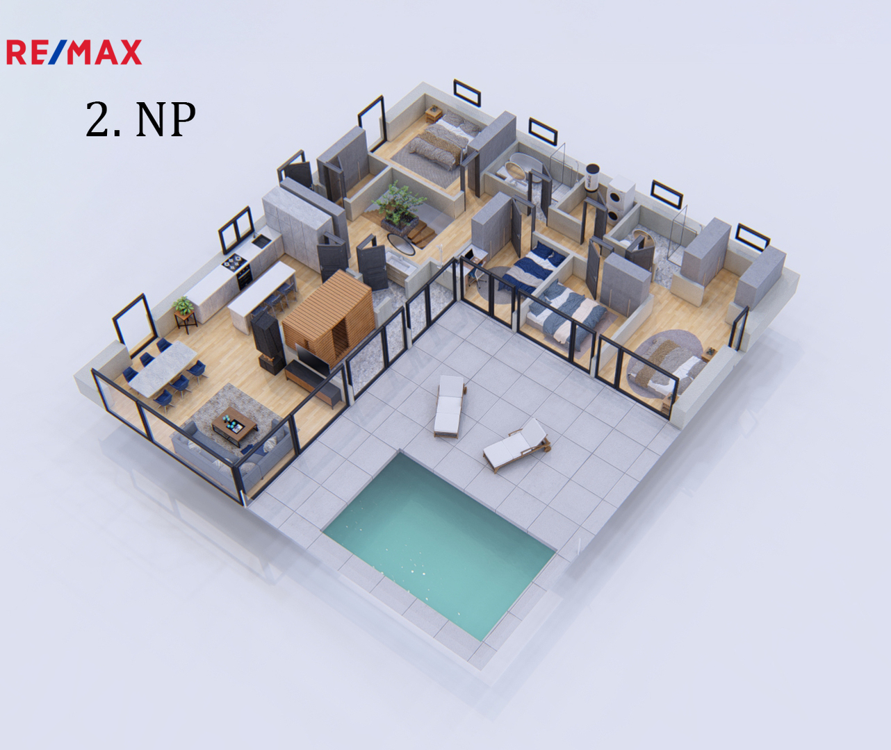 Součástí je i hlavní ložnice s walk-in šatnou a vlastní koupelnou, další dva pokoje, pracovna, dvě koupelny, vstupní hala a technické zázemí. Ze všech obytných místností je přímý vstup na terasu, takže propojení interiéru s exteriérem působí naprosto přirozeně.