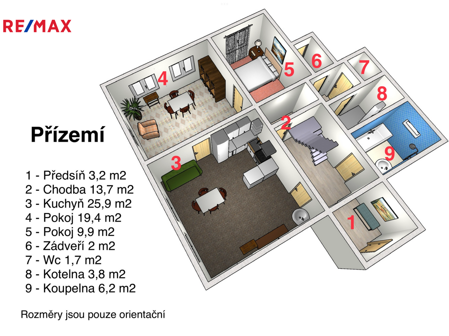1. NP: hlavní vchod, předsíň, bytová jednotka 3+kk, koupelna, samostatné WC, kotelna, vstup na zahradu, schodiště do 2. NP