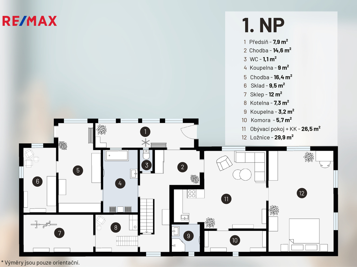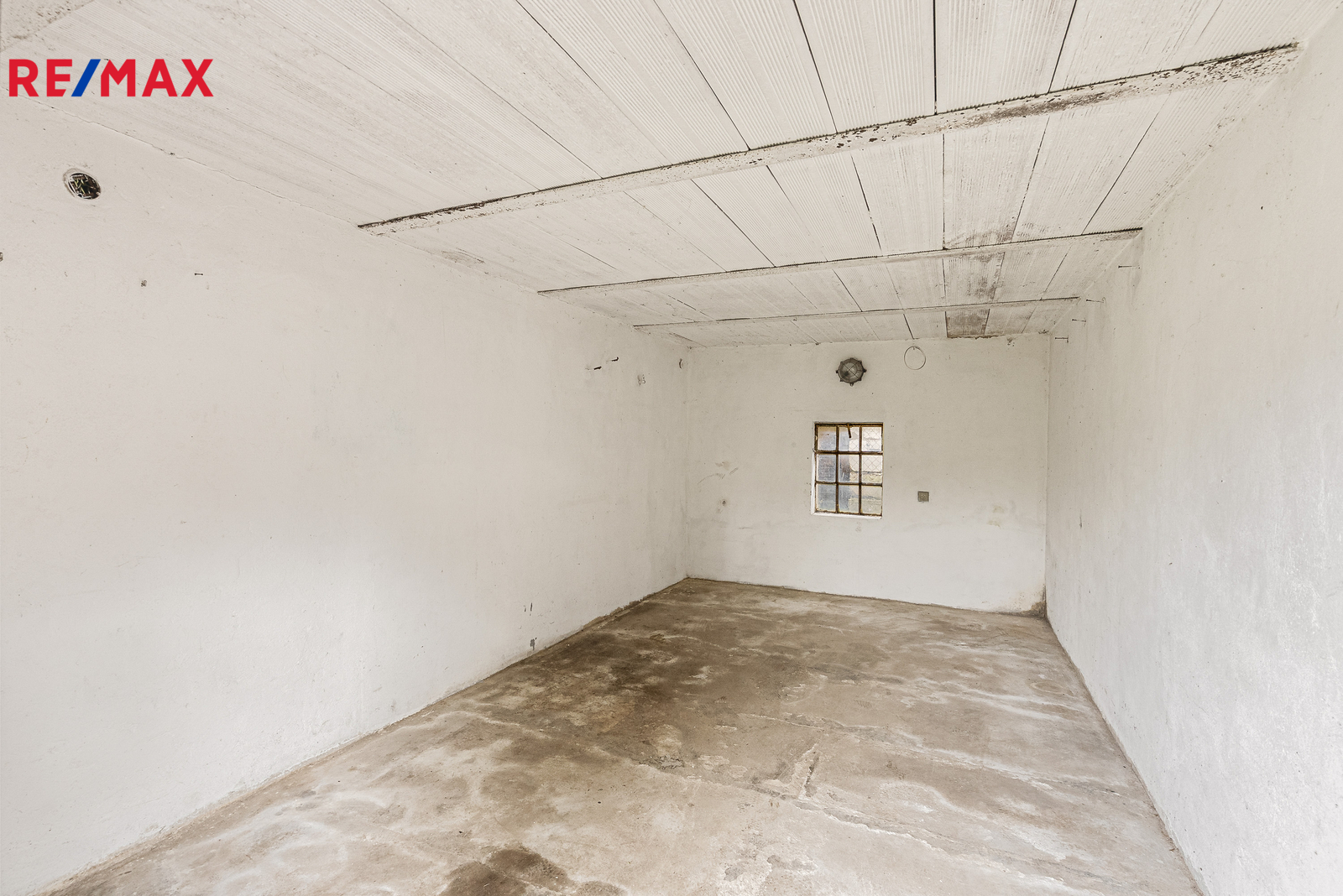 • Předsíň, chodba, WC, koupelna, chodba, kuchyň spojená s obývacím pokojem, ložnice, komora + skladovací a sklepní prostory.