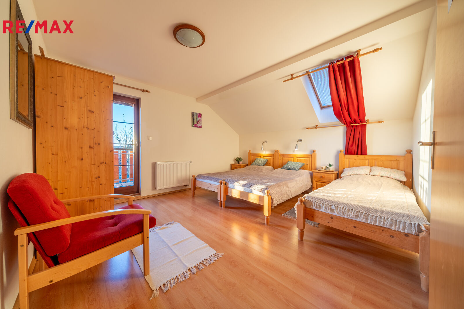 1. patro: tři ložnice (dvě s přístupem na balkon s výhledem na Lipno), koupelna s vanou a WC.