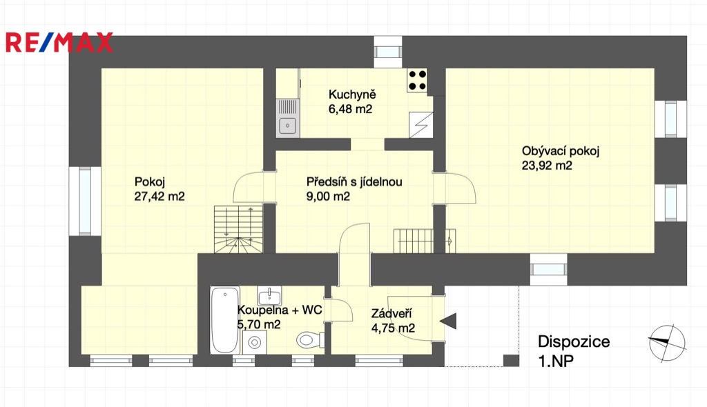 Dispozice 1.NP: zádveří (4,75 m2), předsíň s jídelnou (9,00 m2), kuchyně (6,48 m2), obývací pokoj (23,92 m2), pokoj (27,42 m2), koupelna s WC (5,70 m2), sklep (15,80 m2).