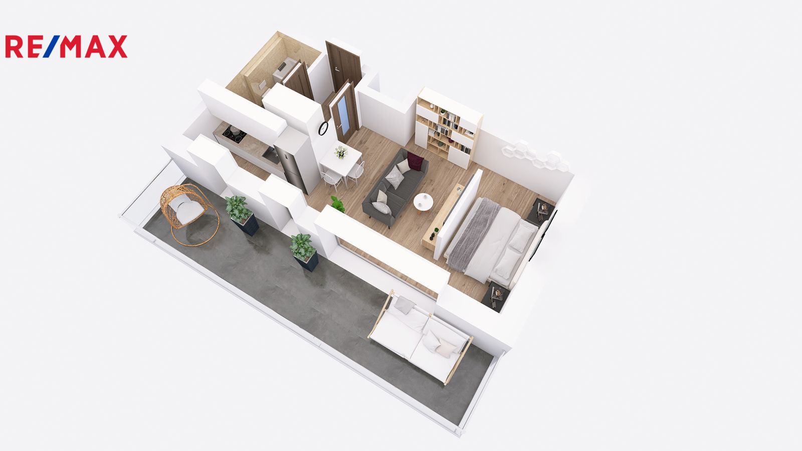 Jedná se o bytovou jednotku 1+kk o podlahové ploše 53 m2 s lodžií (16 m2) ve 2. patře ze 3. NP, orientovanou na JV stranu. Dispozičně je členěna na prostornou obývací místnost s vybavenou kuchyňskou linkou (elektrický sporák, digestoř), chodbu a sociální zařízení. Po celé ploše bytu byla položena plovoucí podlaha a dlažba. Osvětlení je řešeno formou LED světel, které lze regulovat dálkovým ovladačem. Termostatem, který je umístěný v obývací místnosti, lze nastavit teplotu v jednotce.
