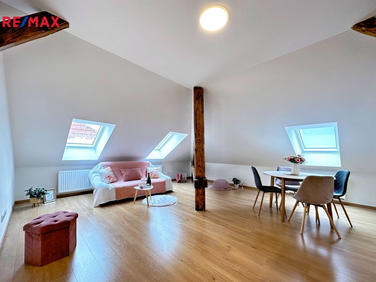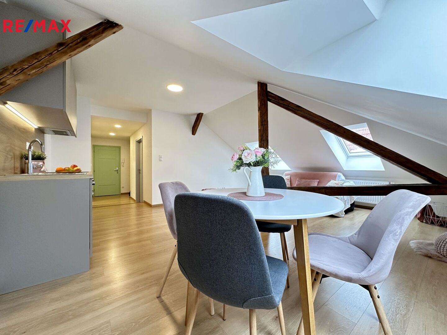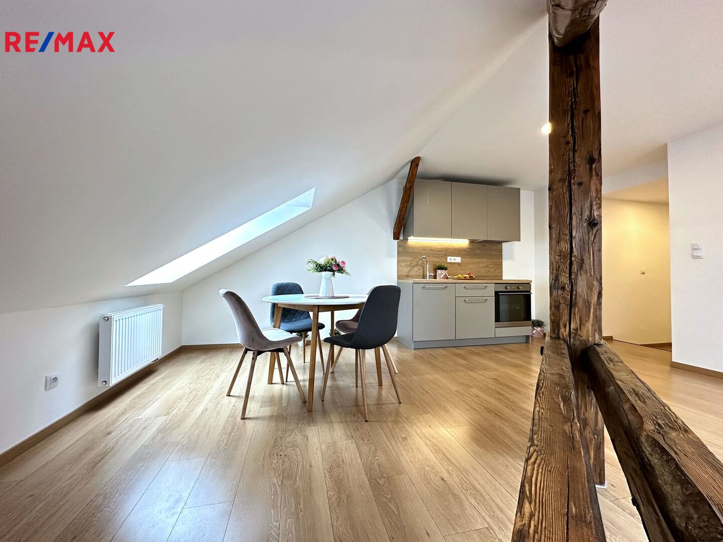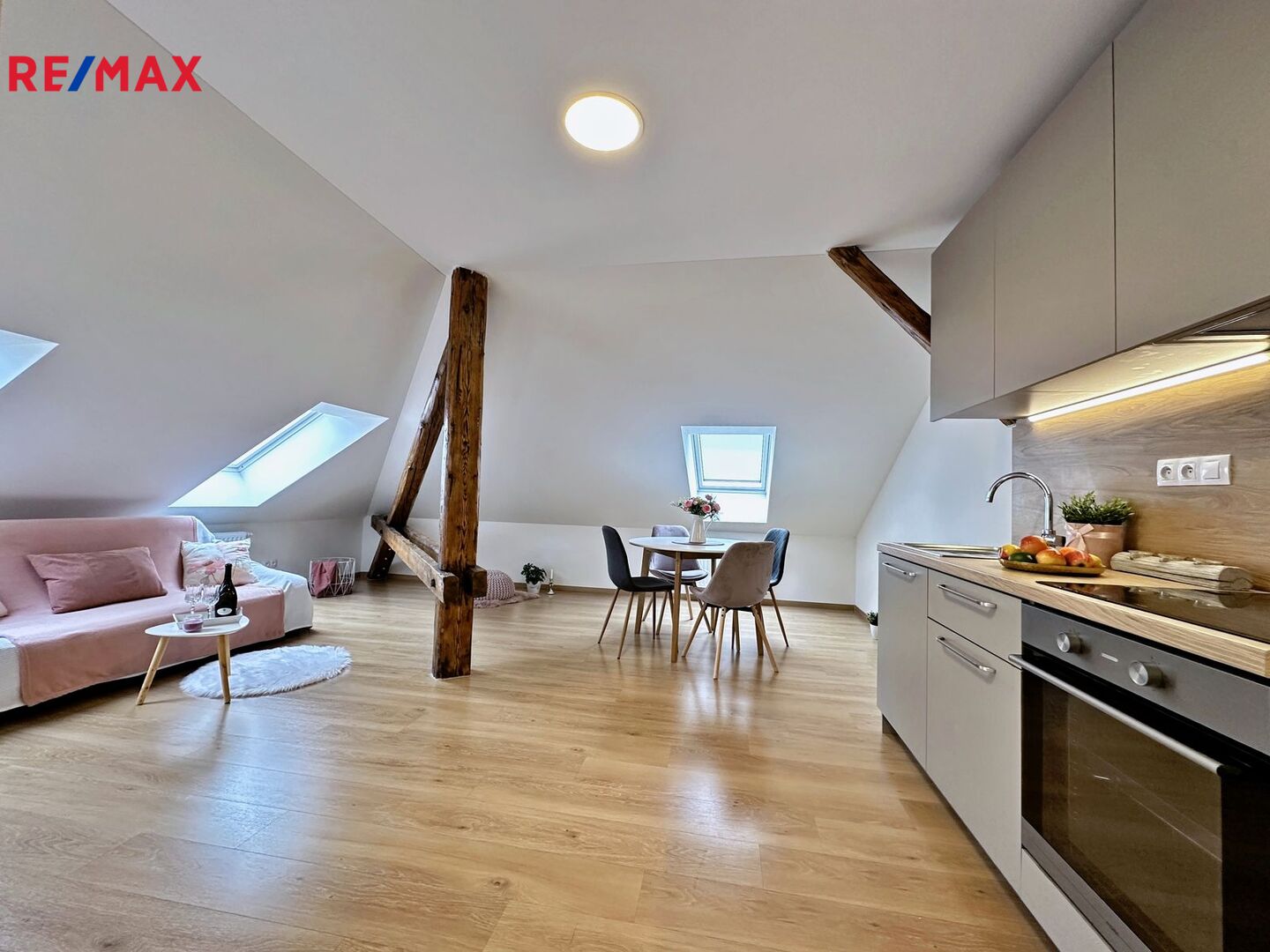 Celková podlahová plocha bytu je přibližně 60 m2. Podkrovní bytová jednotka se skládá z obytného pokoje s kuchyňským koutem, ložnice, koupelny s WC a předsíně. Byt se nabízí nezařízený, v kuchyni je kuchyňská linka s indukční deskou.
