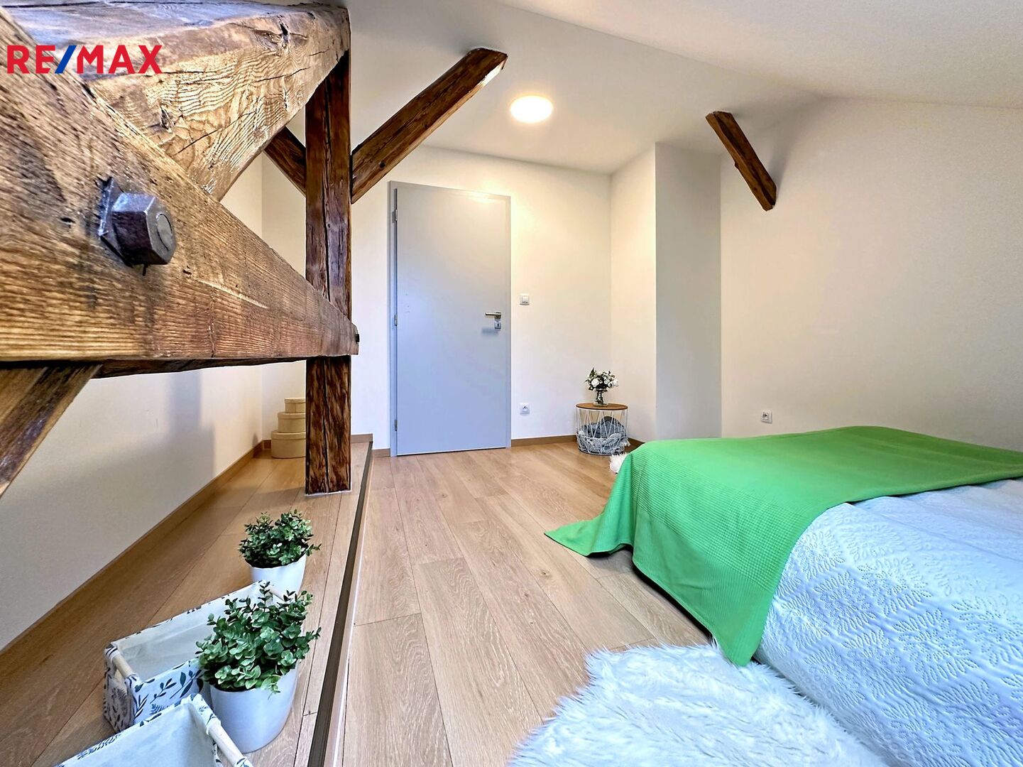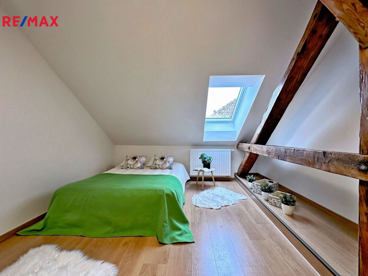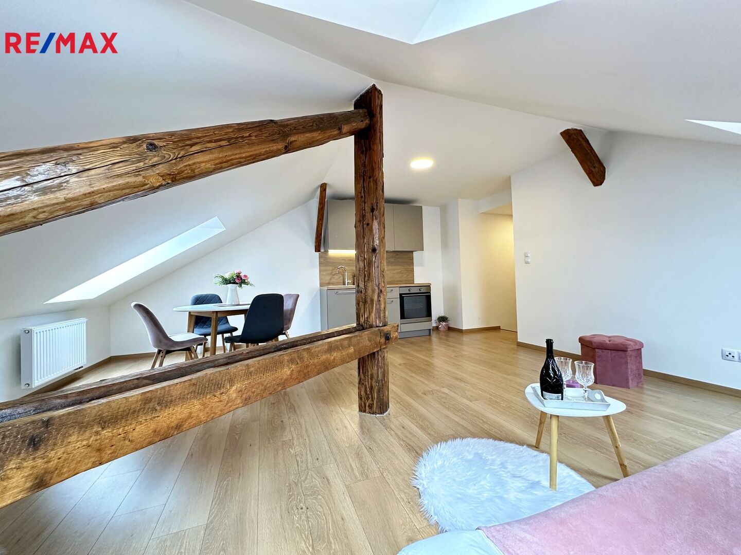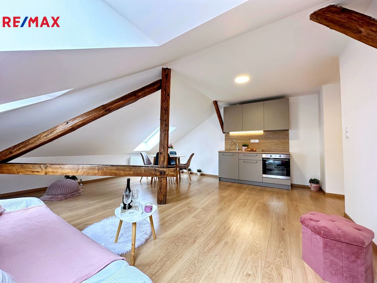 Celková podlahová plocha bytu je přibližně 60 m2. Podkrovní bytová jednotka se skládá z obytného pokoje s kuchyňským koutem, ložnice, koupelny s WC a předsíně. Byt se nabízí nezařízený, v kuchyni je kuchyňská linka s indukční deskou.