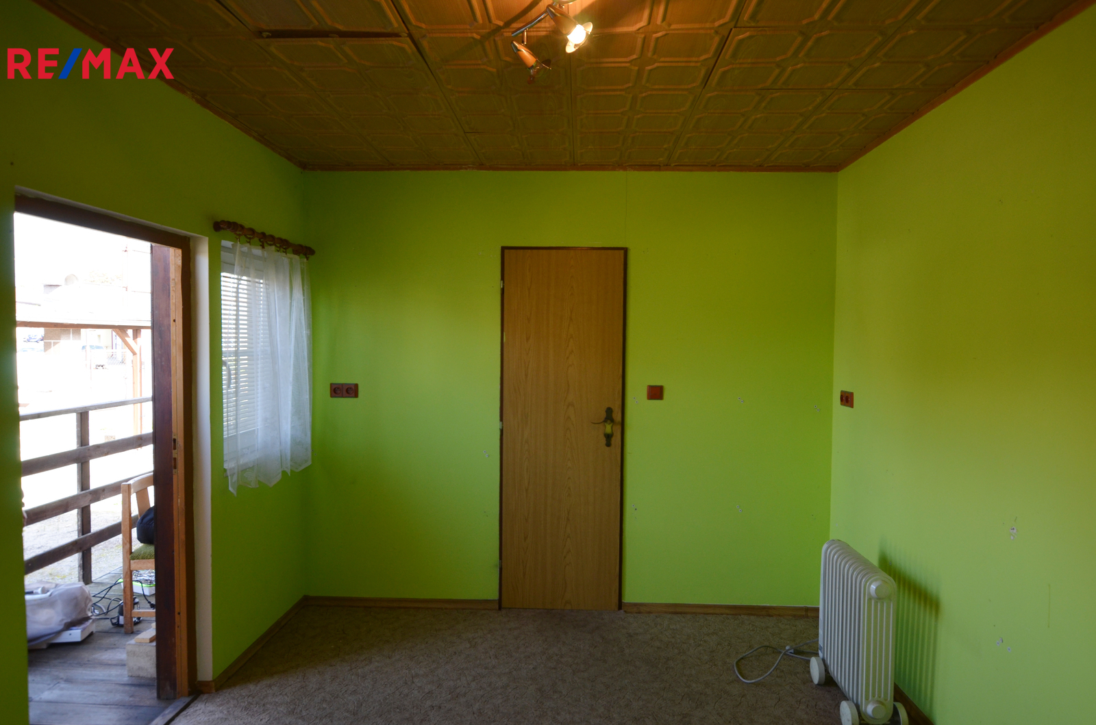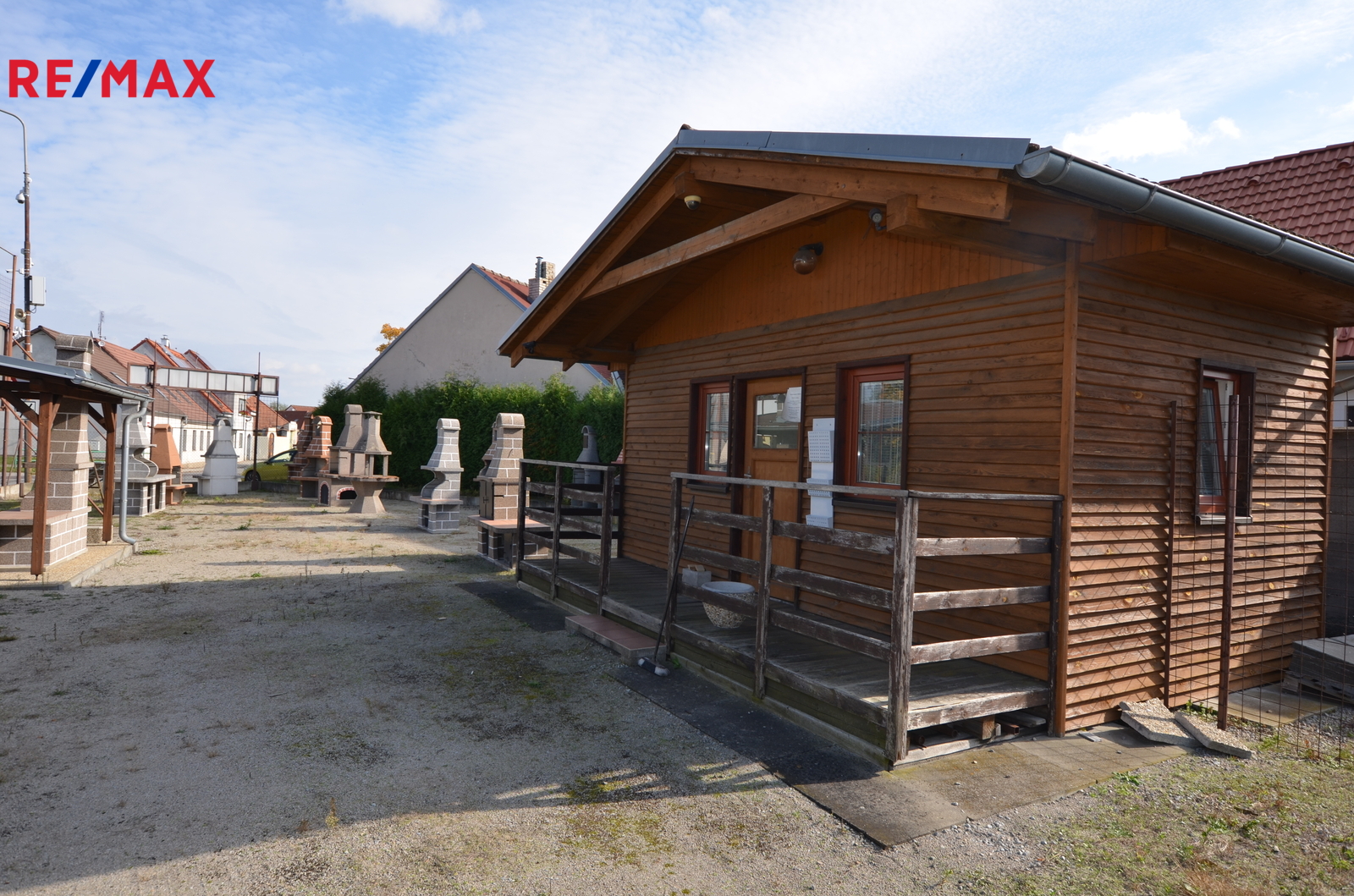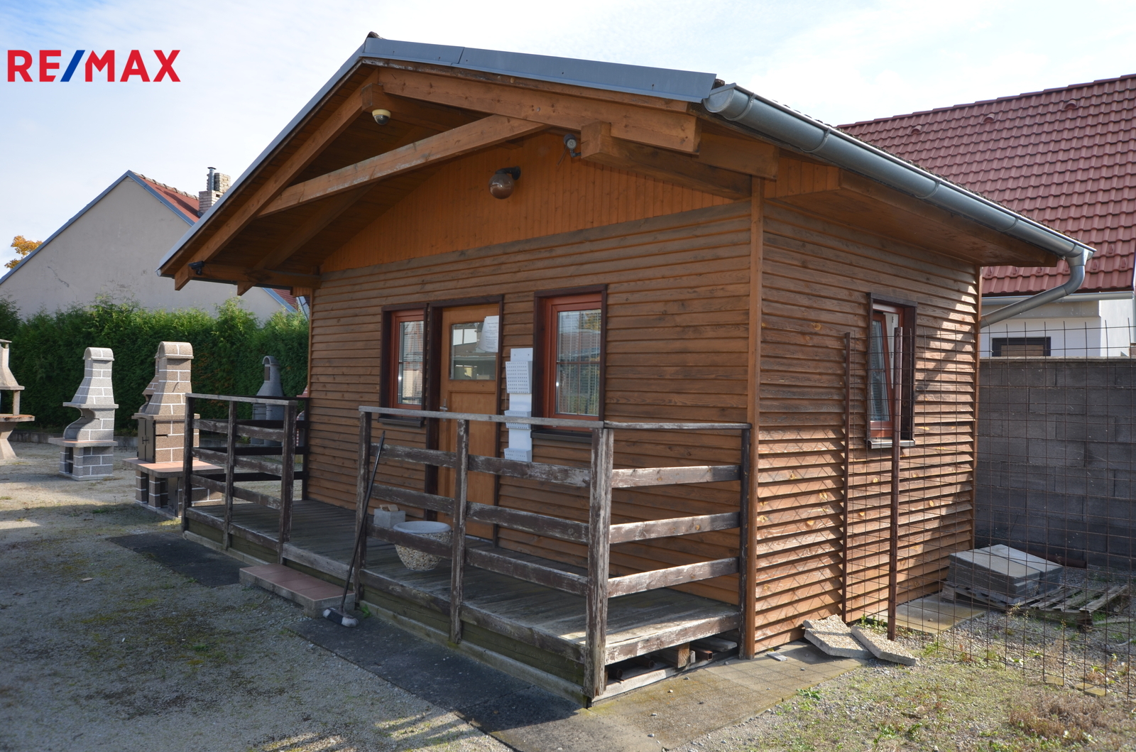 Součástí pozemku je dřevěná chatka se zastavěnou plochou cca 19 m² (5,7 m x 3,4 m), která disponuje místností, kterou lze využít např. jako kancelář, a sociálním zázemím (toaleta, umyvadlo, sprchový kout). Chatka je napojena na elektřinu, vodu a kanalizaci. Ohřev vody pomocí bojleru.