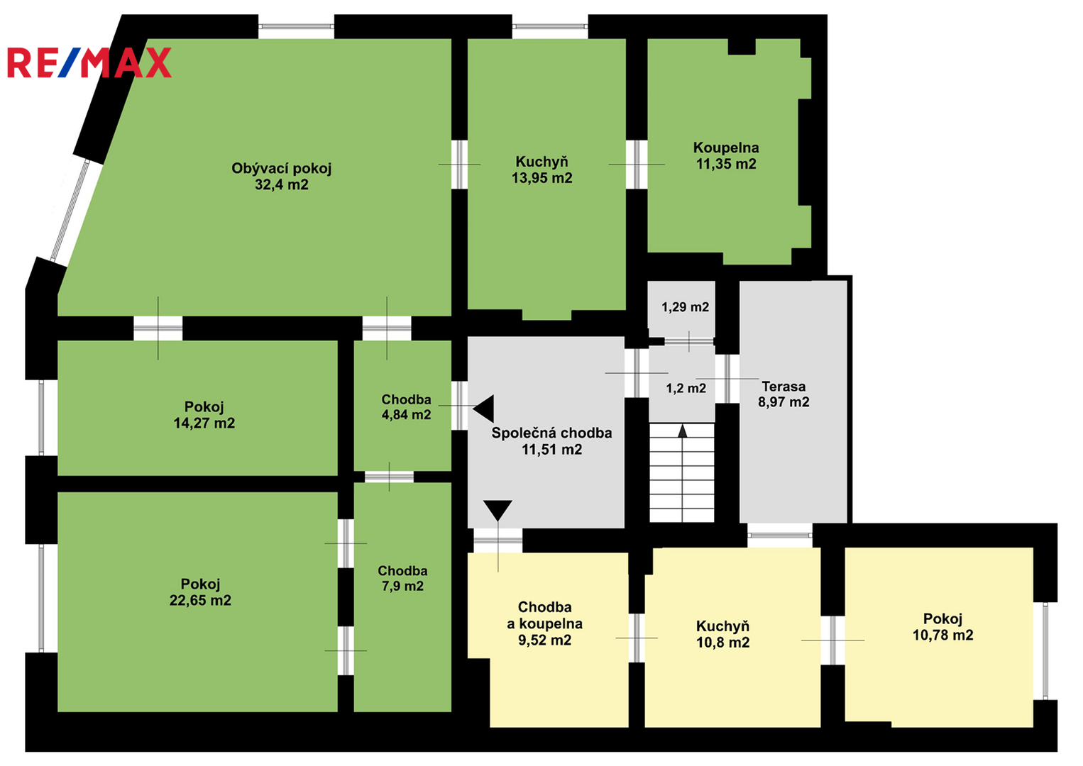 V horním patře momentálně najdete 2 byty, společnou chodbu a terasu. Byty je možné propojit do jednoho velkého o dispozici 5+1.