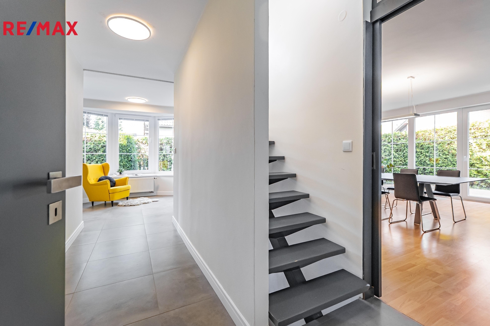 V přízemí nemovitosti se nachází místnosti pro využití během dne - pracovna, obývák, kuchyně, jídelna, či terasy.