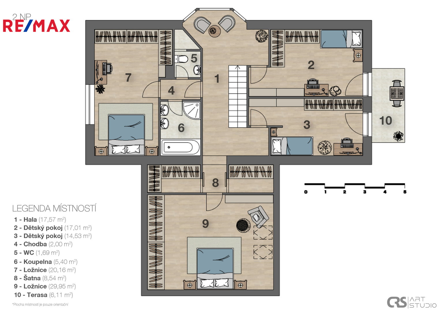 Horní část nemovitosti poté nabízí relaxační část, kde se nachází 2 dětské pokoje, 2 ložnice a šatny s koupelnou a WC.