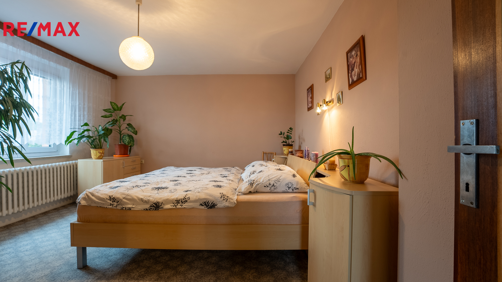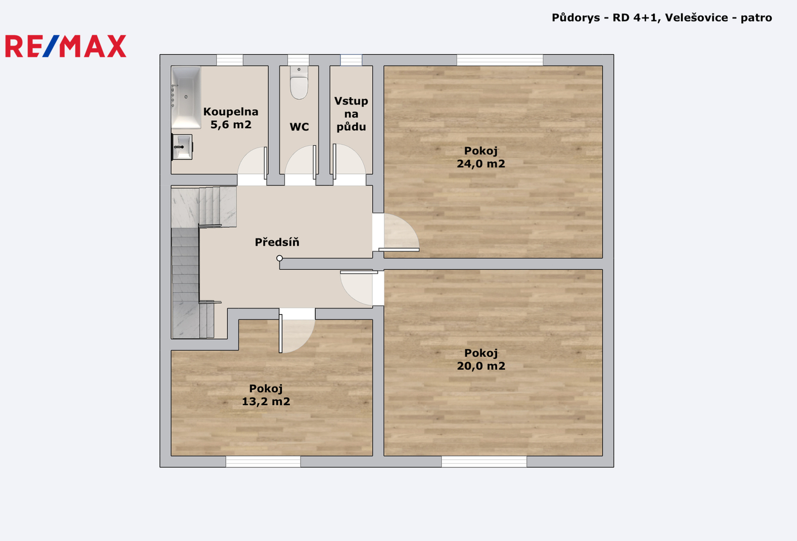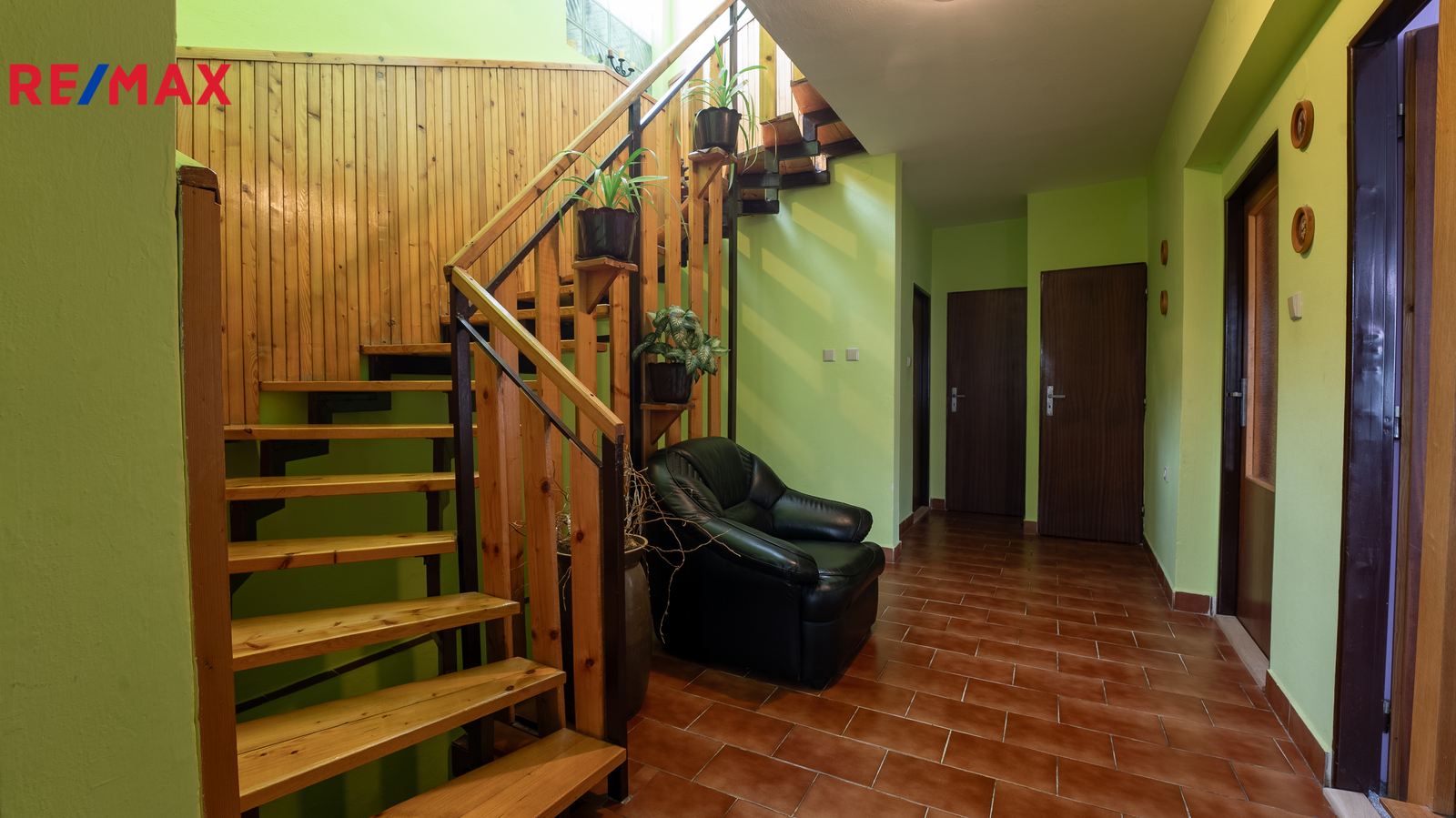 Do 2. NP vyjdeme po dřevěném schodišti, které je umístěno v chodbě za vstupem do nemovitosti, kde jsou tři samostatné pokoje, druhá koupelna (vana, umývadlo) a toaleta.