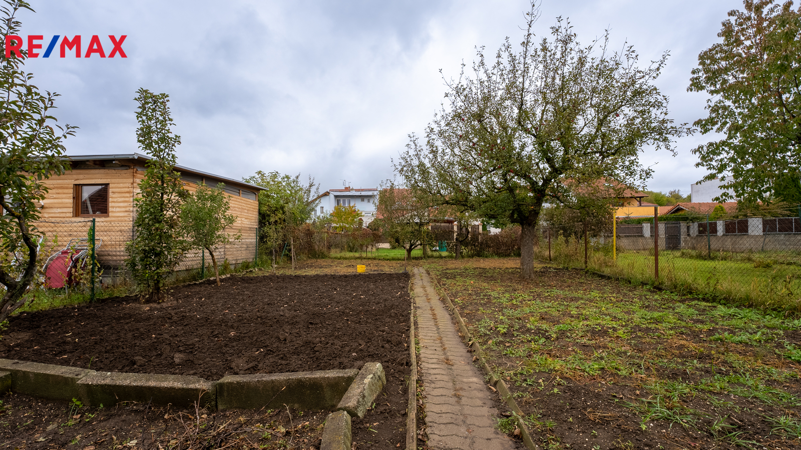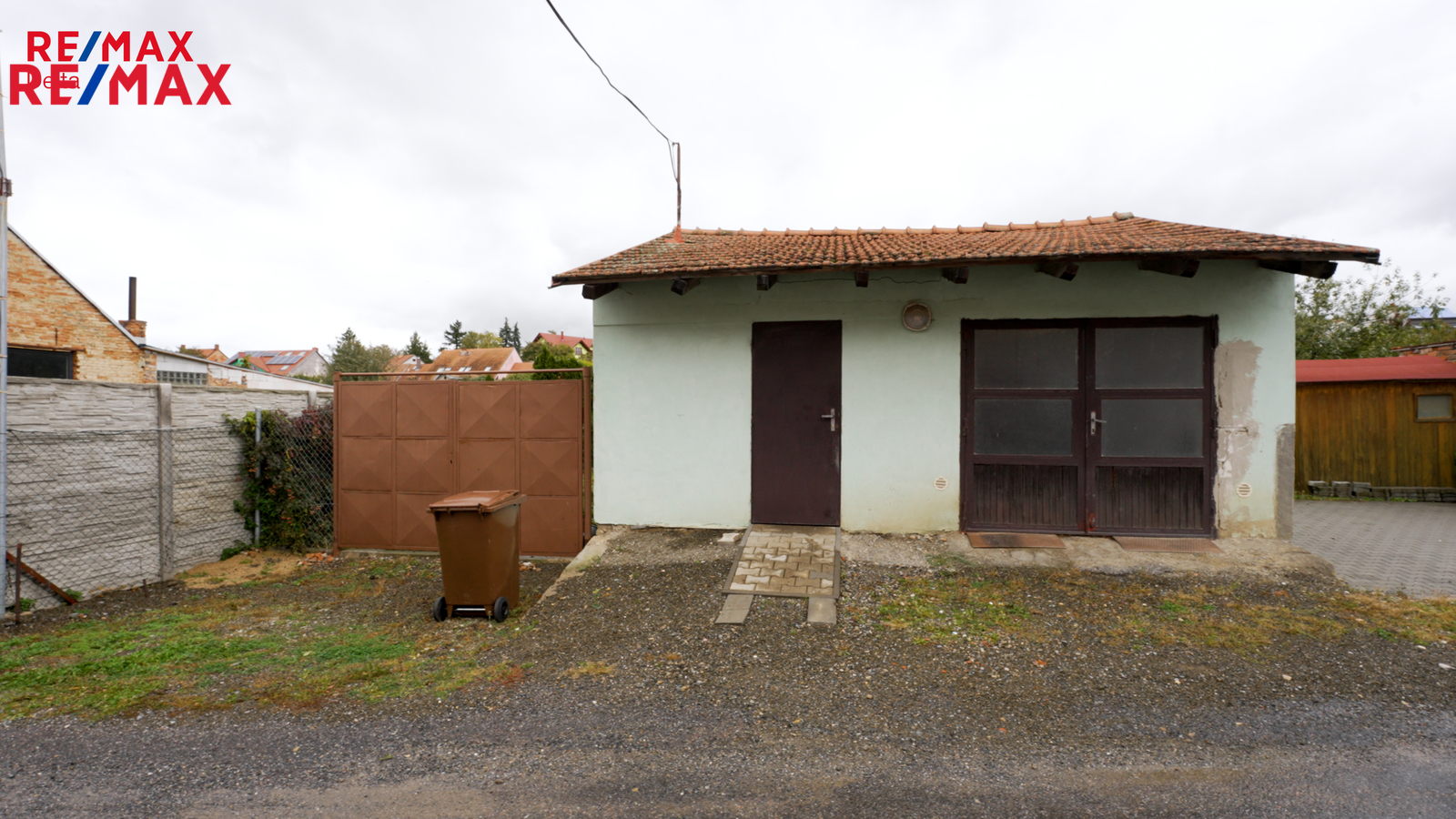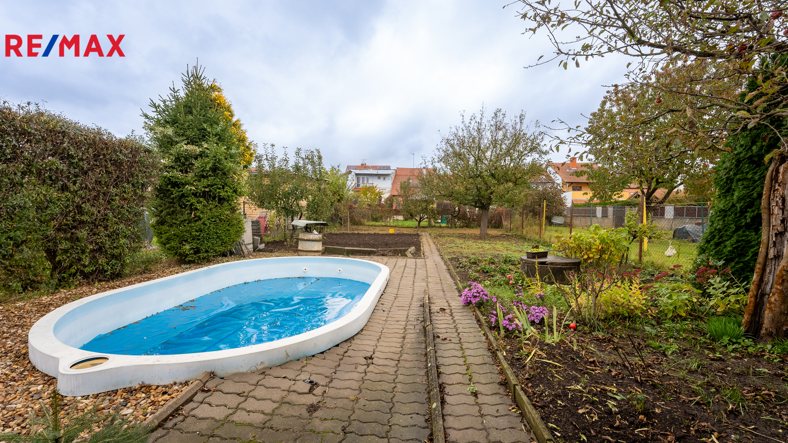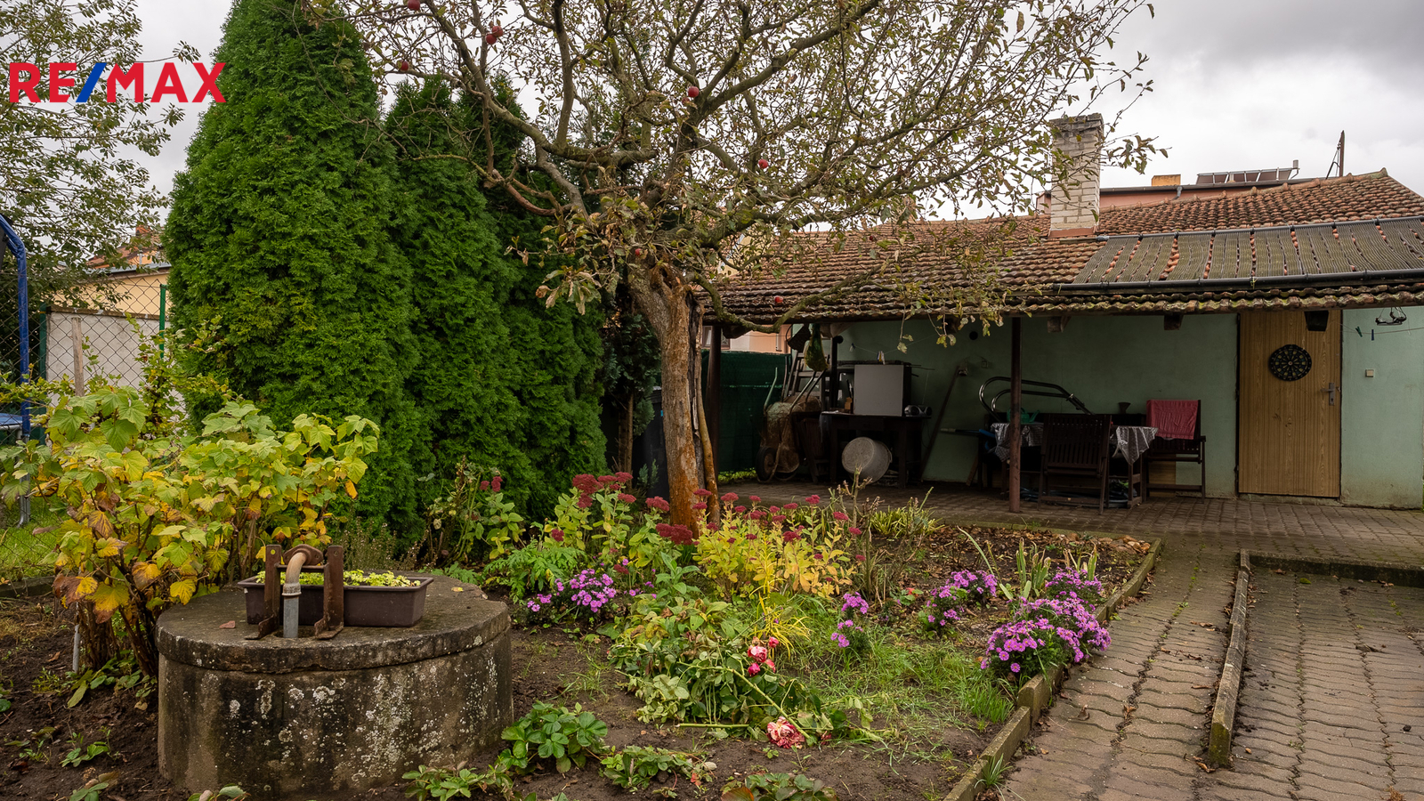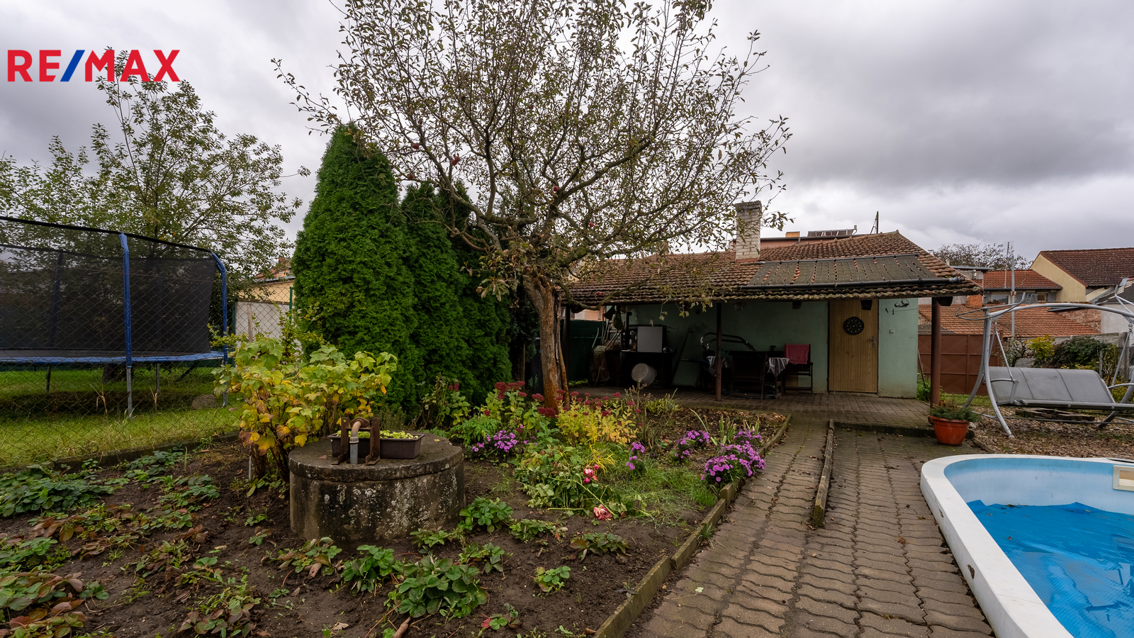 Za domem je uzavřený dvorek s pergolou, ze kterého, přes obecní cestu, vyjdeme na zahradu, kde je umístěna garáž, zastřešené posezení, bazén a užitková zahrada.