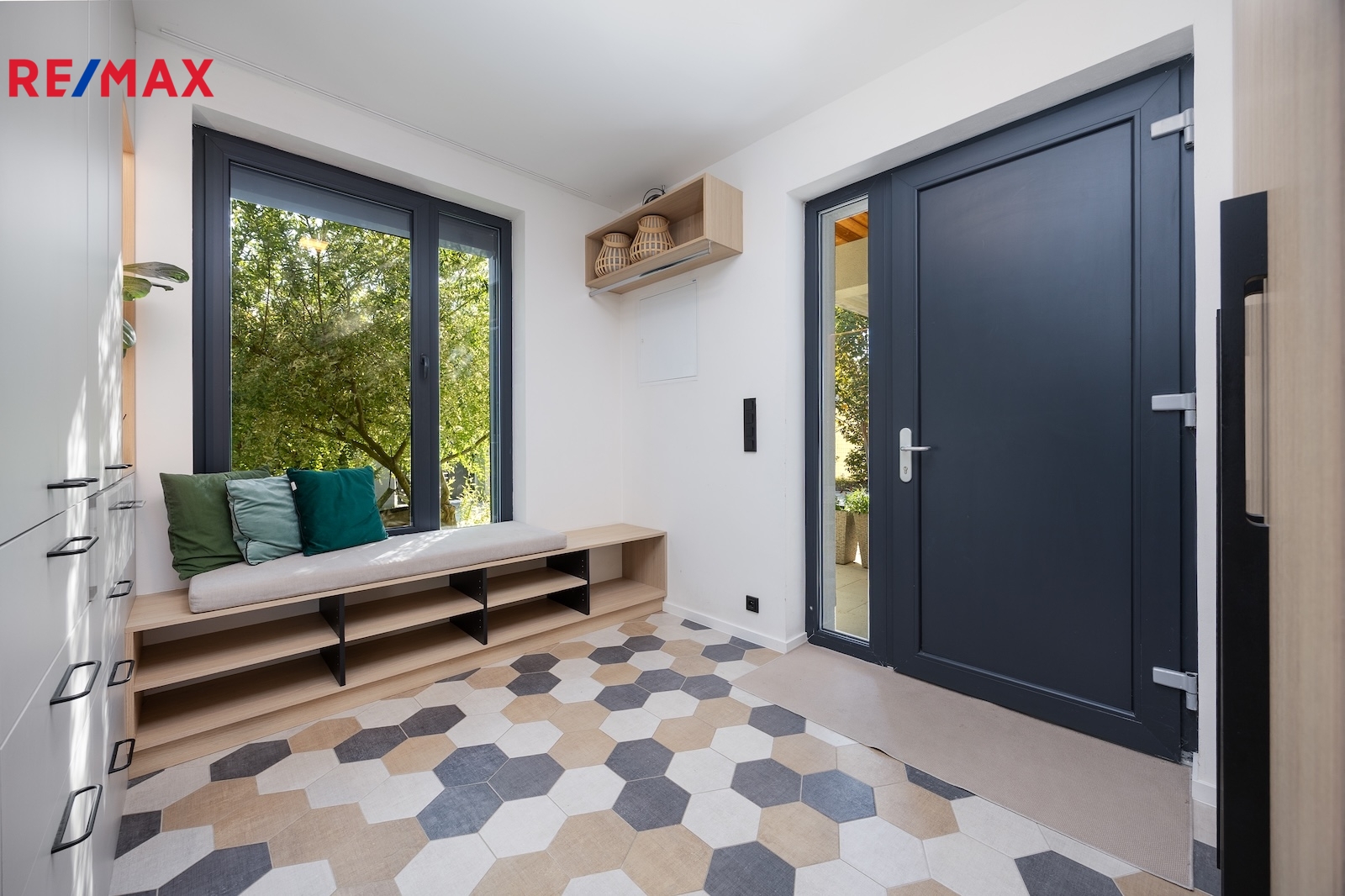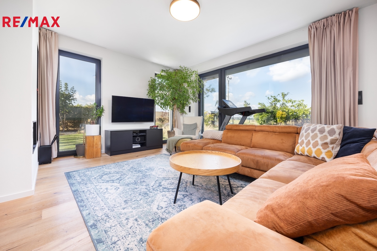 Kuchyňská linka je vybavena špičkovými vestavěnými spotřebiči De Dietrich, na podlahách byly použitý kvalitní třívrstvé dubové lamely nebo italské keramické dlažby. Velkoformátová okna s izolačním trojsklem propojují tuto část domu s venkovní terasou a navazující zahradou, která byla navržena zahradním architektem.