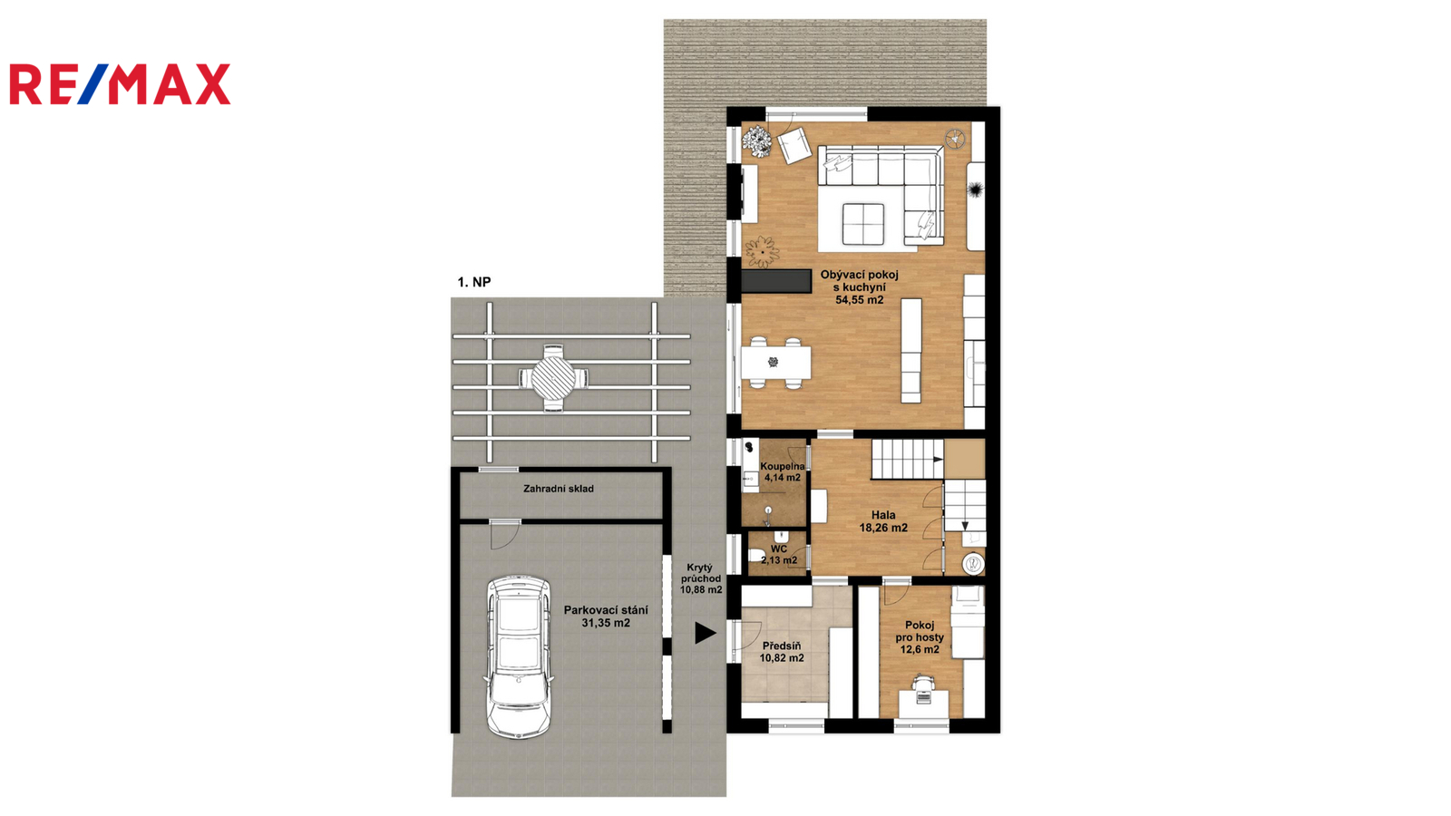 V 1. NP je k dispozici zádveří, vstupní hala, obývací pokoj s kuchyní a jídelním koutem, pokoj pro hosty, koupelna se sprchovým koutem a samostatná toaleta.