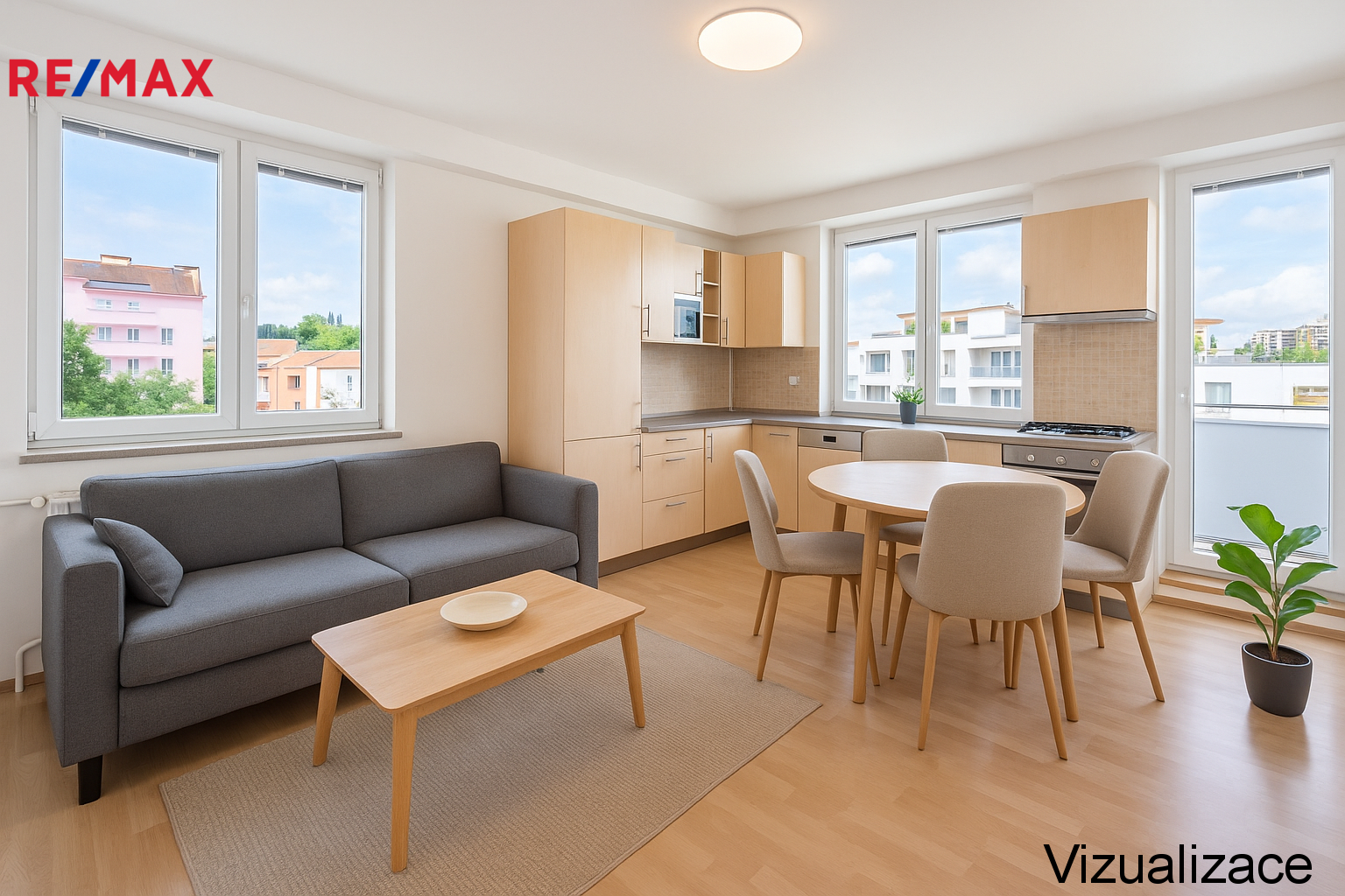 Součástí bytu jsou dva balkony a samostatná spíž, která poskytuje praktický úložný prostor. Kuchyňská linka je vybavena lednicí s mrazákem, myčkou, mikrovlnkou, plynovým sporákem a troubou. Ohřev vody a vytápění zajišťuje plynový kotel BAXI, což umožňuje efektivní a individuální regulaci spotřeby.