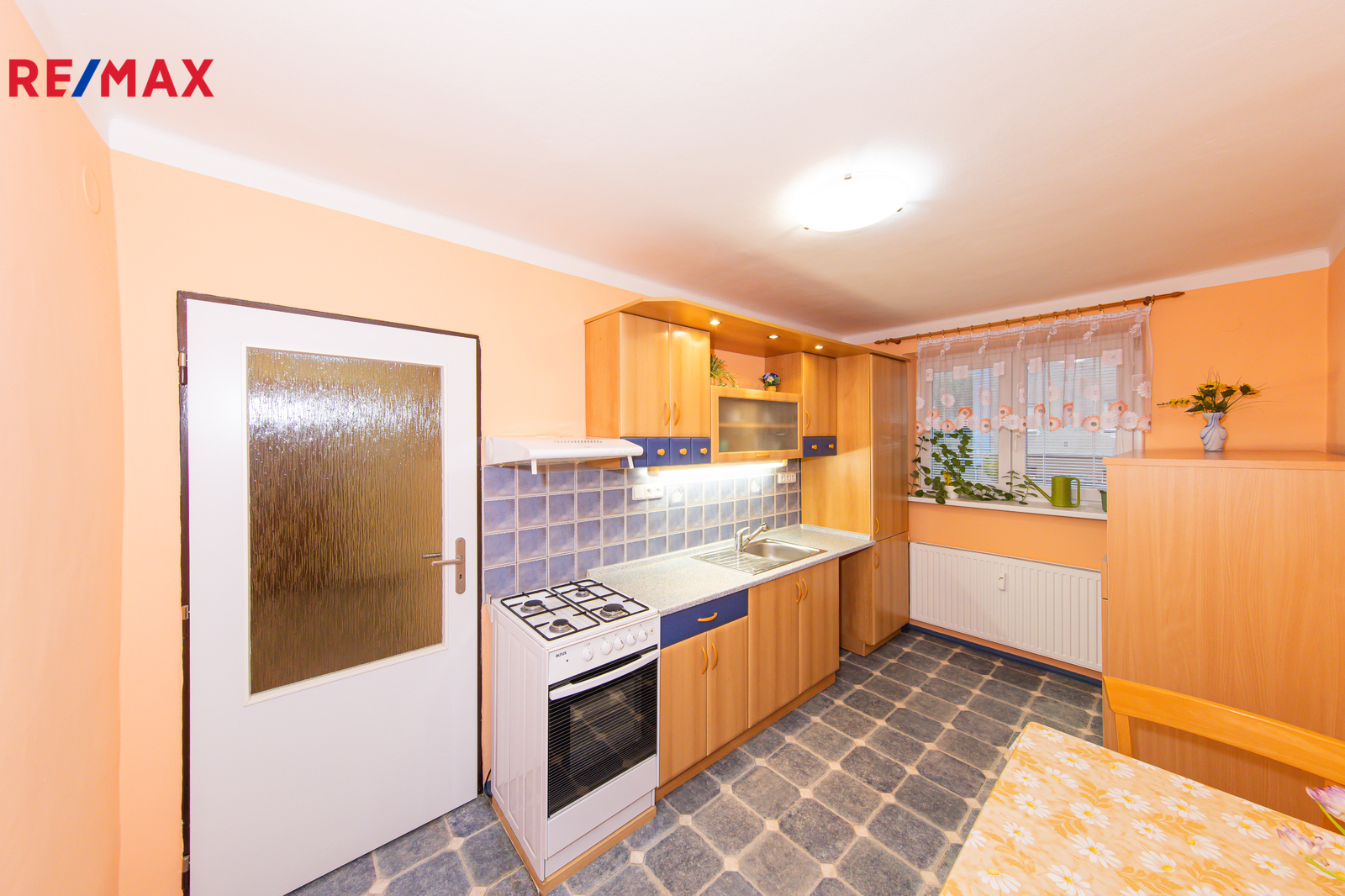 Okna kuchyně vedou na západní stranu, okna dvou dalších pokojů na stranu východní. Součástí kuchyňské linky je kombinovaný plynový sporák s elektrickou troubou a digestoř, najdete zde i základní jídelní set a kuchynské náčiní.