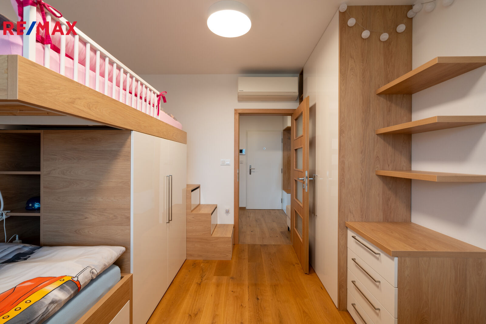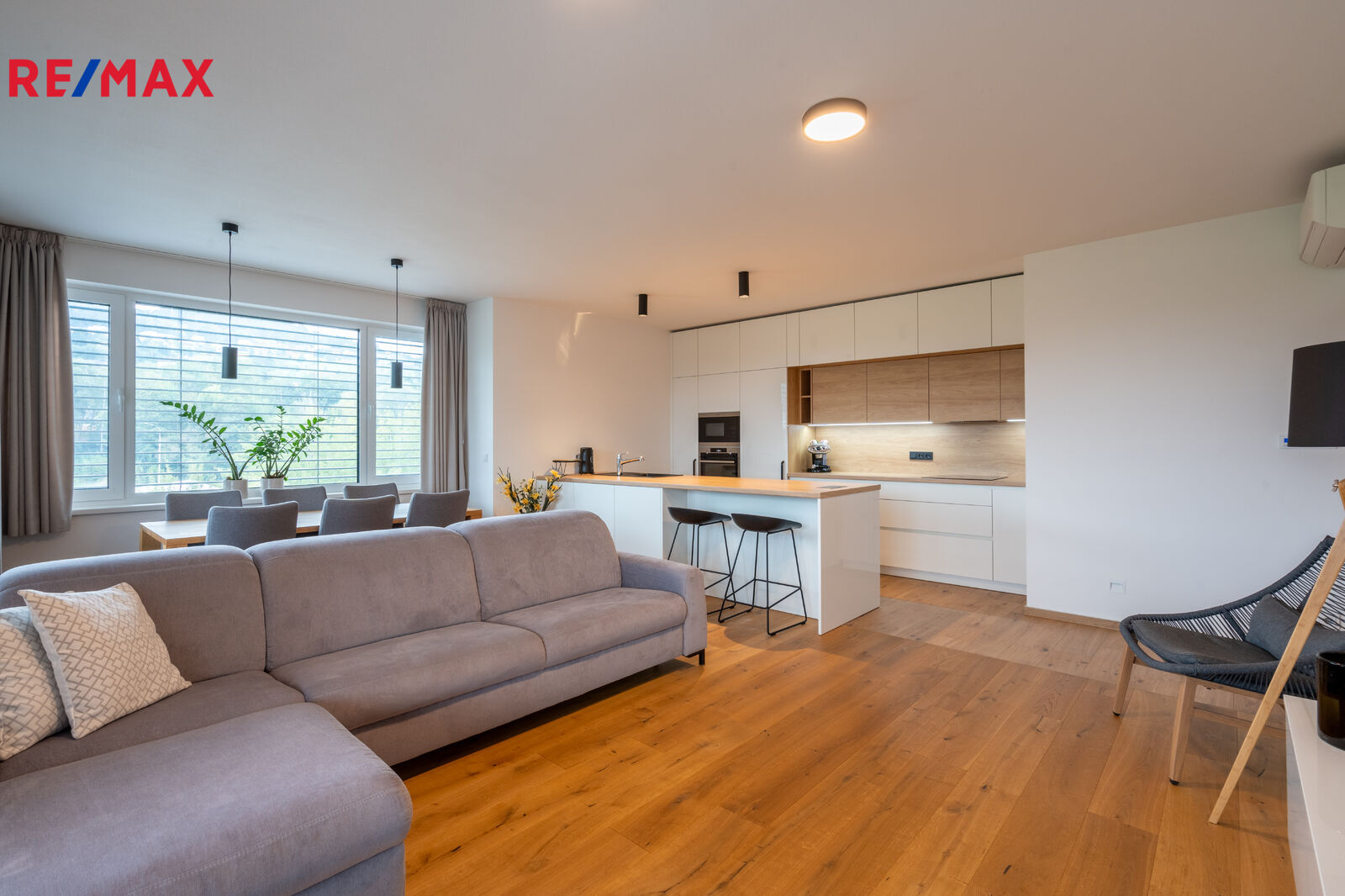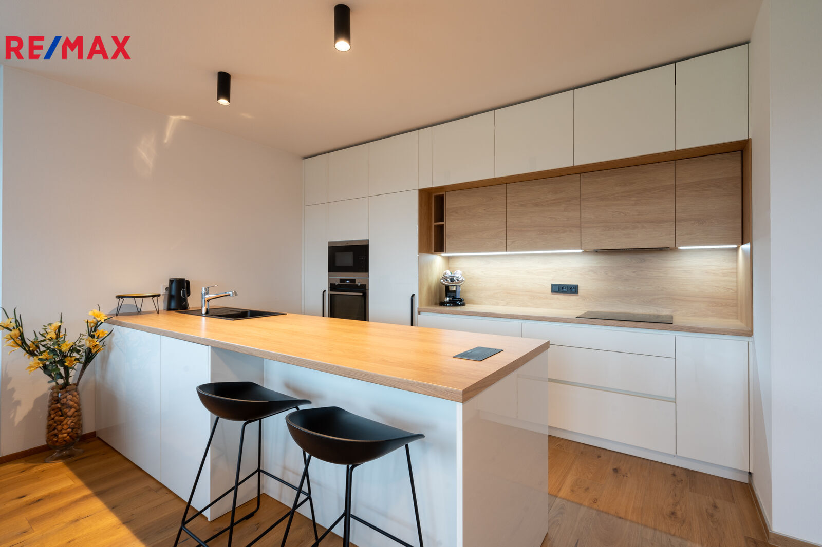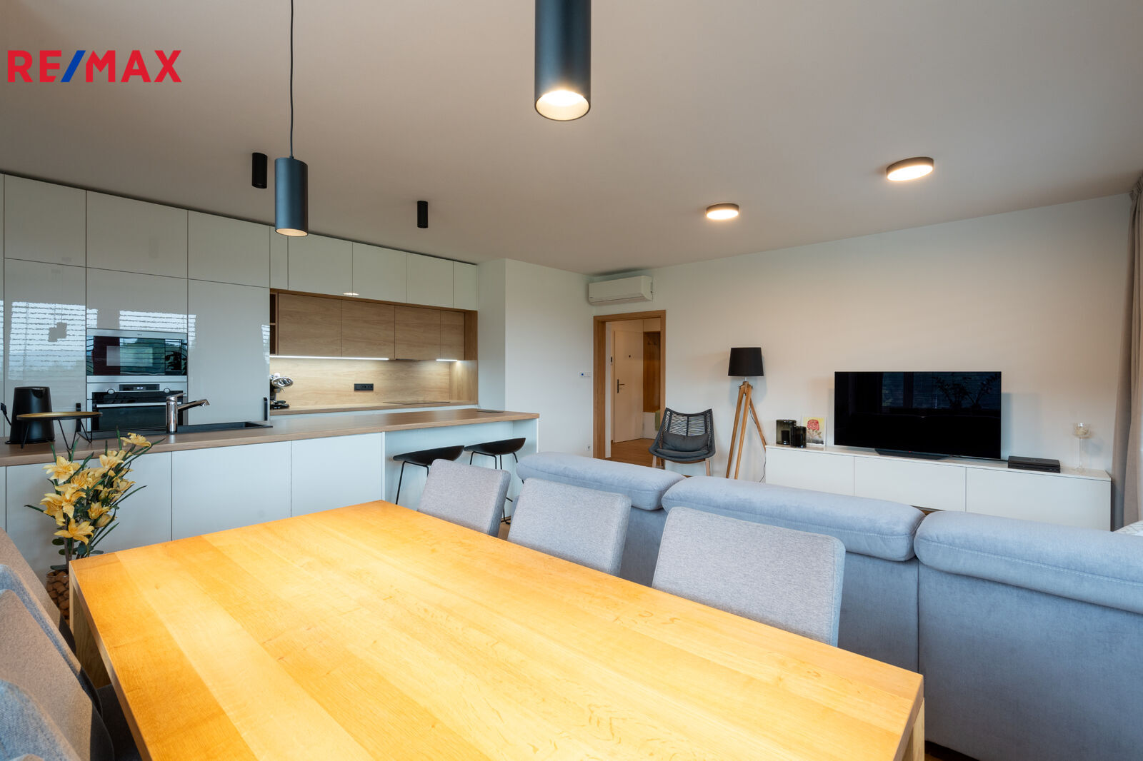 Další dominantou bytu je prostorný obývací pokoj s kuchyní, která zde byla vyrobena na míru, v podstatě jako zbytek vybavení bytu. Byt je vybaven podlahovým topením, třemi vnitřními jednotkami klimatizace, pračkou, sušičkou a kompletním vybavením, které vidíte na fotografiích.
