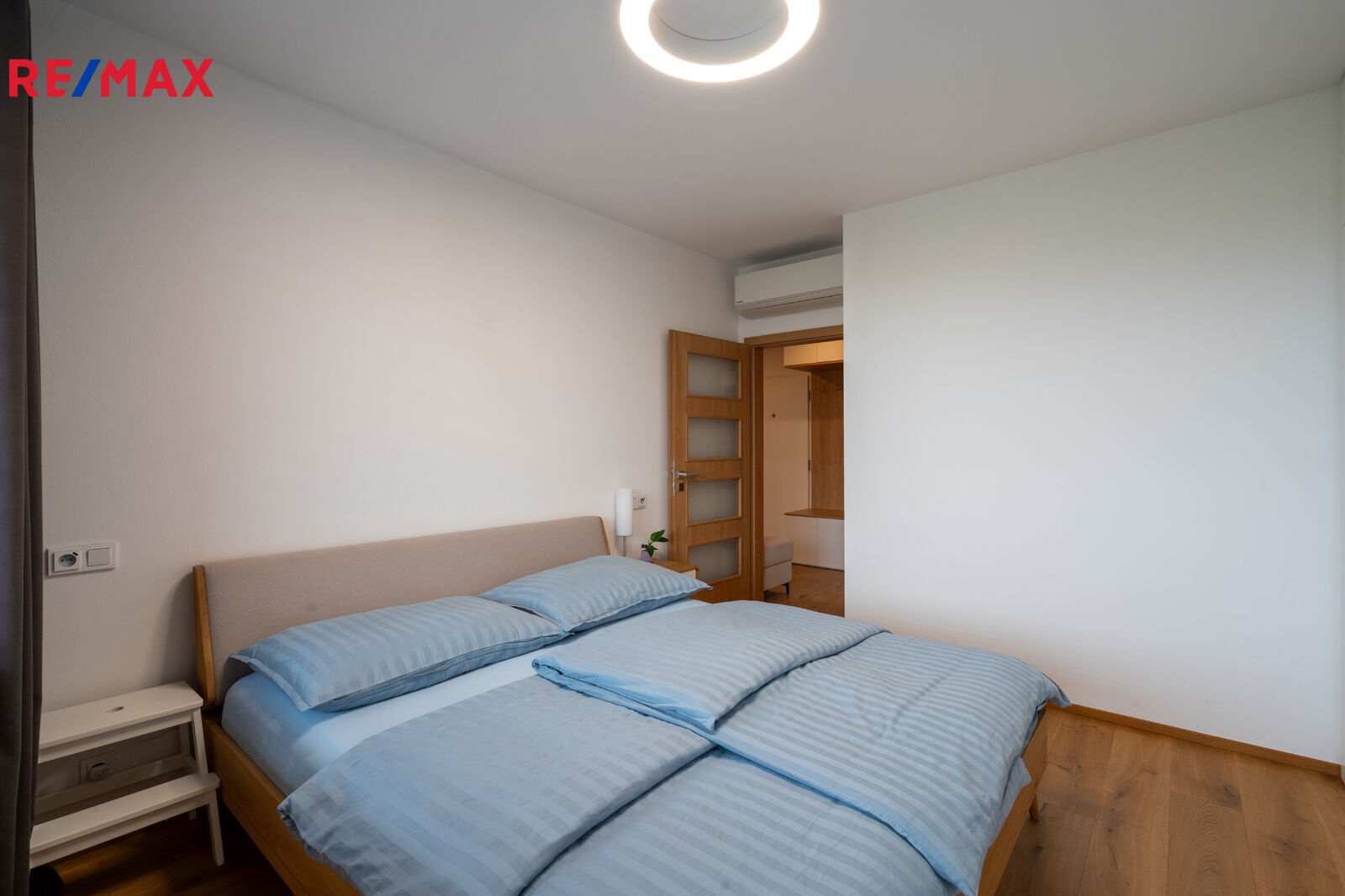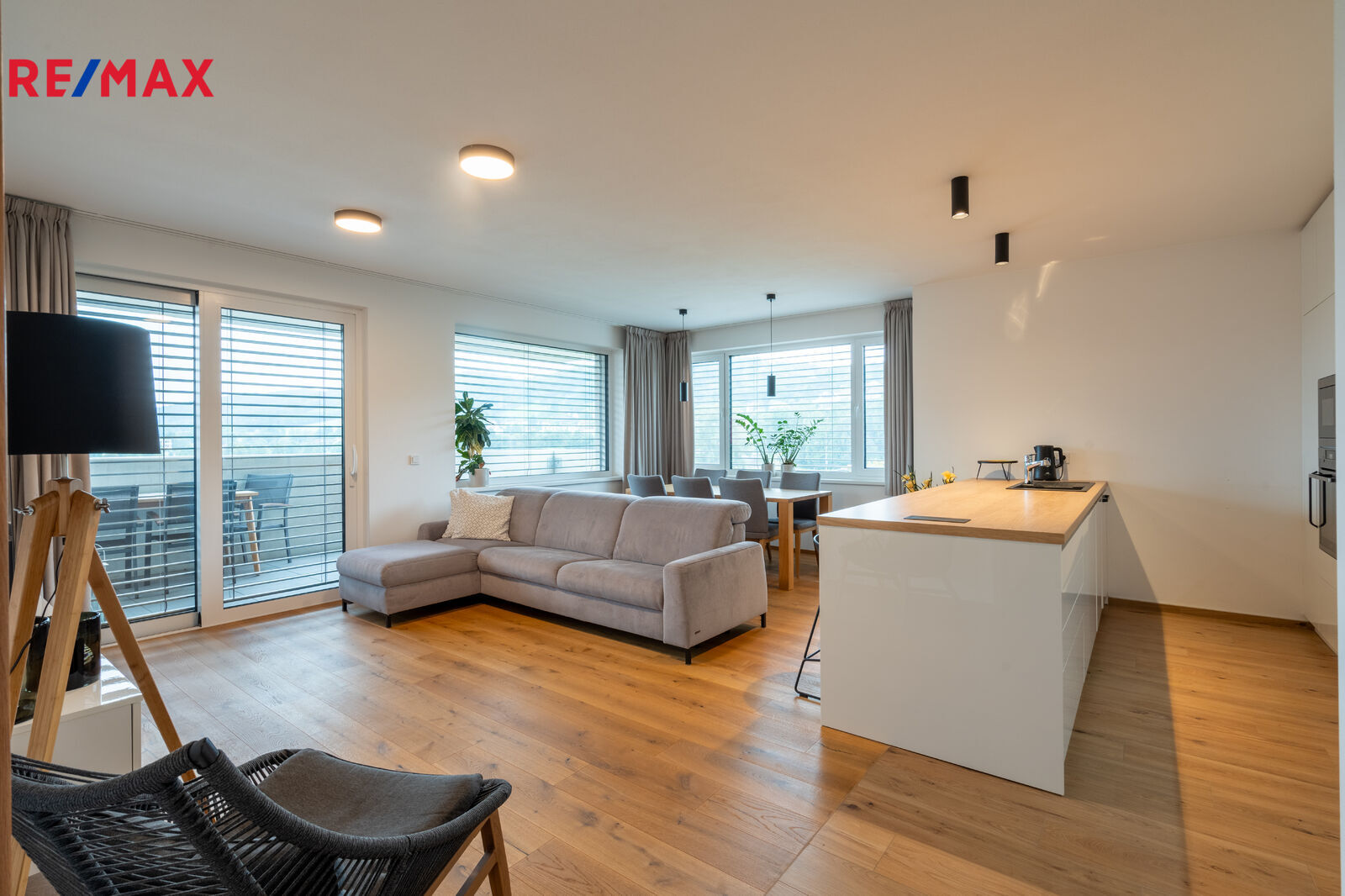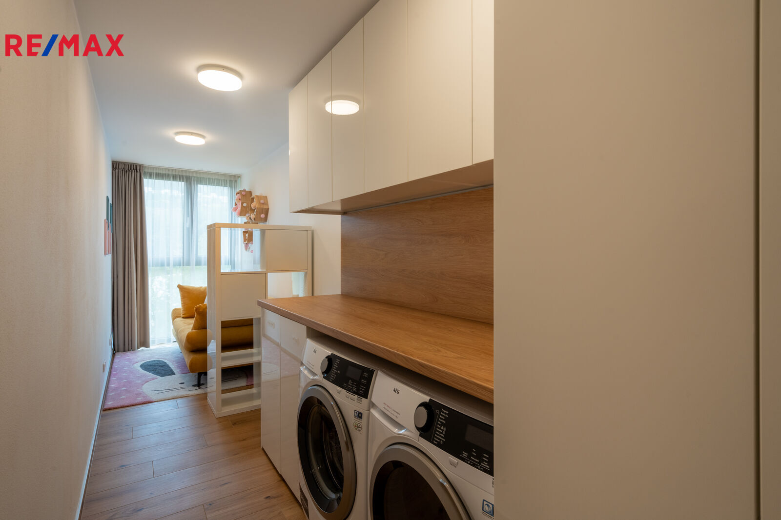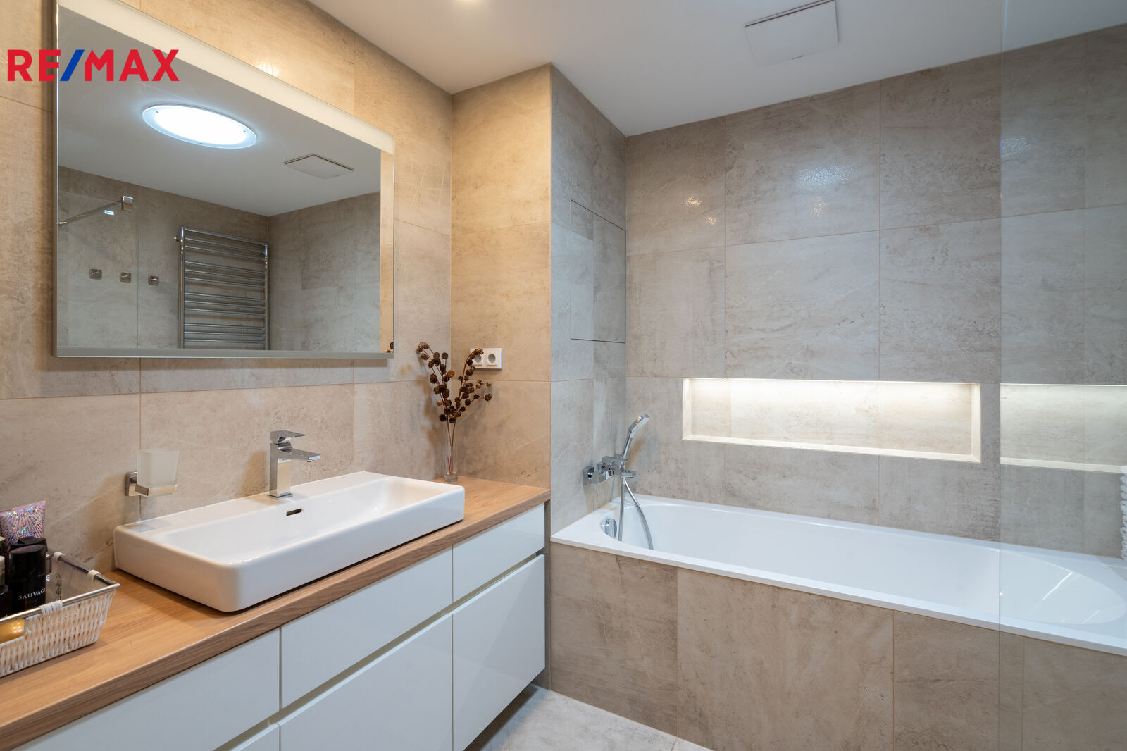 Další dominantou bytu je prostorný obývací pokoj s kuchyní, která zde byla vyrobena na míru, v podstatě jako zbytek vybavení bytu. Byt je vybaven podlahovým topením, třemi vnitřními jednotkami klimatizace, pračkou, sušičkou a kompletním vybavením, které vidíte na fotografiích.