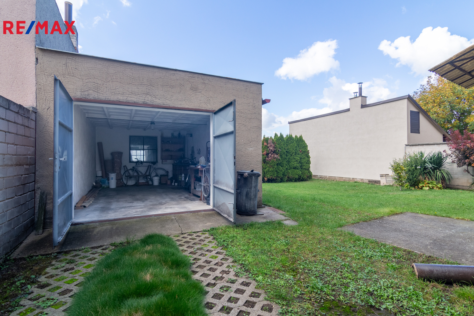 Za domem se nachází samostatně stojící garáž a zděný přístavek na nářadí a zahradní nábytek. Jihozápadně orientovaná zahrada poskytuje dostatek světla pro opalování, pěstování nebo instalaci bazénu.