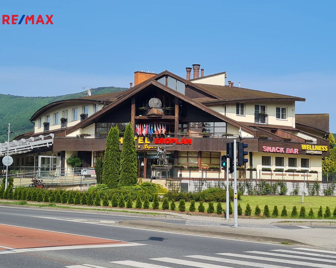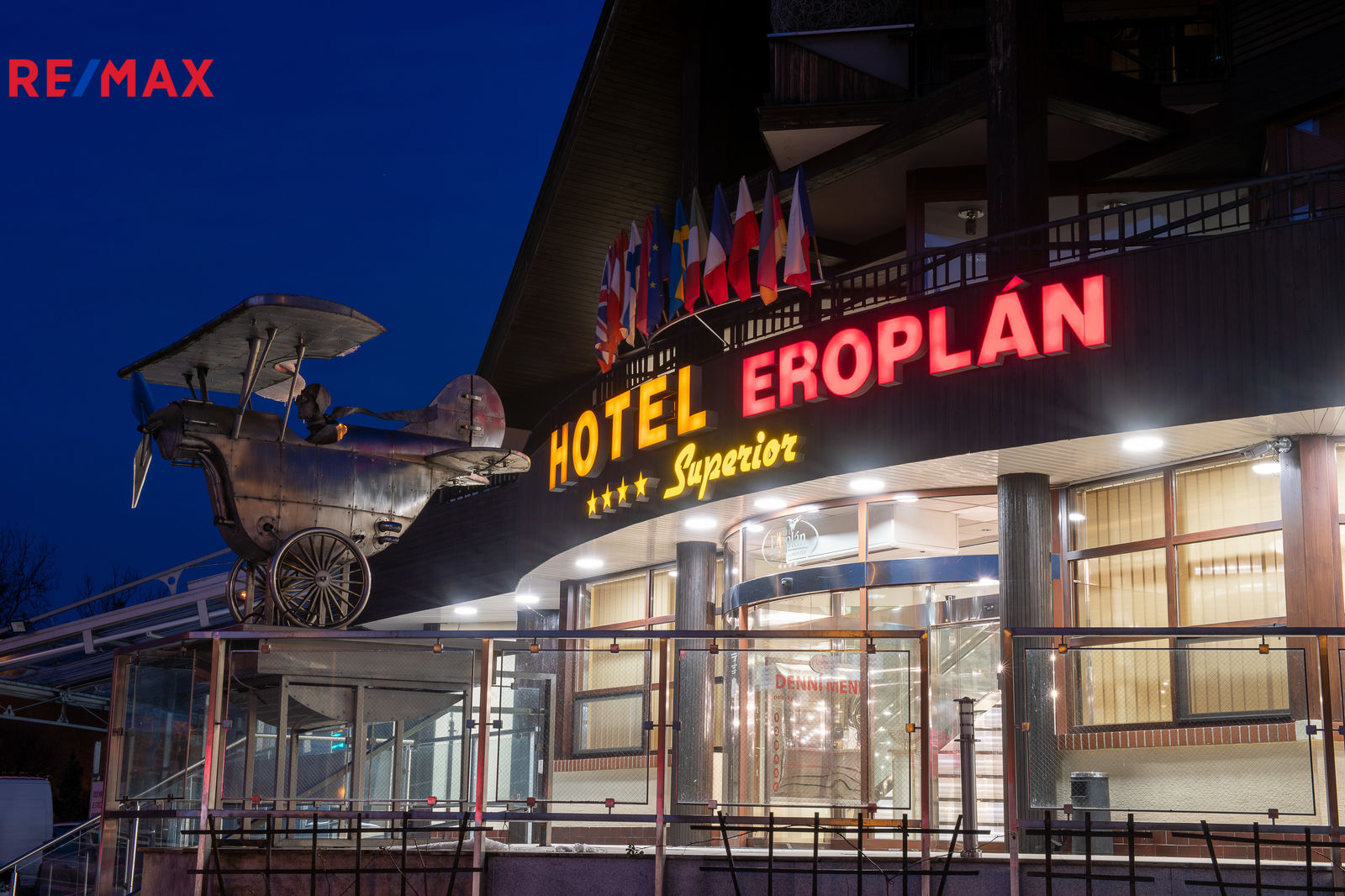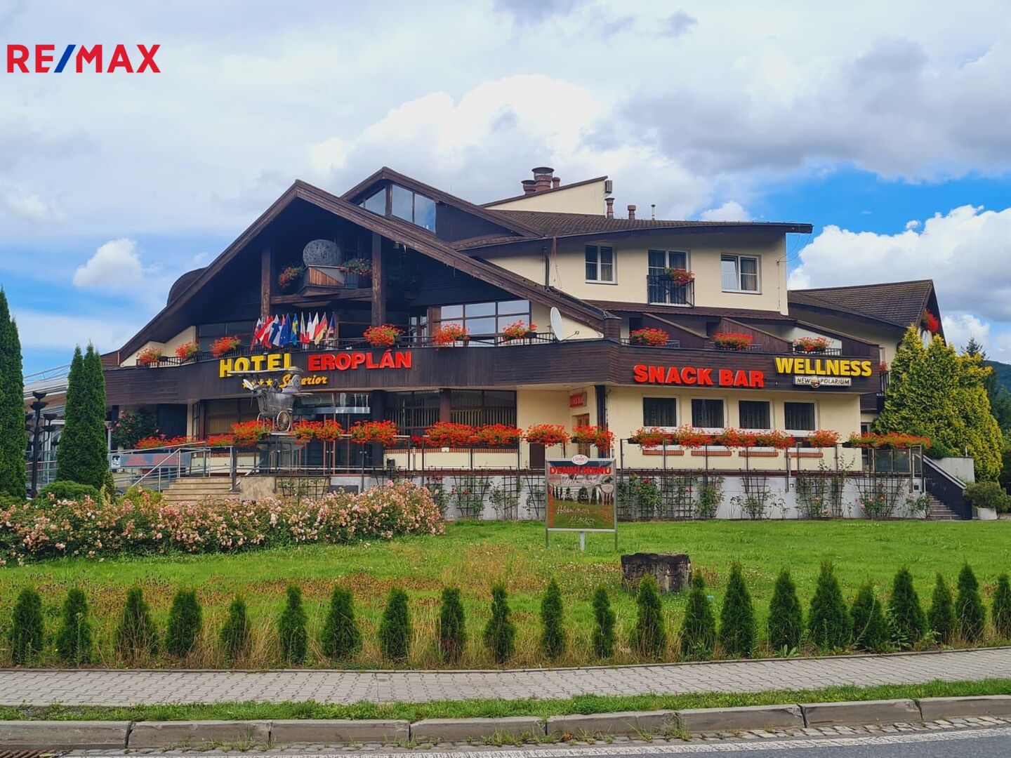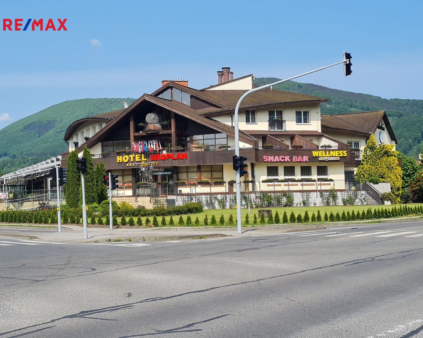 Nabízíme ve výhradním zastoupení majitele k prodeji luxusní čtyřhvězdičkový hotel Eroplán, který se nachází na okraji malebného lázeňského městečka Rožnov pod Radhoštěm na úpatí hory Radhošť, v srdci Valašska a Beskyd. Tato lokalita je oblíbenou turistickou destinací jak v létě, tak i v zimě. Statisíce turistů navštěvuje každoročně Valašské muzeum v přírodě a Dřevěné městečko v Rožnově pod Radhoštěm. Na nejznámější vrchol Pustevny s oblíbenou stezkou ve větvích Valaška nezapomene žádný z návštěvníků této oblasti. Ideální běžkařské podmínky a deset ski areálů v blízkosti, využívají každoročně tisíce vyznavačů zimních sportů. Potencionální klienty jsou také milovníci cyklistiky a golfu. Golfové 9-ti jamkové hřiště s celkovou délkou 2 250m leží ve vzdálenosti cca 2km od hotelu. Cyklostezka v těsné blízkosti hotelu vede 160km dlouhou, převážně vzrostlou zelení, kolem řeky Bečvy. Vlastní půjčovna horských kol umožnuje hostům prozkoumat i další okolí. Děti uvítají krásně zrekonstruované koupaliště, zábavní centrum Gibon park s množstvím atrakcí, bowling a tenisové kurty. Vše v pár minutovém pěším dosahu. Samotný hotel byl kompletně nově vybudován a znovu slavnostně otevřeném v roce 1992 a stal se oblíbeným, vyhlášeným a jedním z nejznámějších hotelů nejen v Rožnově, ale celé České republice i zahraničí. Vždy krásně upravené okolí a kovová maketa Eroplánu před vstupem do hotelu, vítá příchozí, kolemjdoucí i projíždějící hosty k návštěvě. Hotel je strategicky umístěn na hlavním tahu k hraničnímu přechodu na Slovensko – Makov.