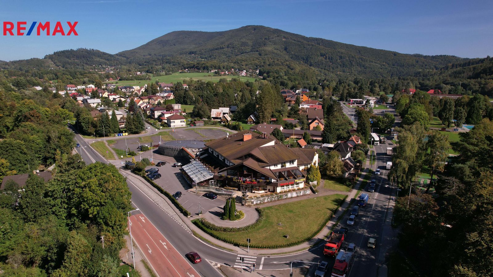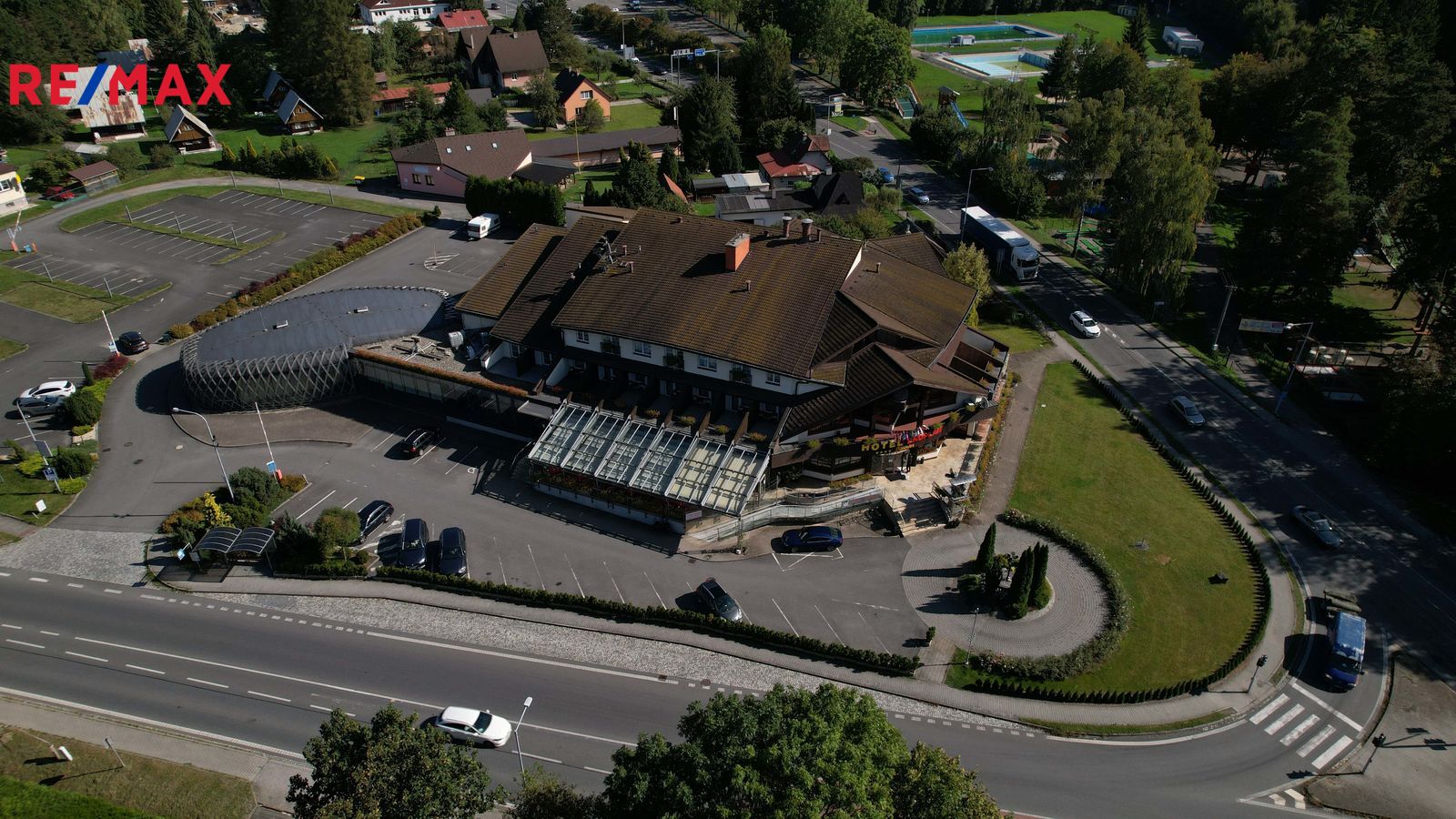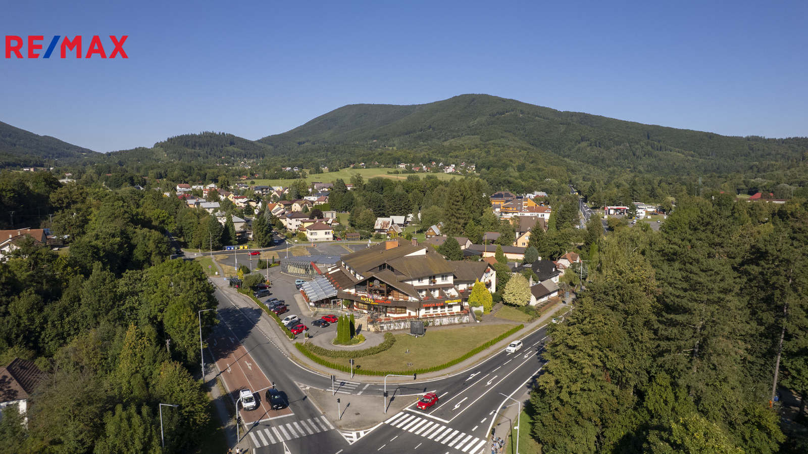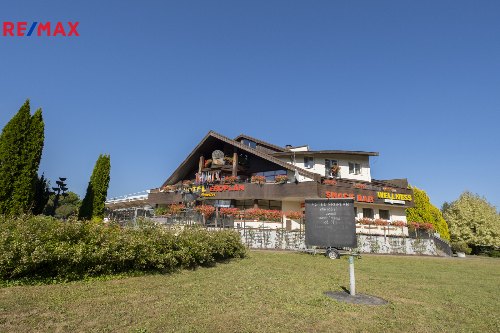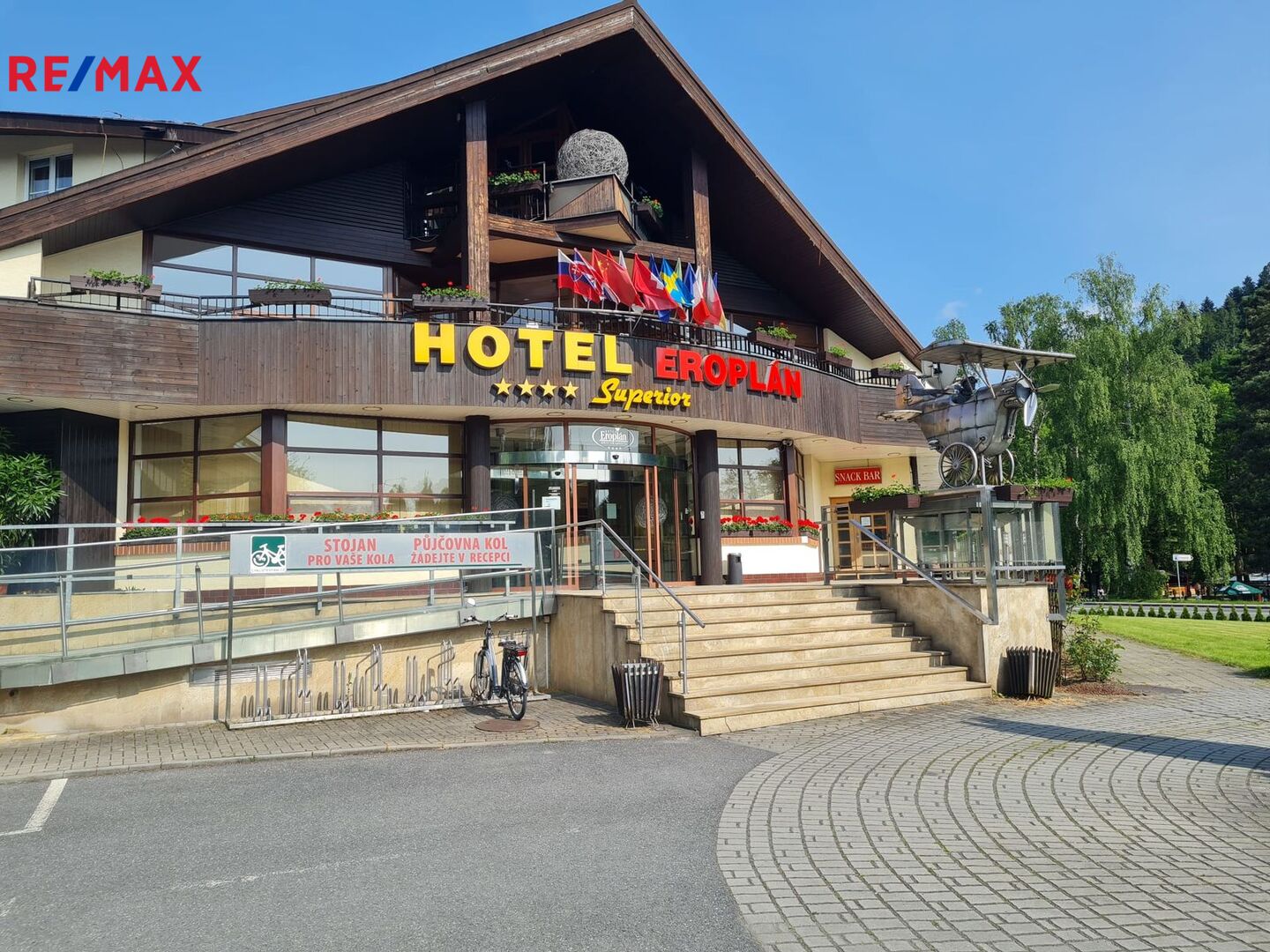 Nabízíme ve výhradním zastoupení majitele k prodeji luxusní čtyřhvězdičkový hotel Eroplán, který se nachází na okraji malebného lázeňského městečka Rožnov pod Radhoštěm na úpatí hory Radhošť, v srdci Valašska a Beskyd. Tato lokalita je oblíbenou turistickou destinací jak v létě, tak i v zimě. Statisíce turistů navštěvuje každoročně Valašské muzeum v přírodě a Dřevěné městečko v Rožnově pod Radhoštěm. Na nejznámější vrchol Pustevny s oblíbenou stezkou ve větvích Valaška nezapomene žádný z návštěvníků této oblasti. Ideální běžkařské podmínky a deset ski areálů v blízkosti, využívají každoročně tisíce vyznavačů zimních sportů. Potencionální klienty jsou také milovníci cyklistiky a golfu. Golfové 9-ti jamkové hřiště s celkovou délkou 2 250m leží ve vzdálenosti cca 2km od hotelu. Cyklostezka v těsné blízkosti hotelu vede 160km dlouhou, převážně vzrostlou zelení, kolem řeky Bečvy. Vlastní půjčovna horských kol umožnuje hostům prozkoumat i další okolí. Děti uvítají krásně zrekonstruované koupaliště, zábavní centrum Gibon park s množstvím atrakcí, bowling a tenisové kurty. Vše v pár minutovém pěším dosahu. Samotný hotel byl kompletně nově vybudován a znovu slavnostně otevřeném v roce 1992 a stal se oblíbeným, vyhlášeným a jedním z nejznámějších hotelů nejen v Rožnově, ale celé České republice i zahraničí. Vždy krásně upravené okolí a kovová maketa Eroplánu před vstupem do hotelu, vítá příchozí, kolemjdoucí i projíždějící hosty k návštěvě. Hotel je strategicky umístěn na hlavním tahu k hraničnímu přechodu na Slovensko – Makov.