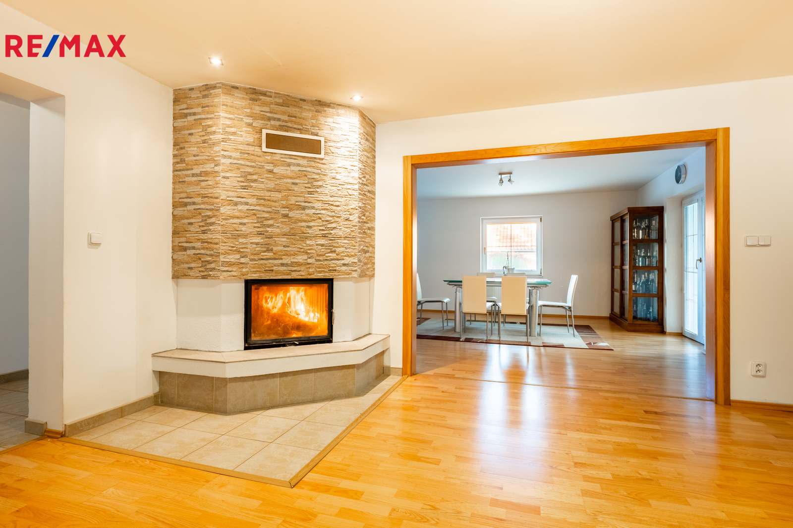 V přízemí dominuje obývák s krbem a vstupem na terasu. Praktická je jídelna s průchodem do kuchyně. V kuchyni najdete plno možností k uložení potravin nebo kuchyňského vybavení. Je zde sporák s digestoří, horkovzdušná trouba, lednice a myčka nádobí. Za zmínku také stojí velká pracovní plocha a barový pult se židličkami.