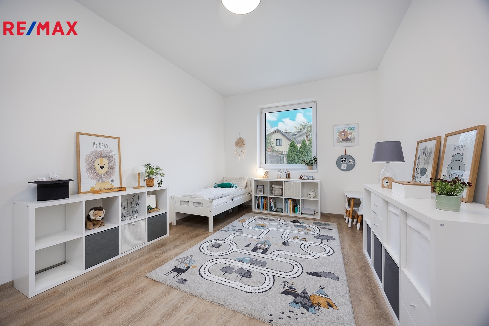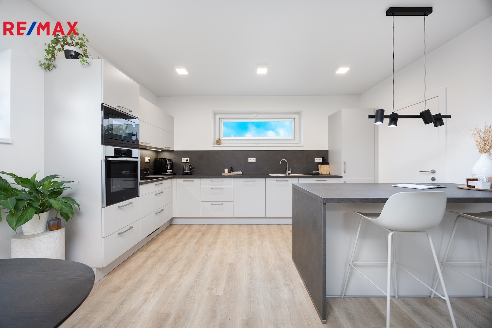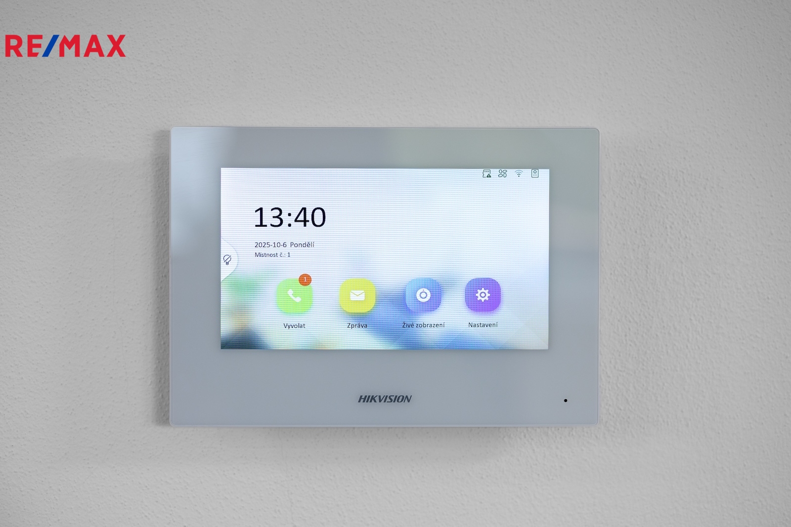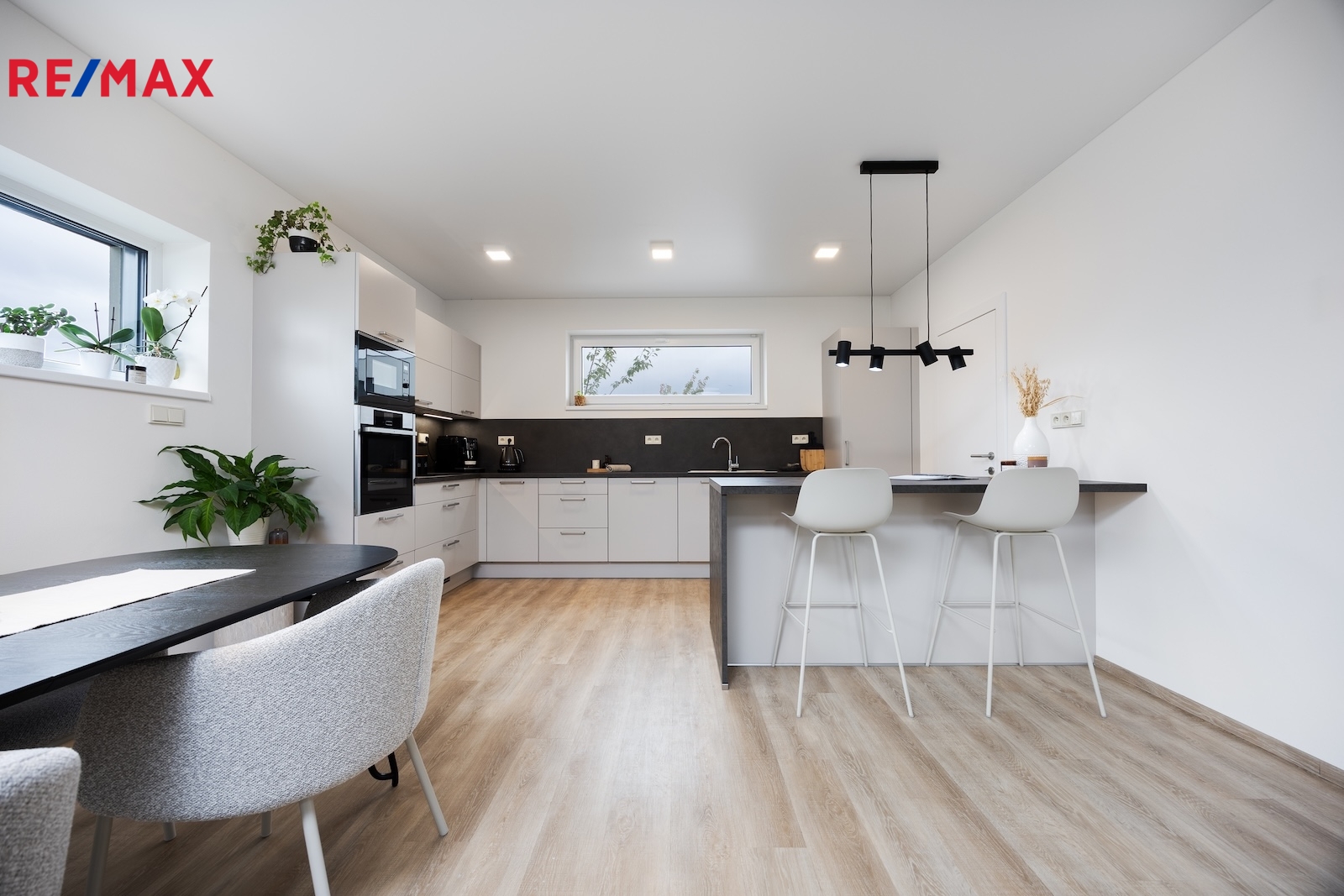 Dominantou domu je světlý obývací pokoj s kuchyní a přímým vstupem na terasu. K dispozici jsou tři samostatné ložnice, koupelna s vanou i sprchovým koutem, dvě samostatné toalety, praktická spíž a technická místnost. Dům je vybaven moderními technologiemi – teplovodním podlahovým vytápěním poháněným tepelným čerpadlem vzduch–voda, klimatizací, fotovoltaikou, venkovními žaluziemi a chytrou domácností s dálkovým ovládáním vstupu, topení i alarmu. Samozřejmostí je kamerový systém, brána na dálkové ovládání a vestavěné úložné prostory. Díky energeticky úspornému provozu se aktuální náklady na elektřinu a vytápění pohybují kolem 2 700 Kč měsíčně.